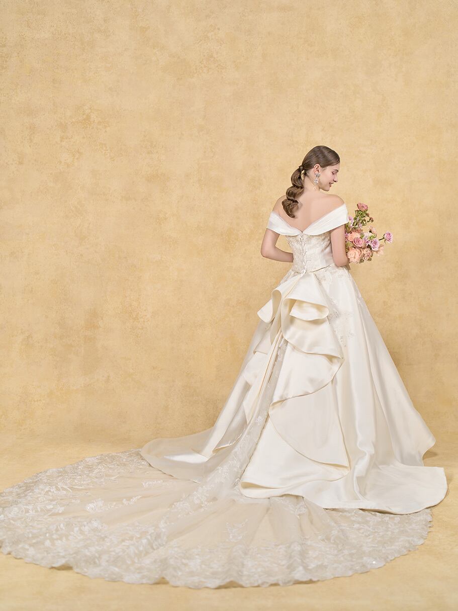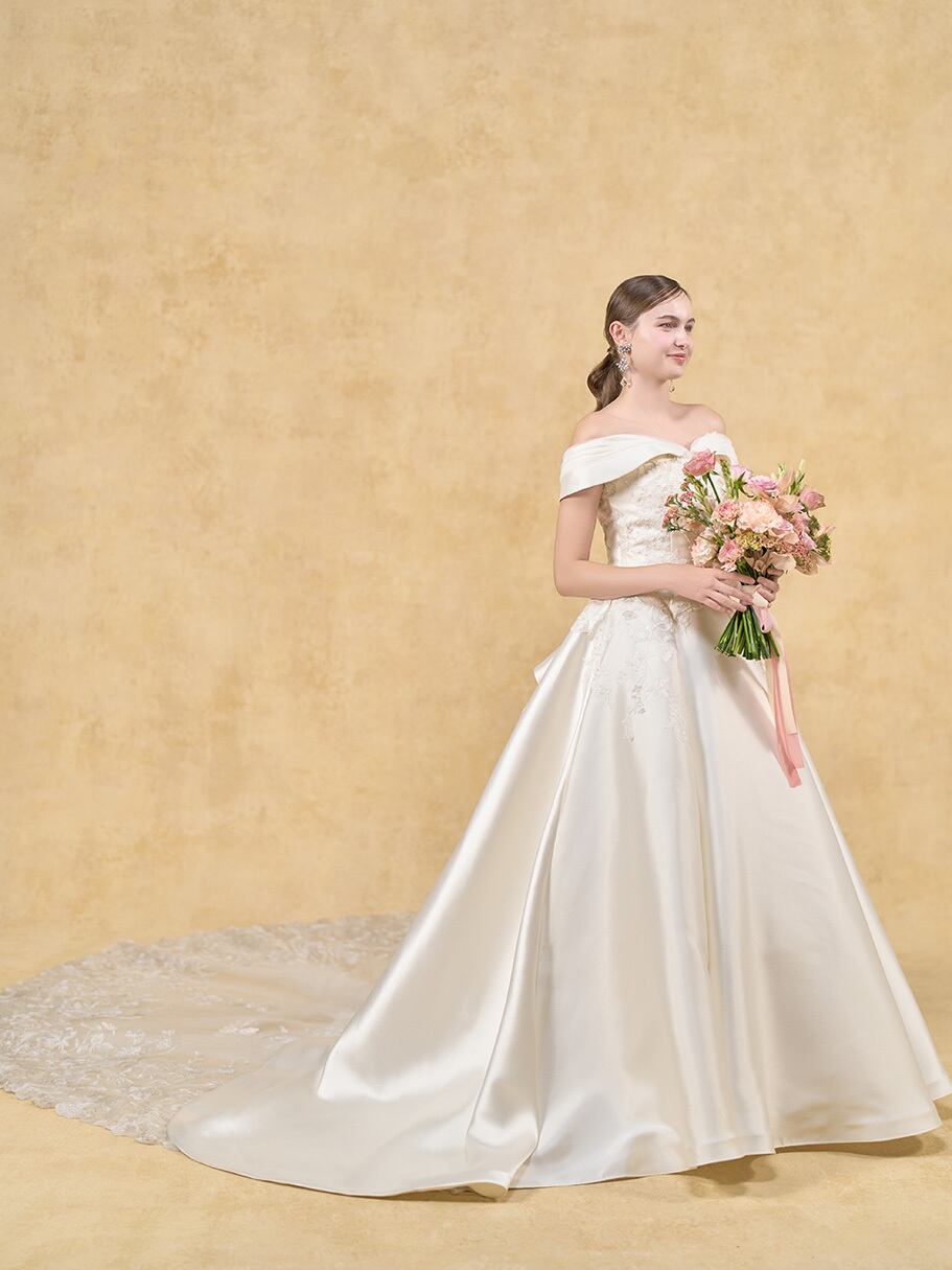 上品!シルクサテンのウエディングドレス オフショルダー フリル 総レーストレーン フォトウエディング オーダーメイド 花嫁/挙式/前撮り/春婚