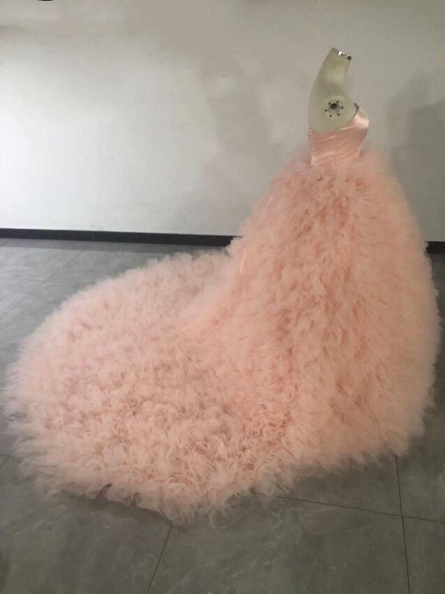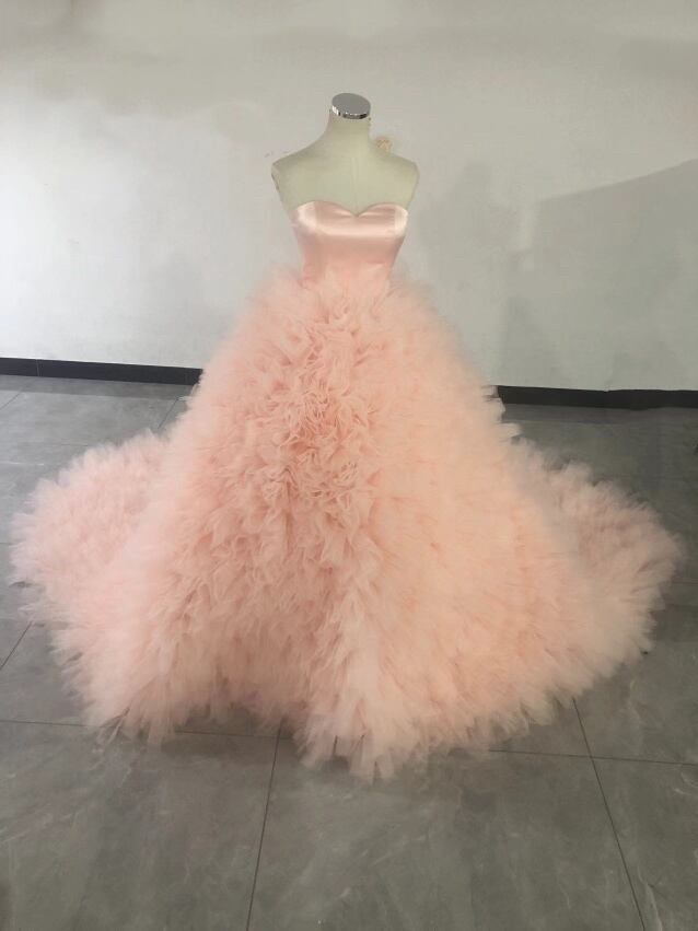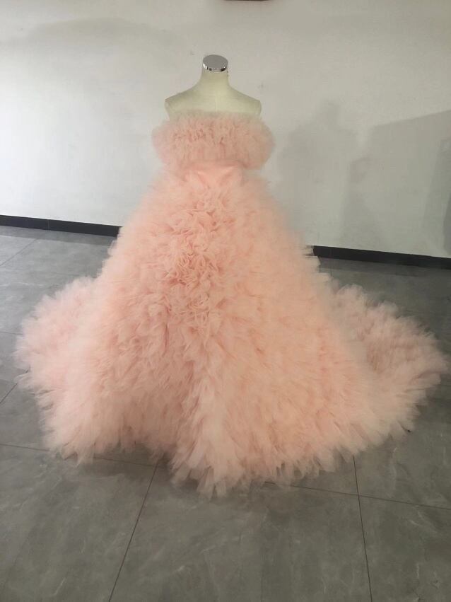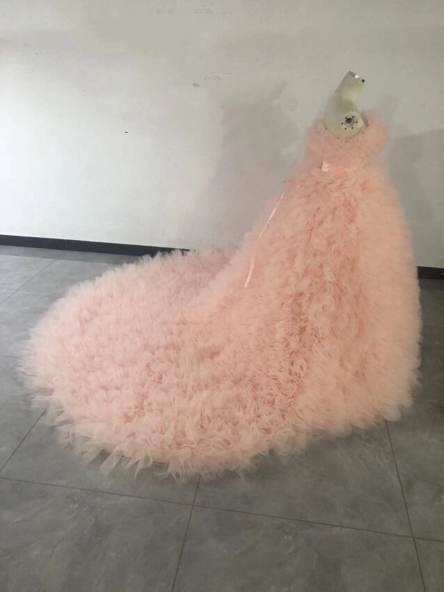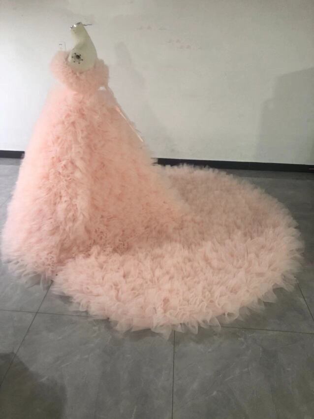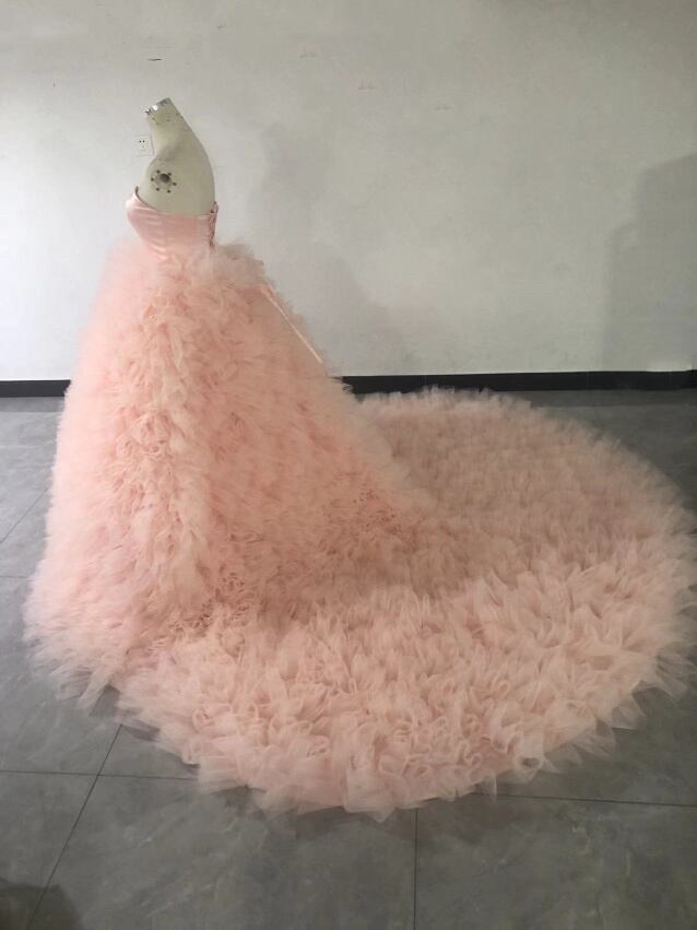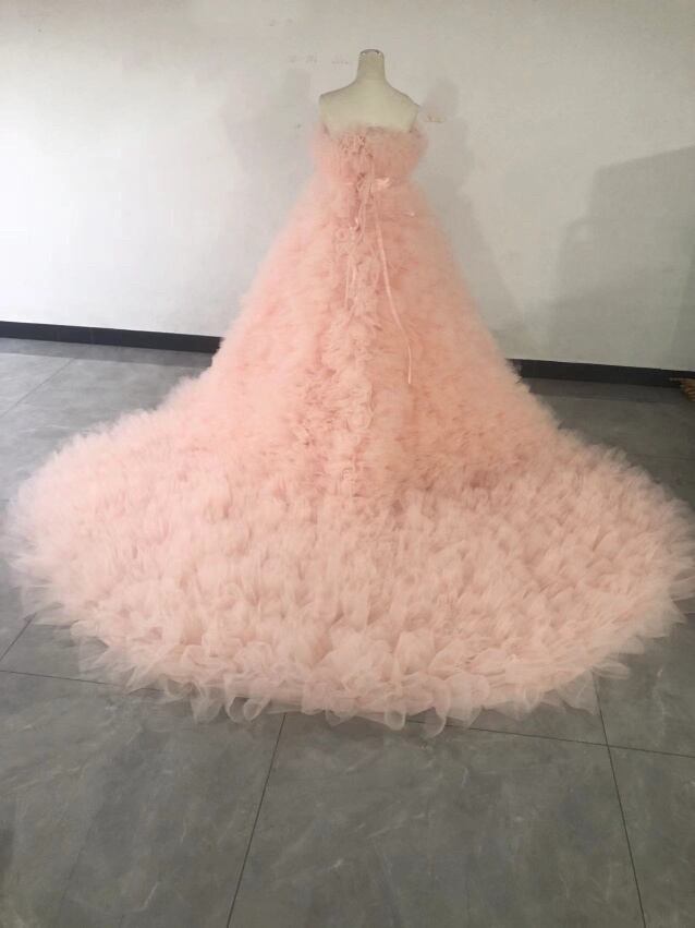 高品質!もこもこウエディングドレス 薄ピンクカラードレス 韓国風ドレス 柔らかく重ねたチュールドレス 防寒ドレス 前撮り/披露宴
