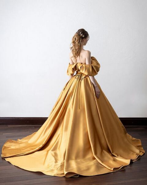 高品質!イエロー/黄色 カラードレス シルクサテンドレス マスタード色 からし色 オフショルダー ロングトレーン フォトウェディング 前撮り/コンサート【オーダーメイド】 | David1021k Dress(ダヴィドレス)