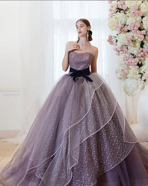 高品質!パープル/紫 カラードレス ラベンダー色/すみれ色 キラキラチュールドレス アシンメトリー キラキラ袖 トレーン フォトウェディング パーティードレス 前撮り/コンサート【オーダーメイド】