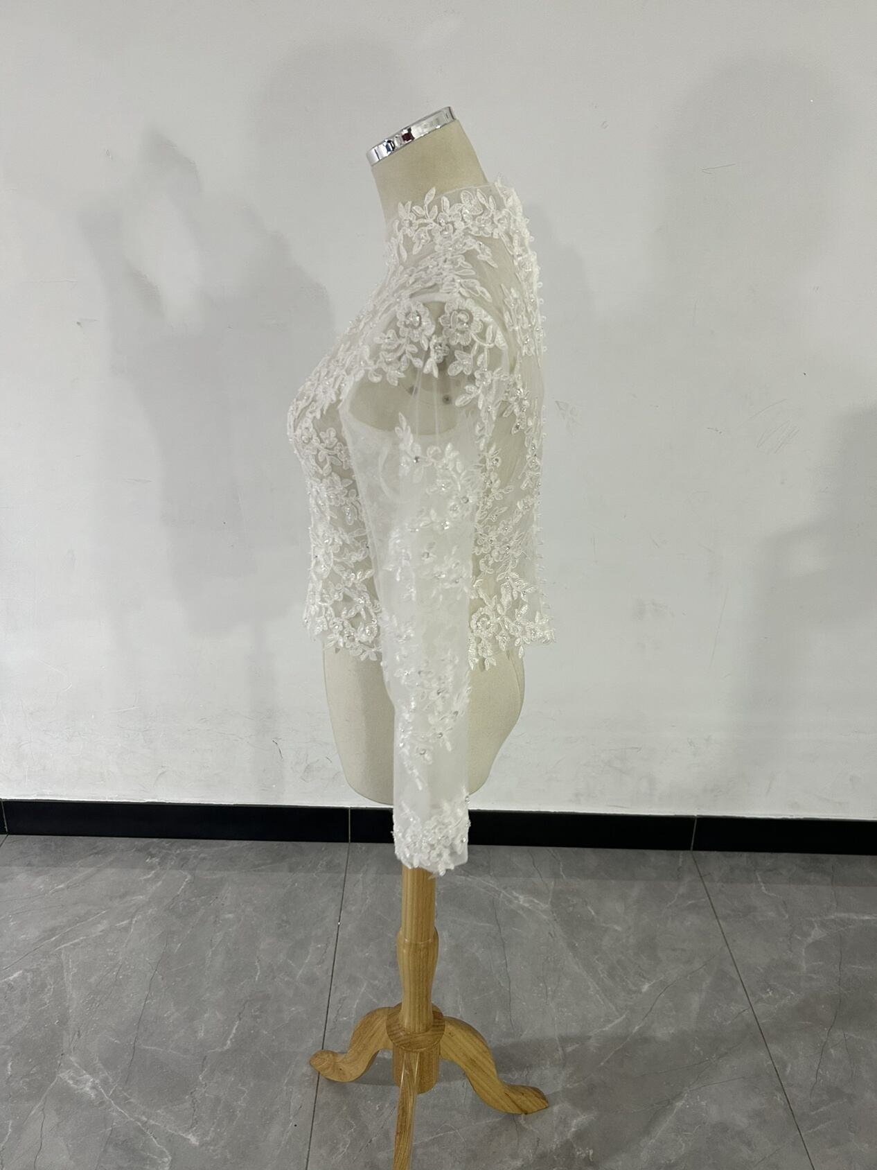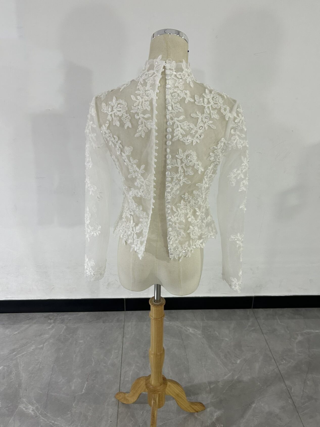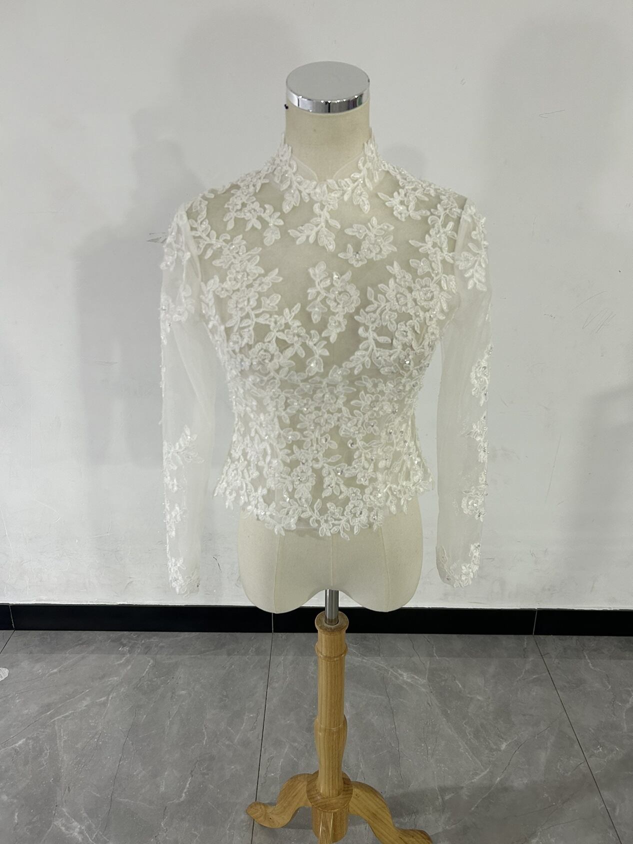 ハイネックボレロ トップス  ブラウス 上品透け袖 3D立体レース刺繍 くるみボタン 長袖