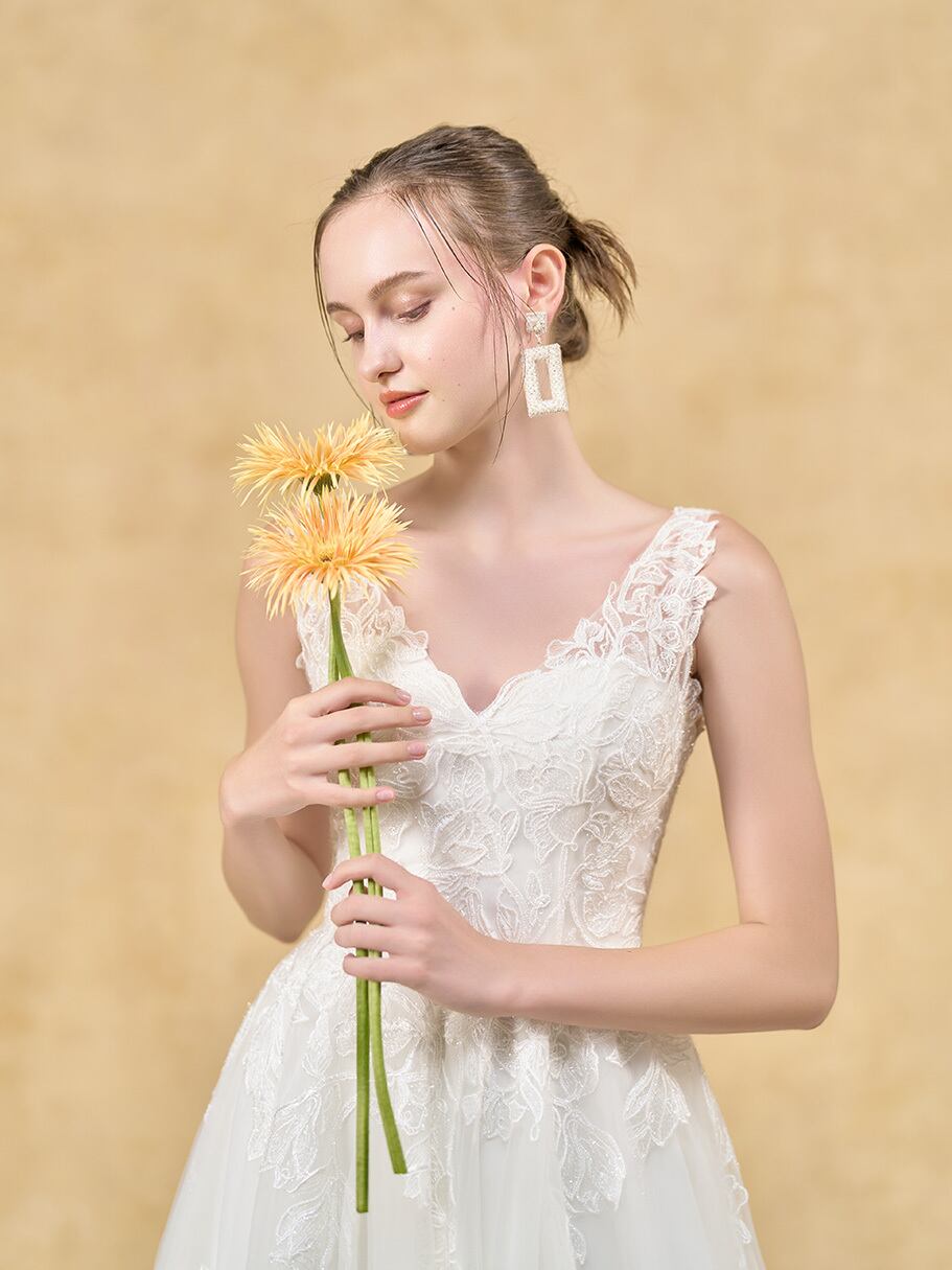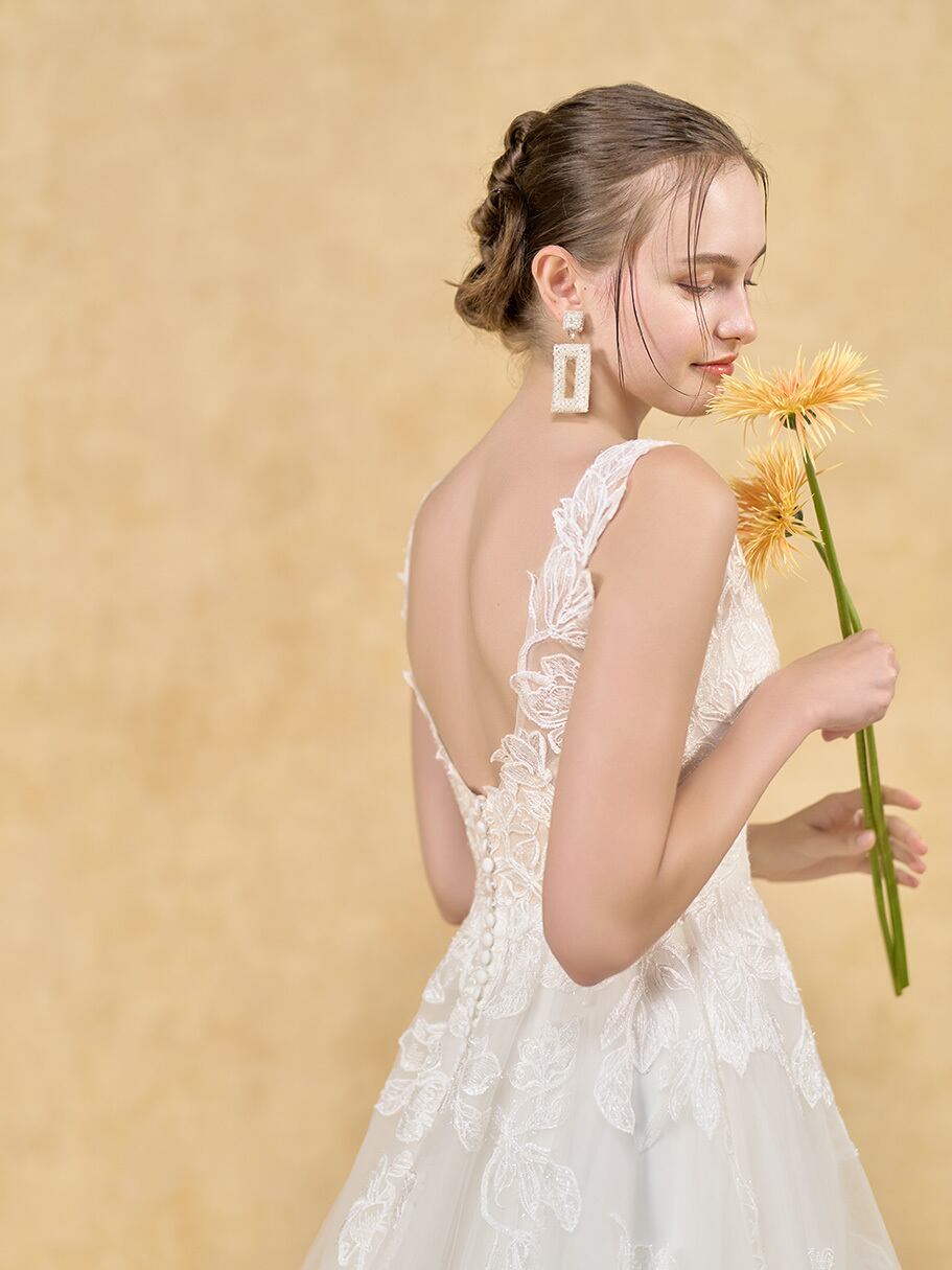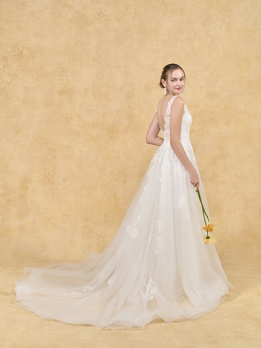 上品!花モチーフ刺繡 ウエディングドレス ノースリーブ ソフトチュール 背中見せ/バックレス ロングトレーン フォトウエディング オーダーメイド 花嫁/挙式/前撮り/春婚 | David1021k Dress(ダヴィドレス)