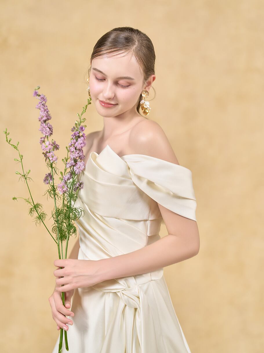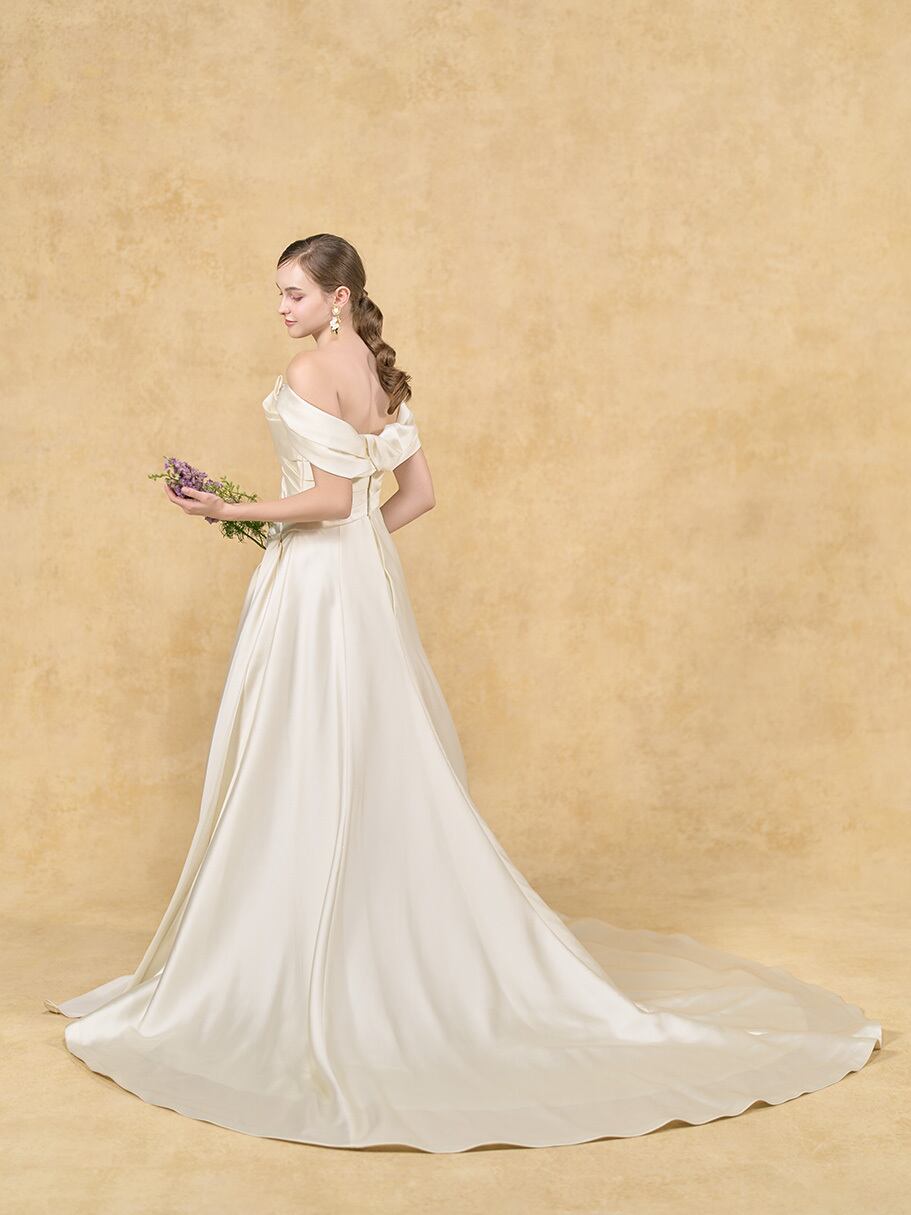 上品!ウエディングドレス 取り外しオフショルの付け袖 アシンメトリー風 シルクサテンドレス ロングトレーン オーダーメイド 花嫁/挙式/前撮り/春婚 | David1021k Dress(ダヴィドレス)