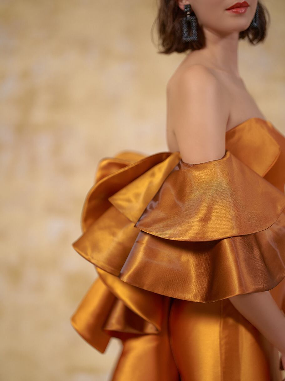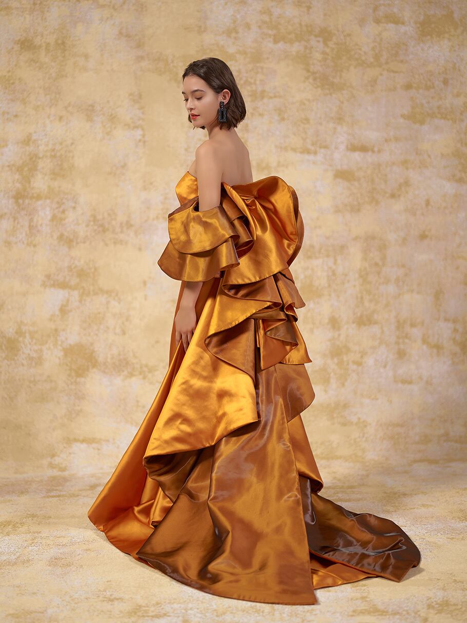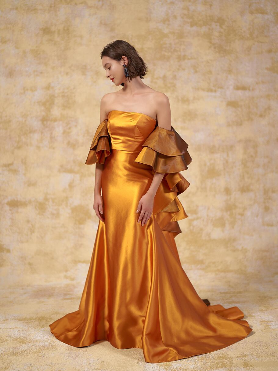 高品質!ゴールドイエロー 黄色カラードレス フリルバックリボン フリフリ付け袖 ロングトレーン ソフトマーメイドドレス パーティードレス 前撮り【オーダーメイド】