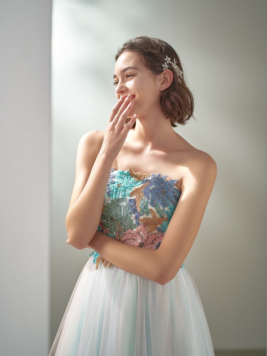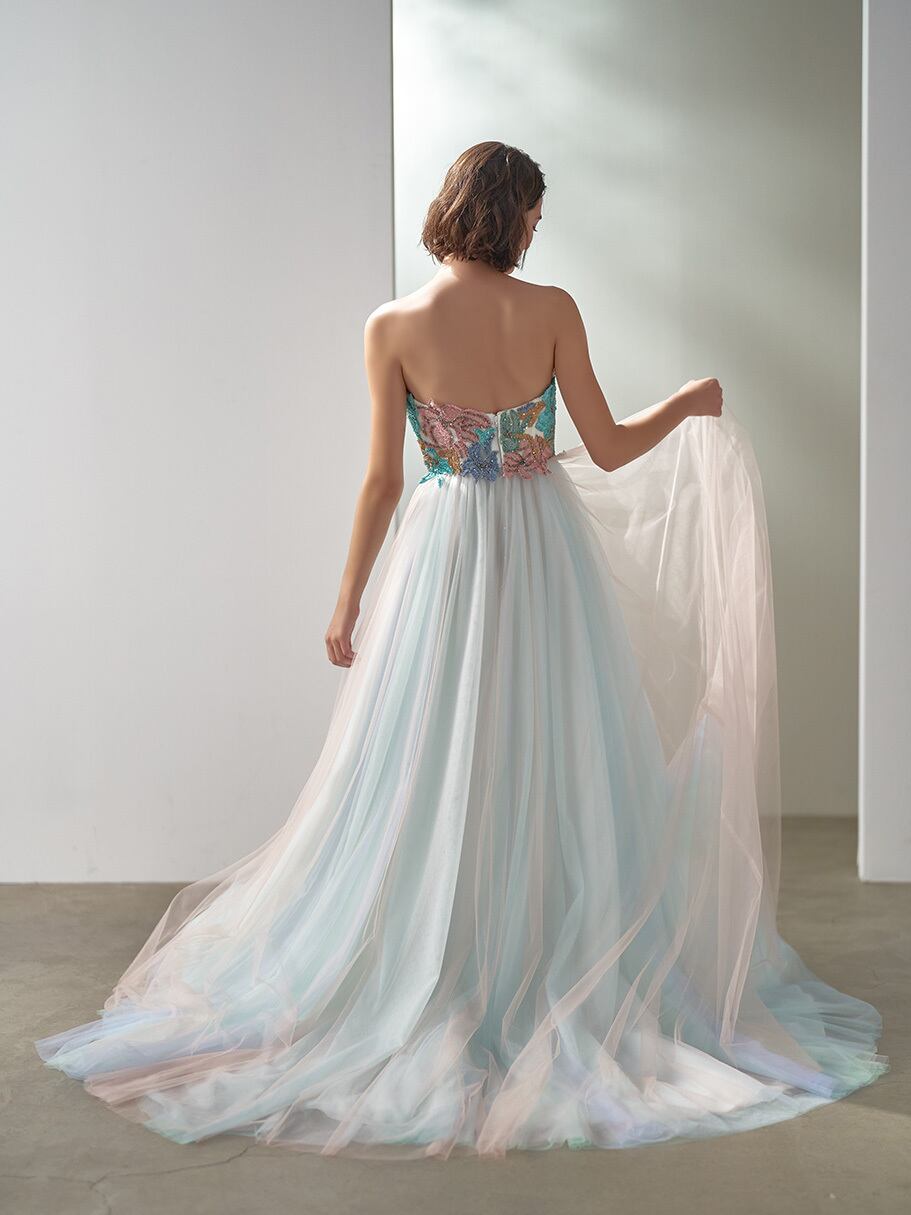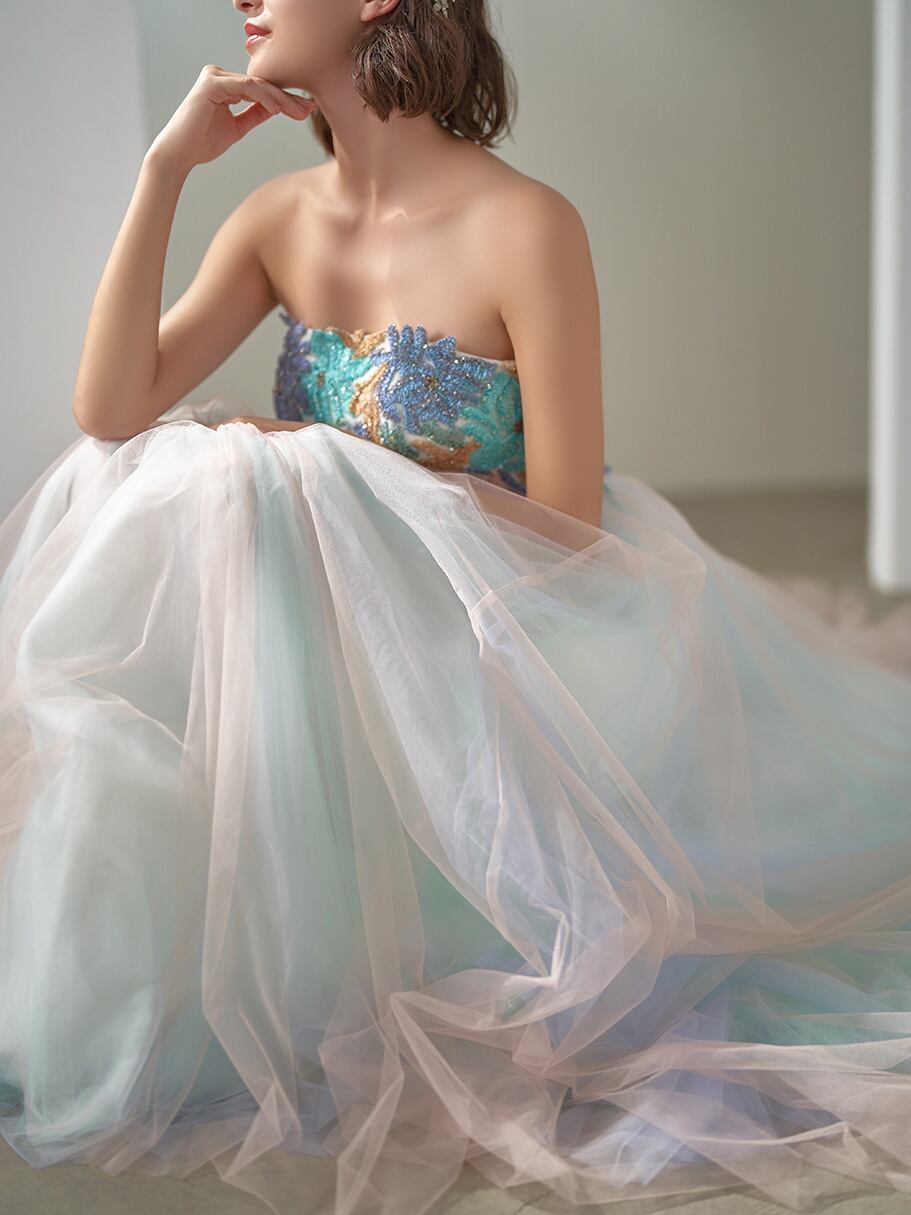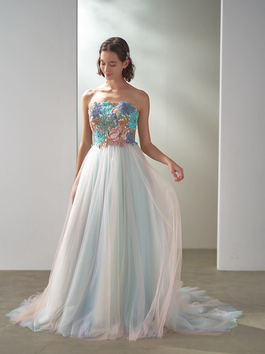 美品!花モチーフ刺繡 青色カラードレス ブルー グラデーション チュールドレス スレンダーライン エンパイアライン 妊婦ドレス ダンスドレス コンサート/前撮り | David1021k Dress(ダヴィドレス)