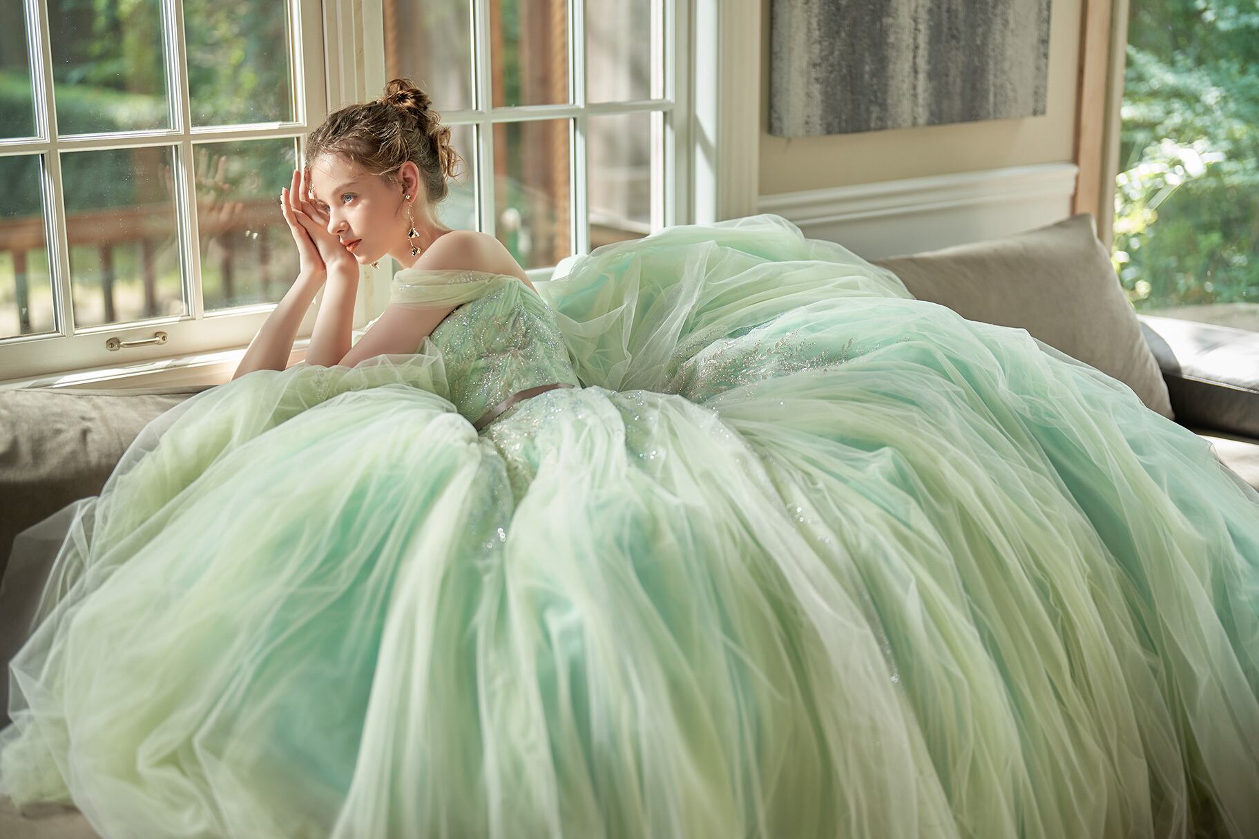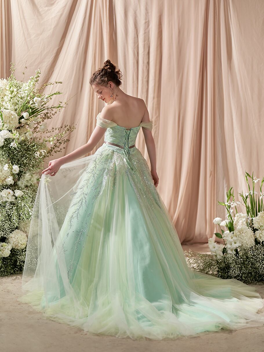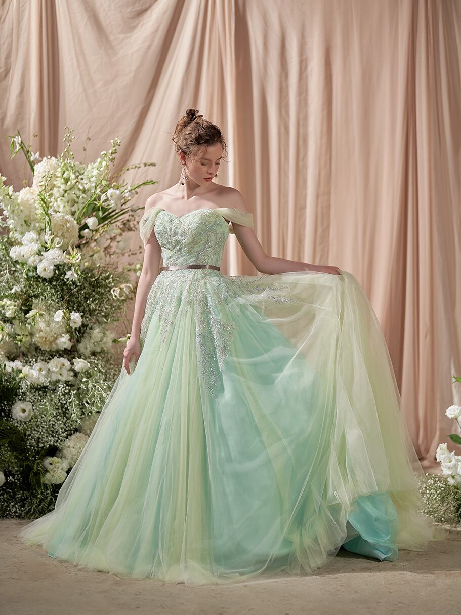 美品!ライムグリーン/ミントグリーン キラキラ枝花刺繍 緑色カラードレス チュールドレス スレンダーライン オフショルの付け袖 ダンスドレス 花嫁/コンサート/前撮り | David1021k Dress(ダヴィドレス)