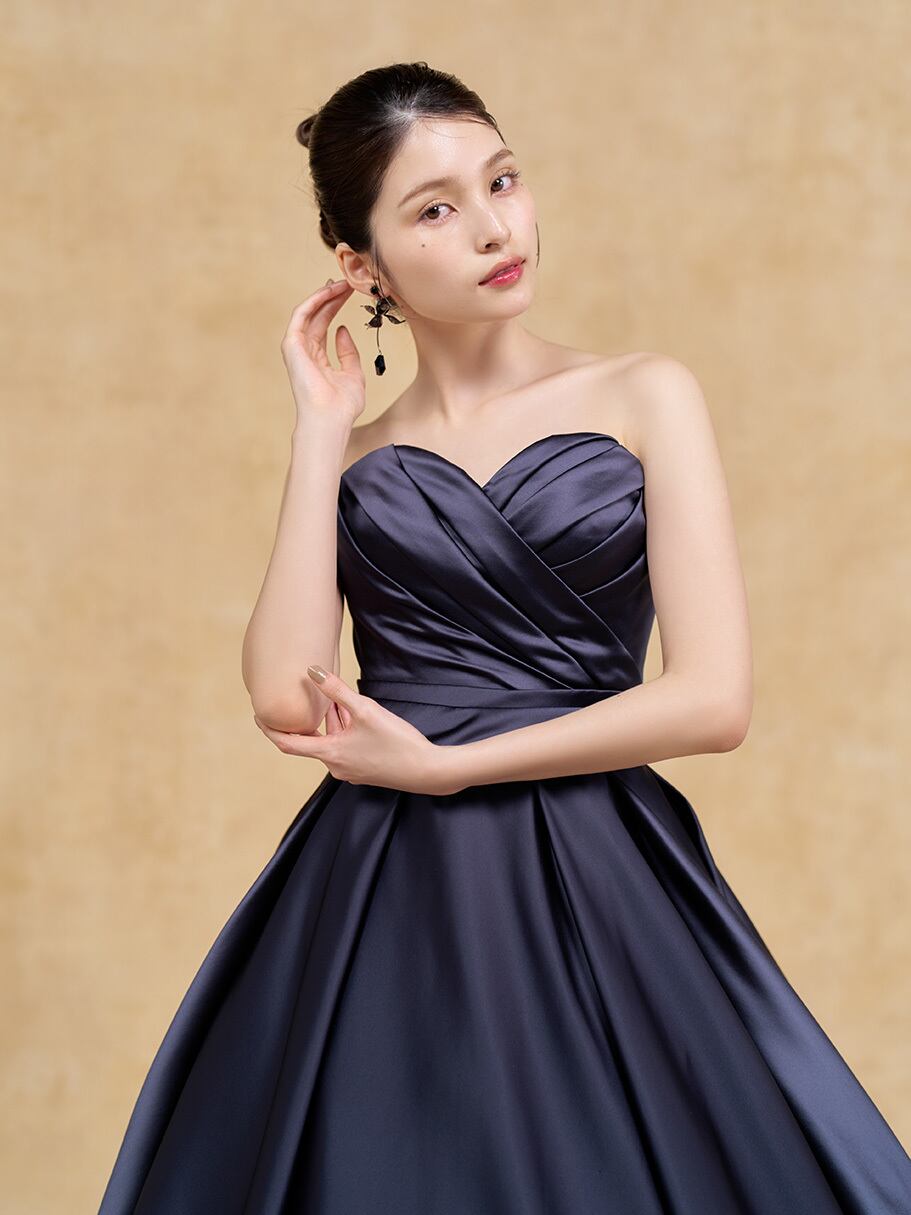 美品!ミッドナイトブルー ネイビーブルー カラードレス ワンショルダー 取り外しリボン ロングトレーン クルミボタン シルクサテン パーティードレス 前撮り【オーダーメイド】 | David1021k Dress(ダヴィドレス)