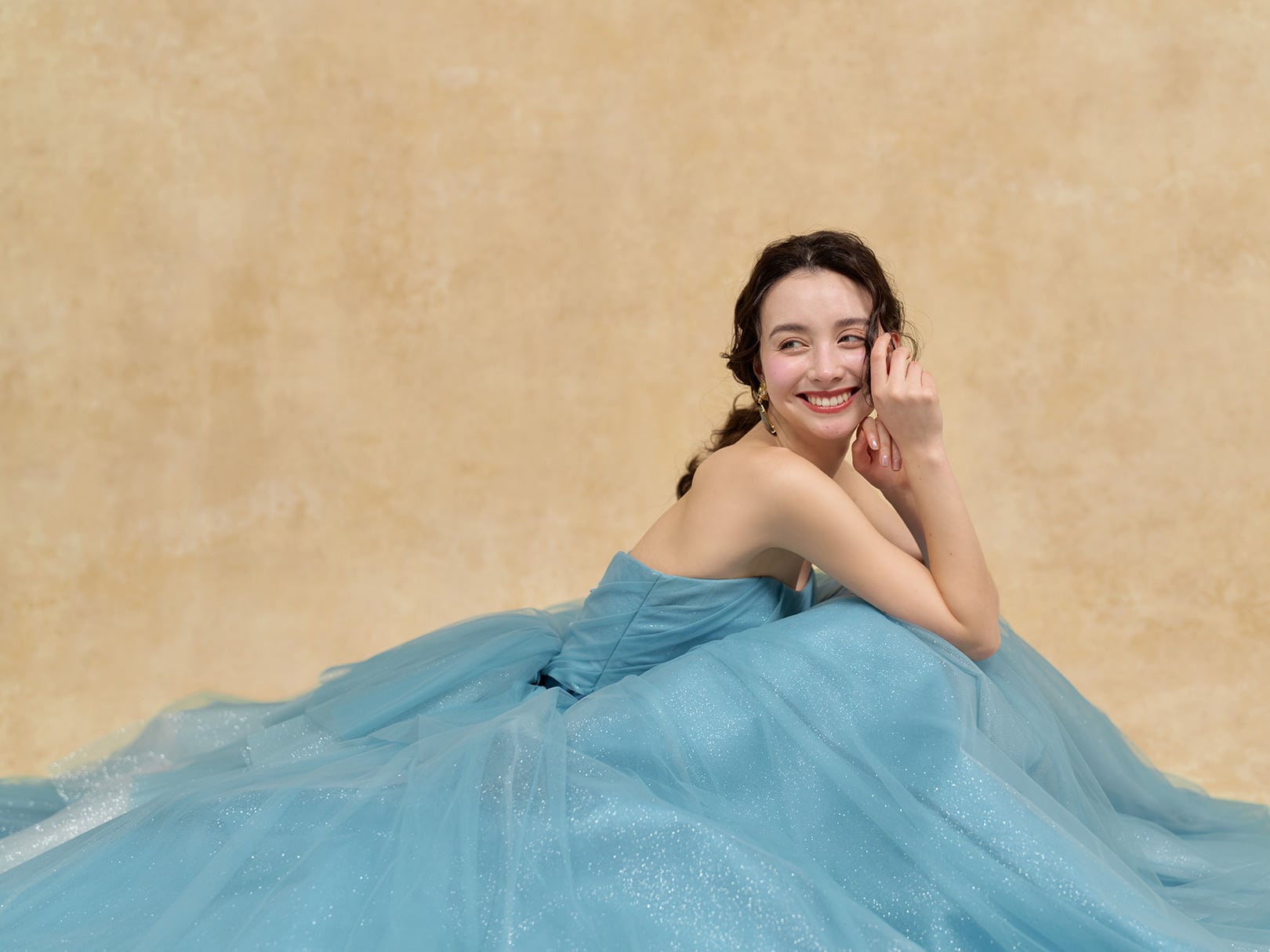 美品!ターコイズブルー 海と波をイメージする青色カラードレス オーシャンウェーブ キラキラ輝くチュールドレス スレンダーライン バックリボン 海辺のフォトウエディング/コンサート/前撮り