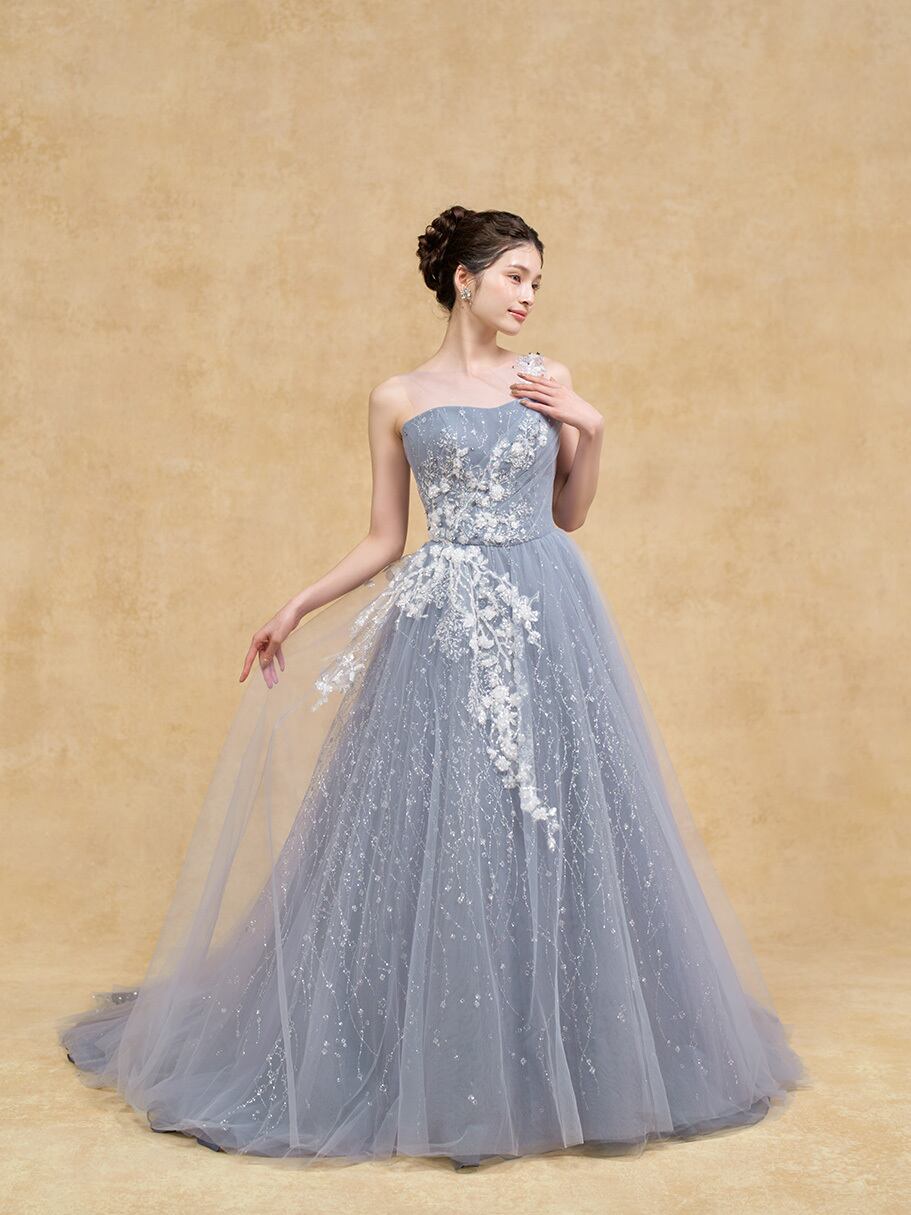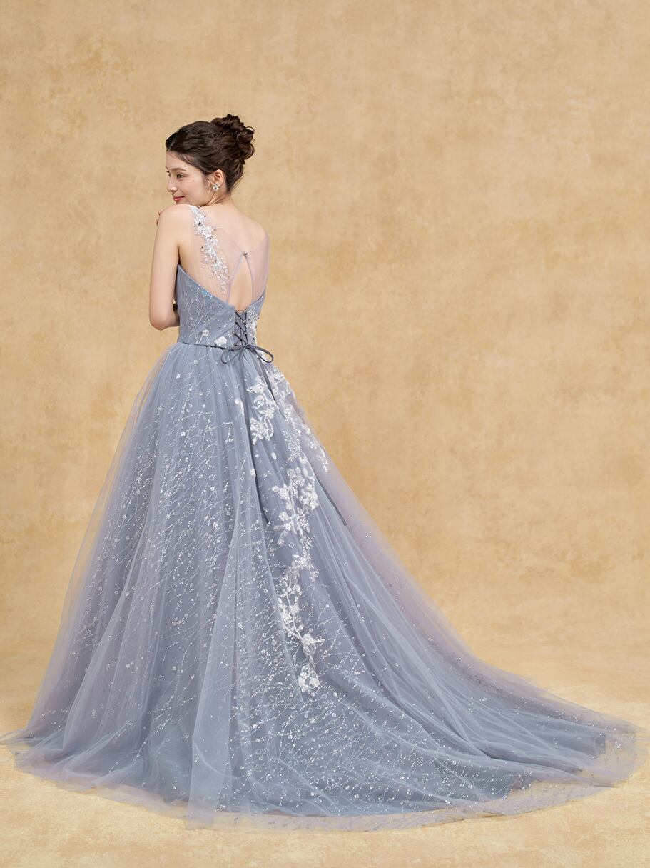 美品!ライトスカイブルー キラキラ枝花刺繍 くすんだブルー カラードレス ノースリーブ チュールドレス スレンダーライン 3D立体レース刺繍 花嫁/コンサート/前撮り | David1021k Dress(ダヴィドレス)