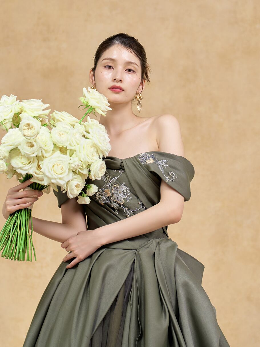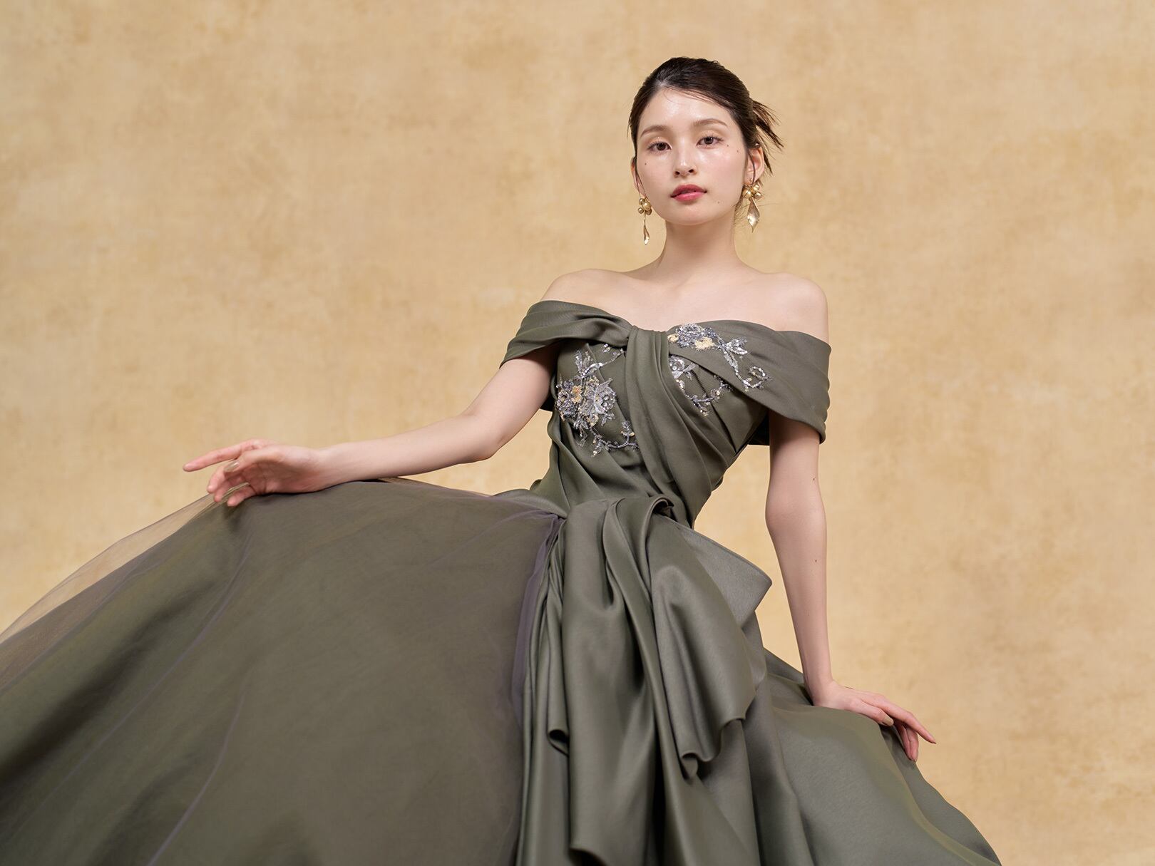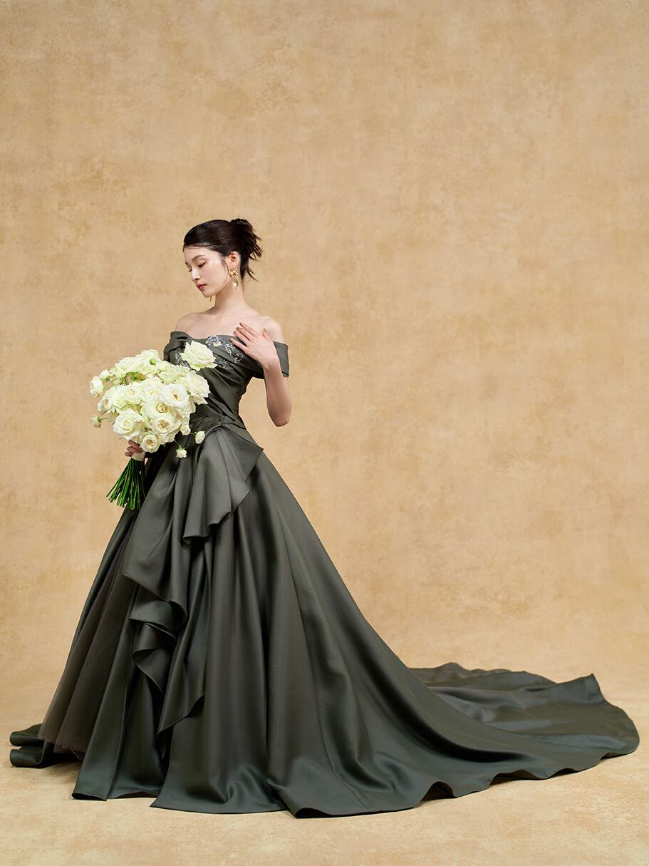 美品!ダークカーキ色 カラードレス オフショルダー 花モチーフ刺繡 フリフリ ソフトチュール/シルクサテン ロングトレーン パーティードレス 前撮り【オーダーメイド】