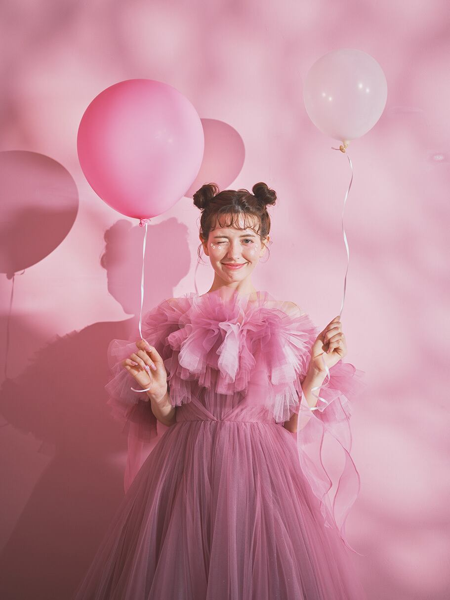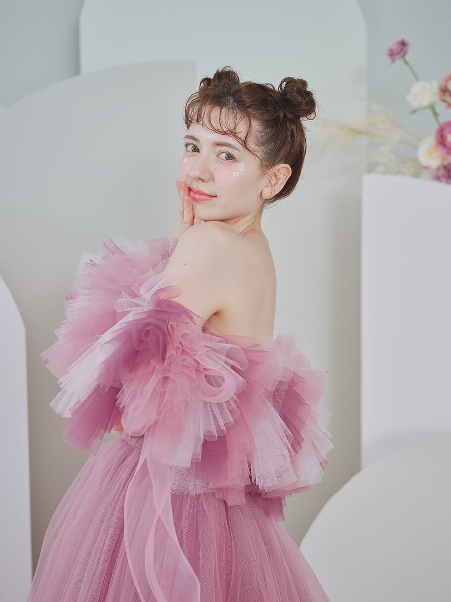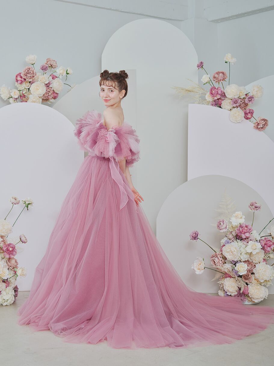 美品!薄ピンク 3色のふわふわオフショルダー カラードレス ロングトレーン パーティードレス 柔らかいチュールドレス 前撮り/コンサート【オーダーメイド】
