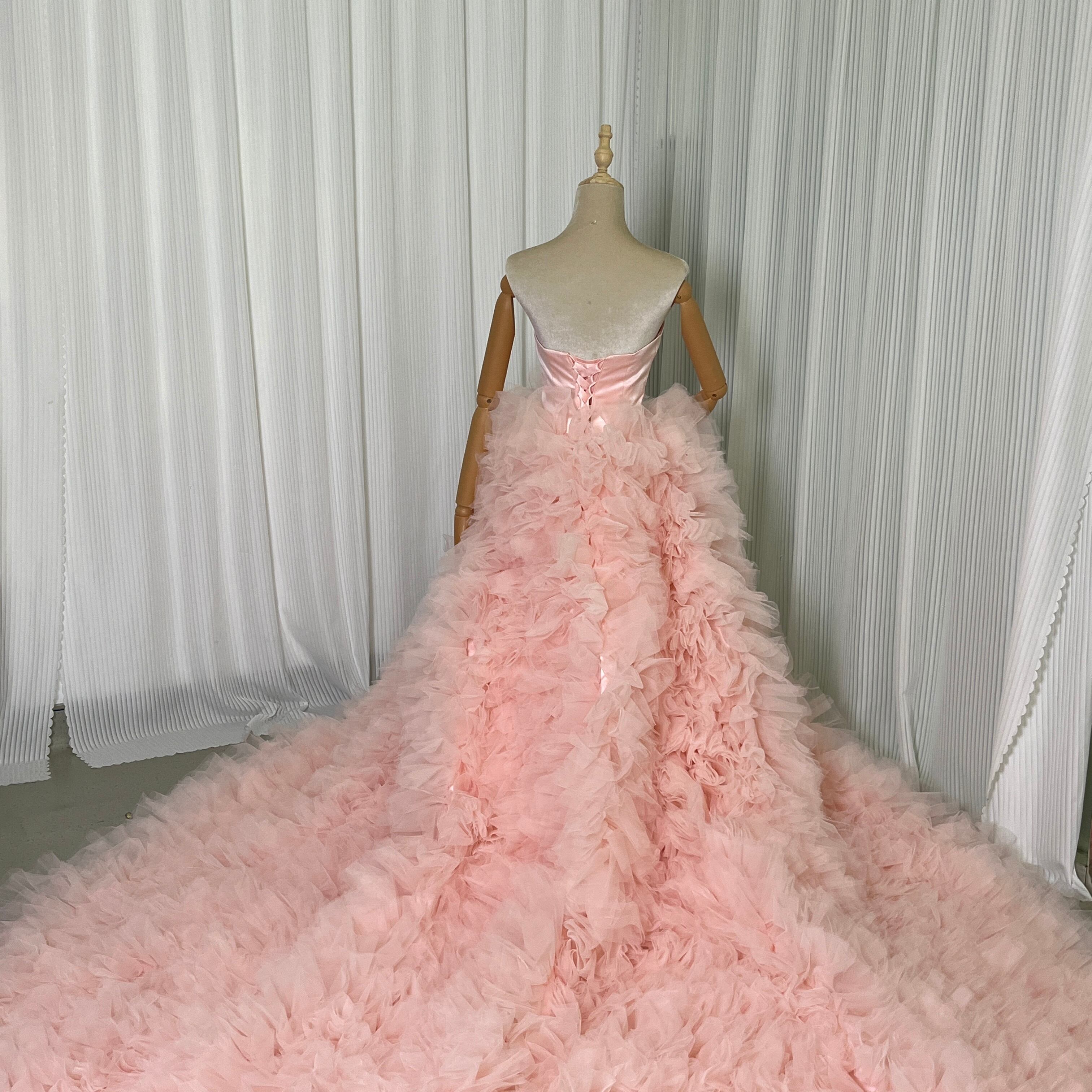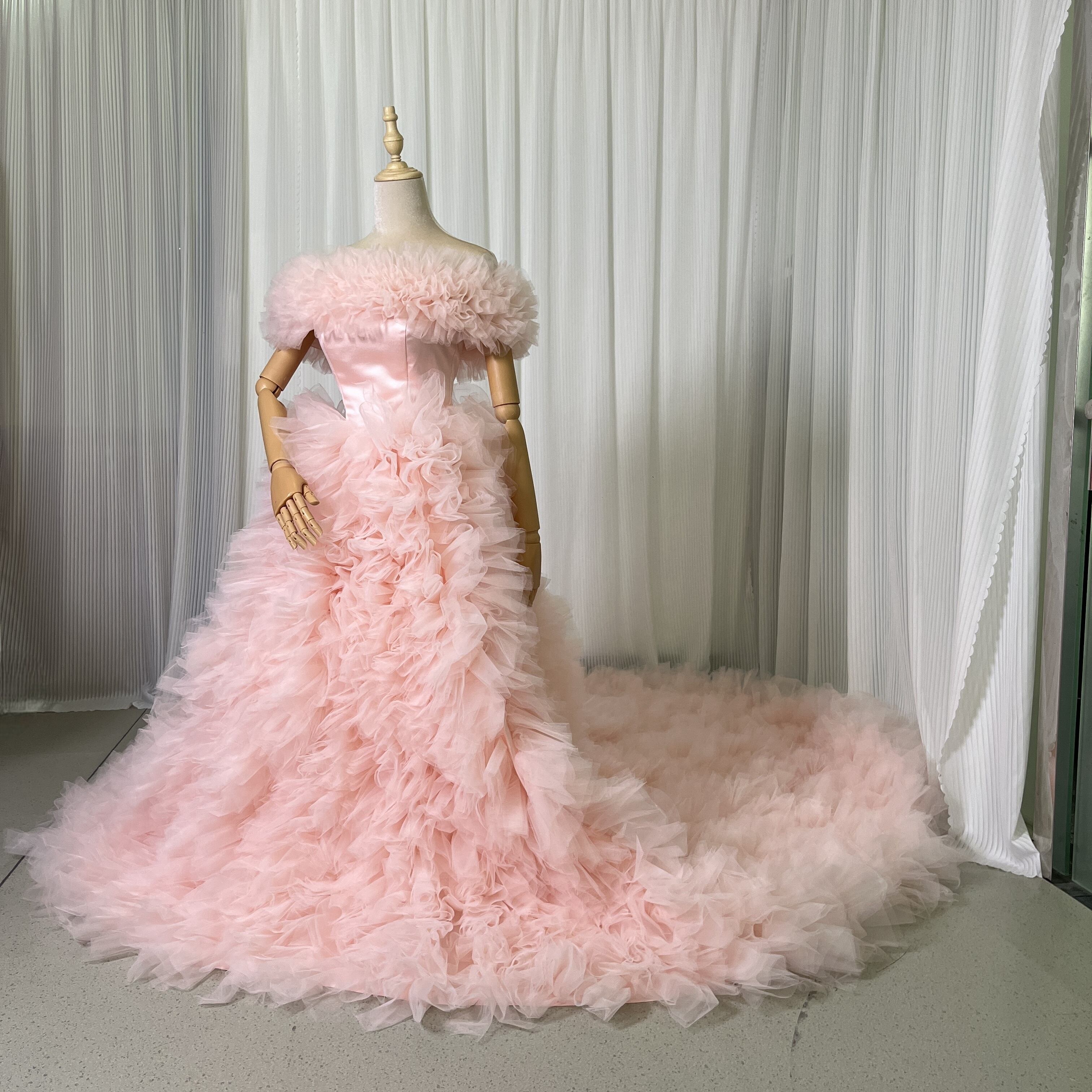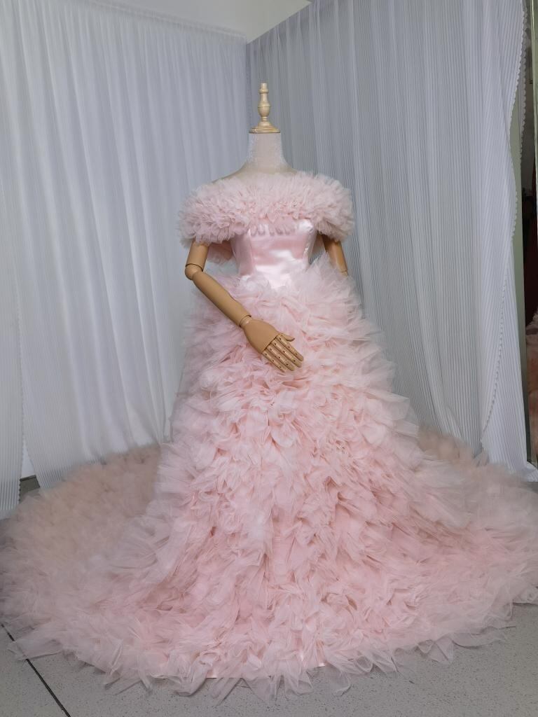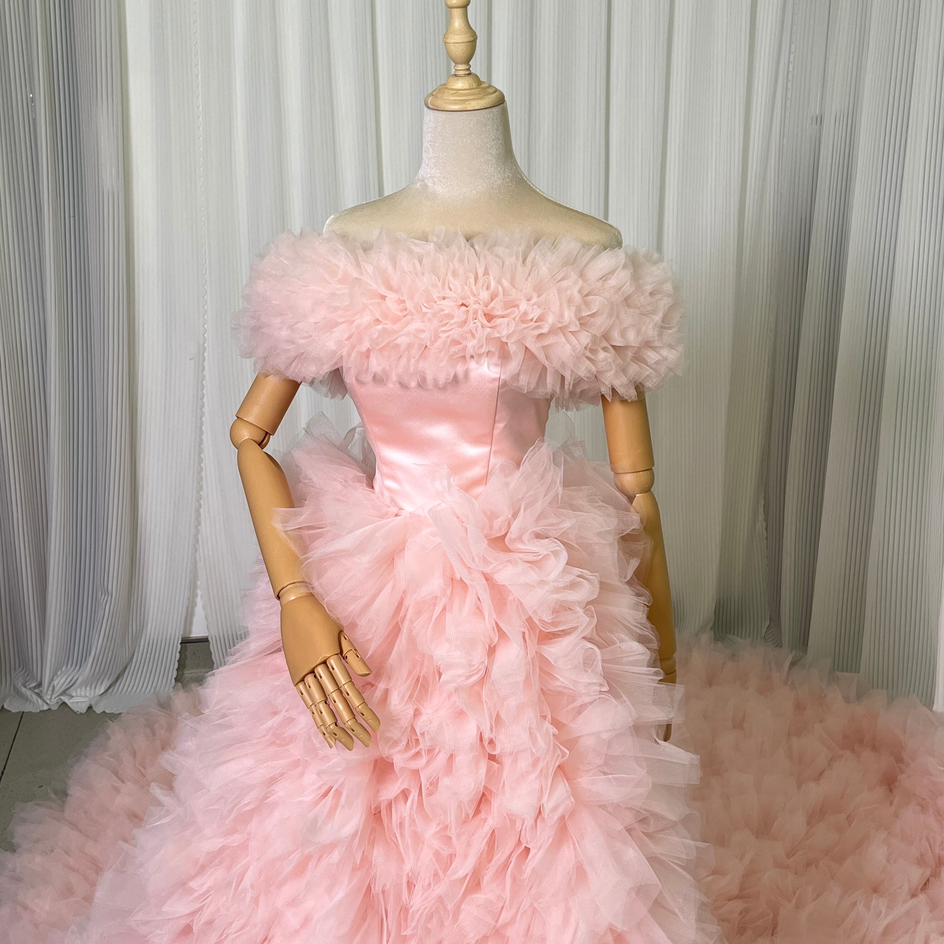 薄ピンク 取り外しオフショルダー カラードレス ふわふわチュールドレス お色直し もこもこドレス