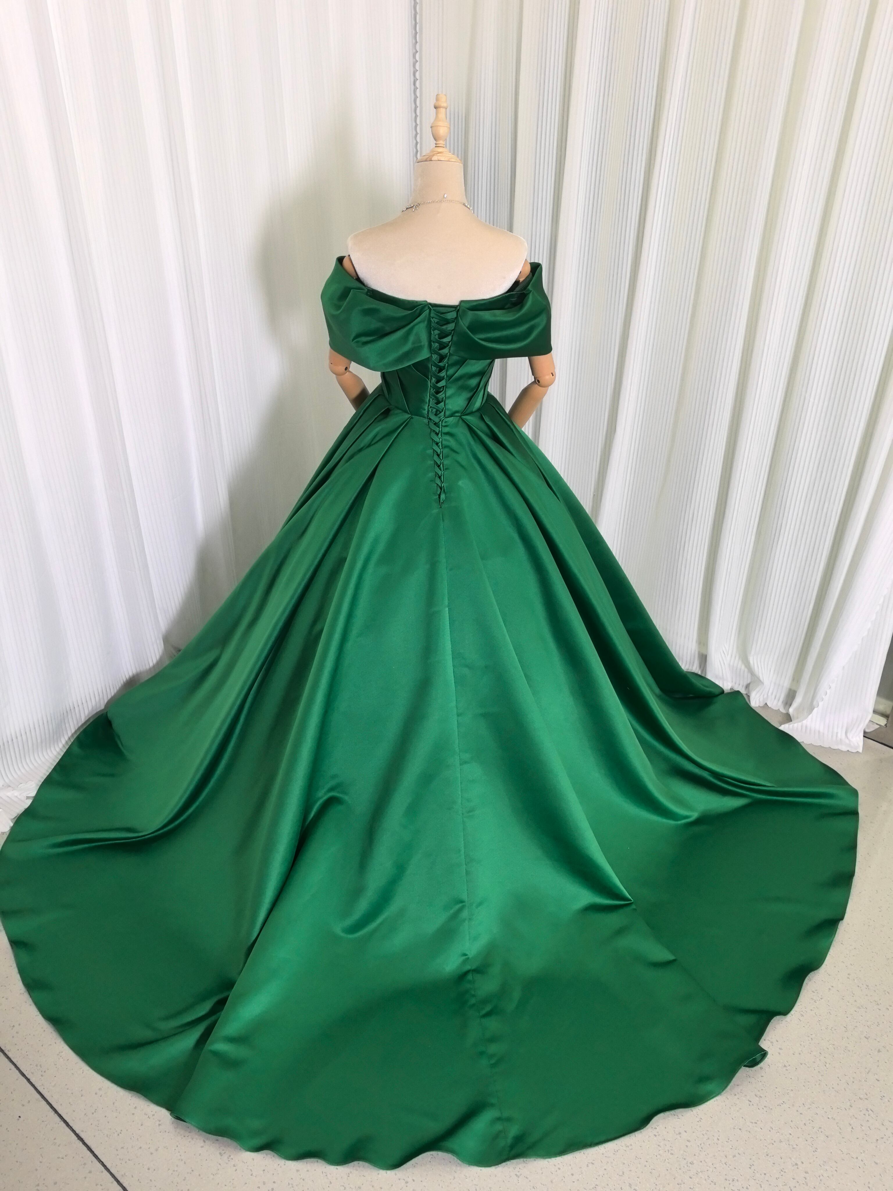 上品!フォレストグリーン/ライムグリーン カラードレス オフショルダー 光沢サテン パーティードレス コンサート 前撮り