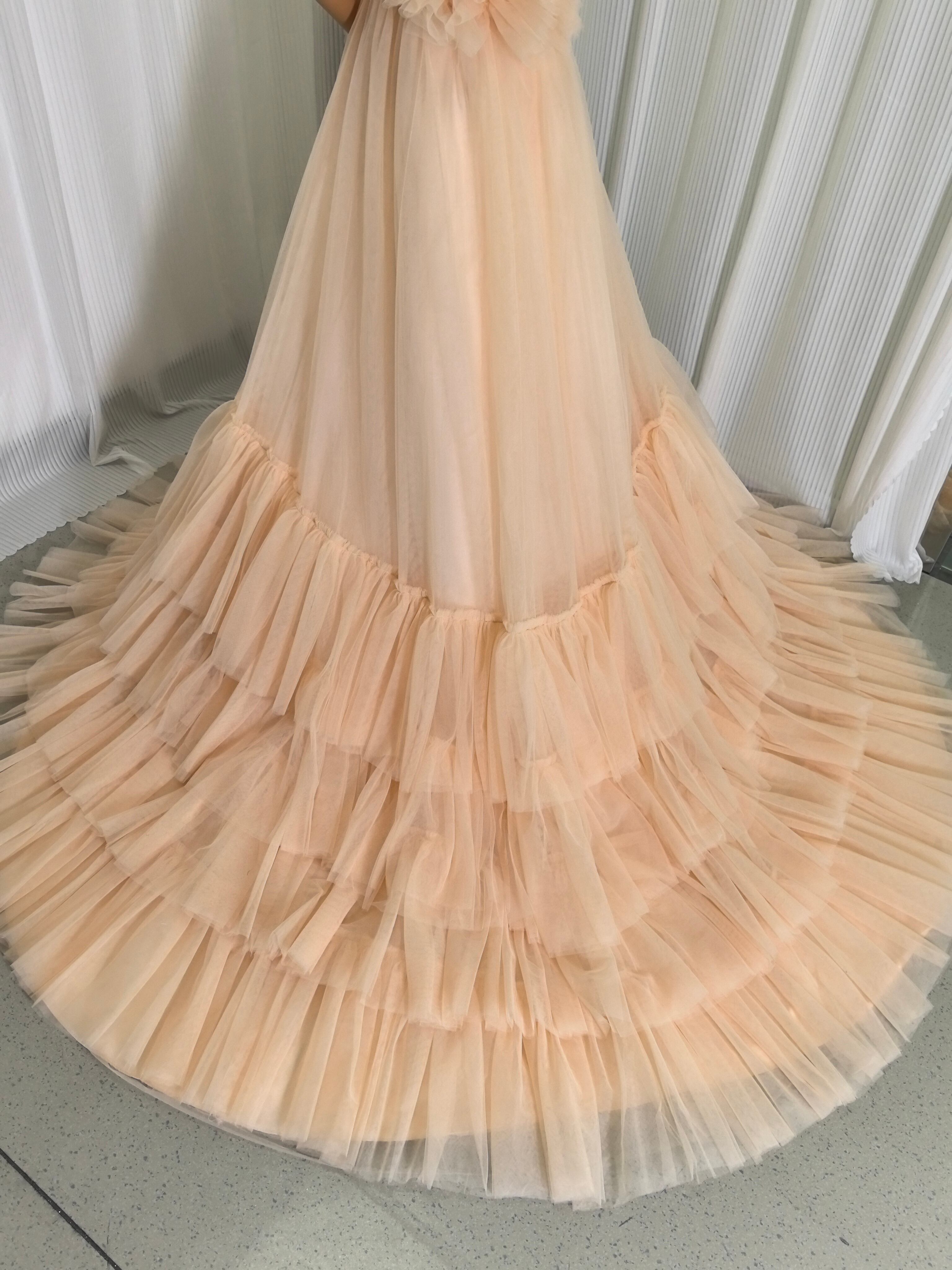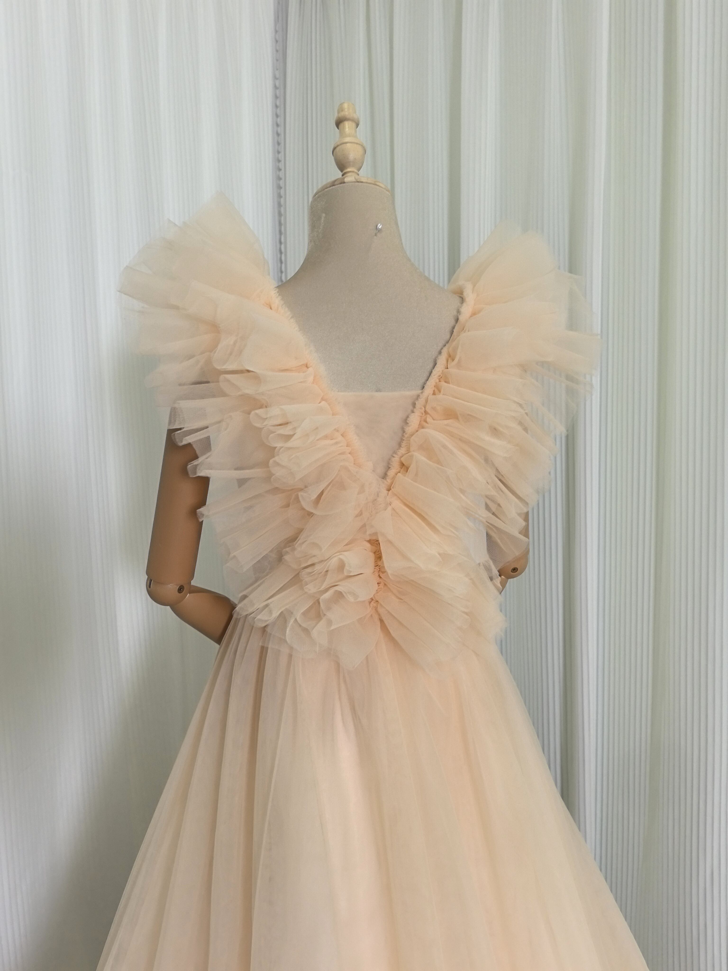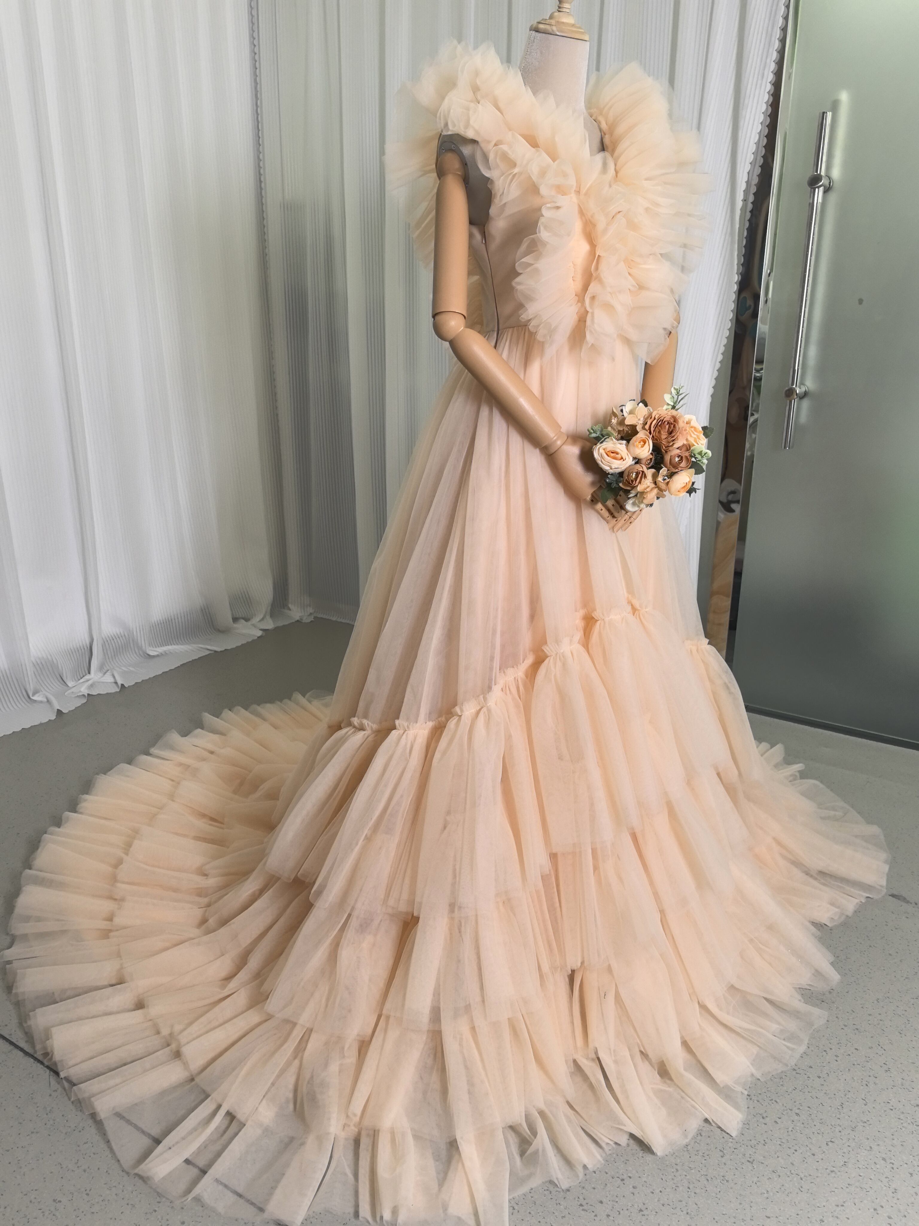 カラードレス シャンパン Vネック ウエディングドレス キャミソール 柔らかく重ねたチュールスカート 花嫁/前撮り