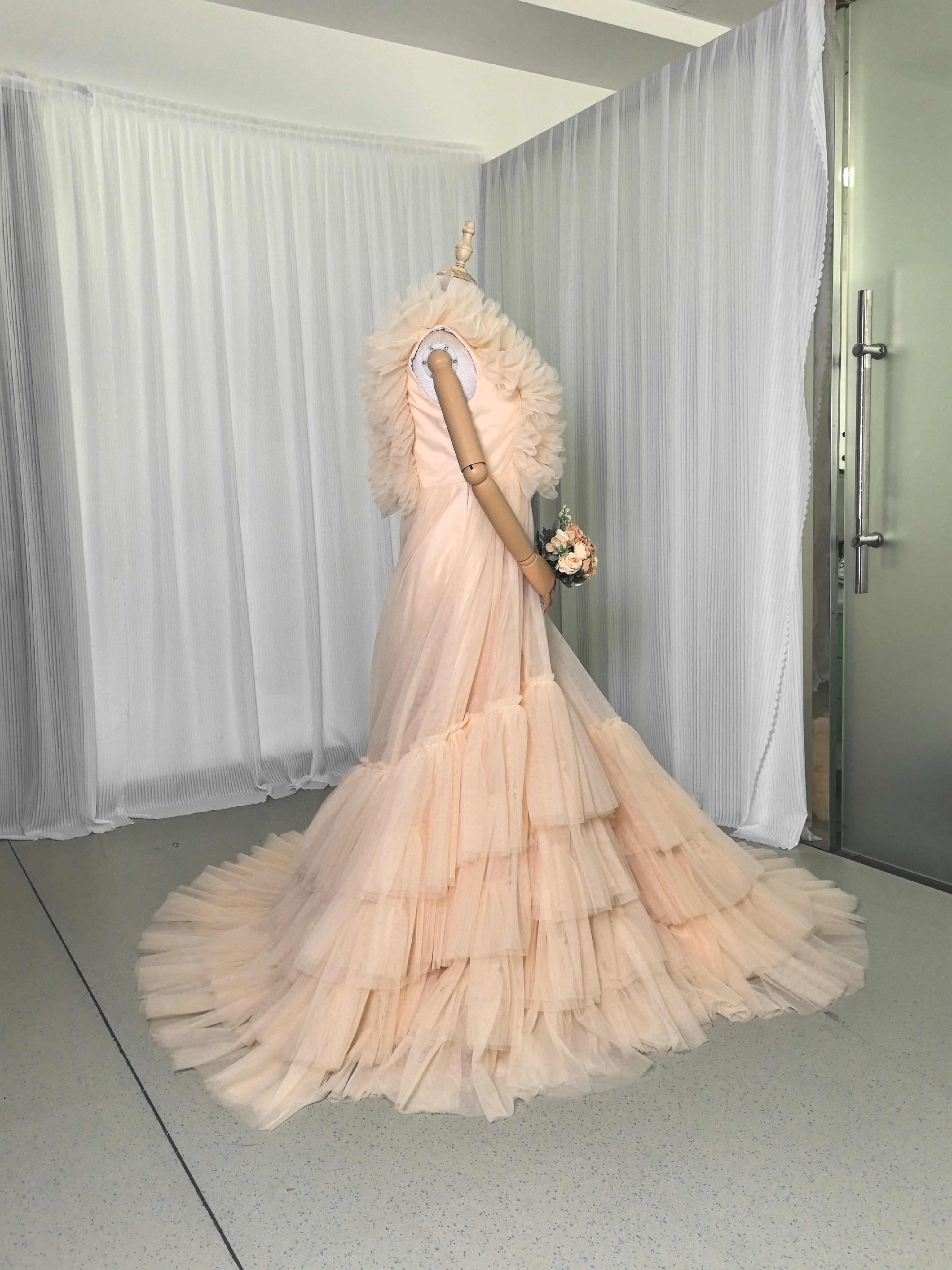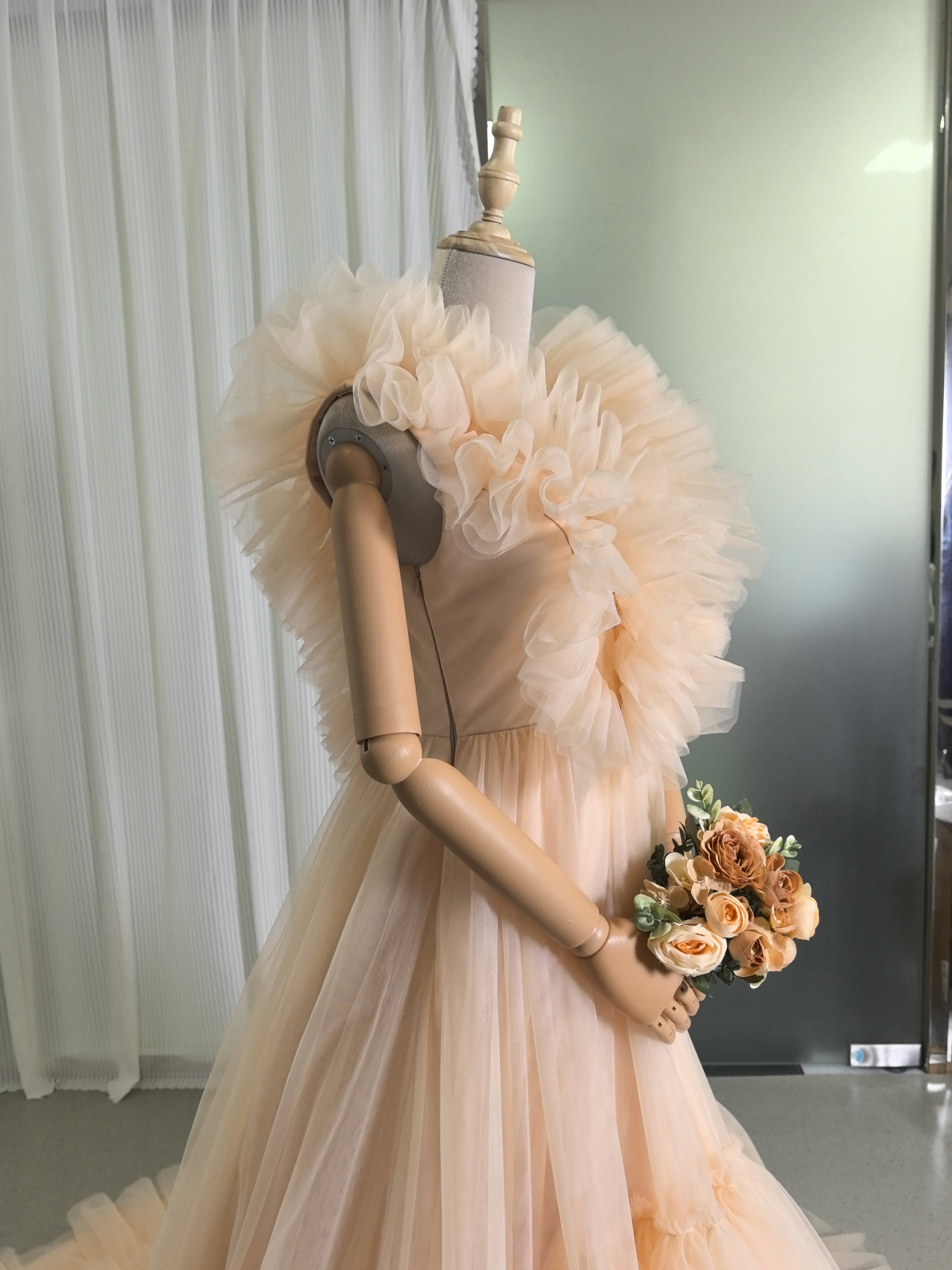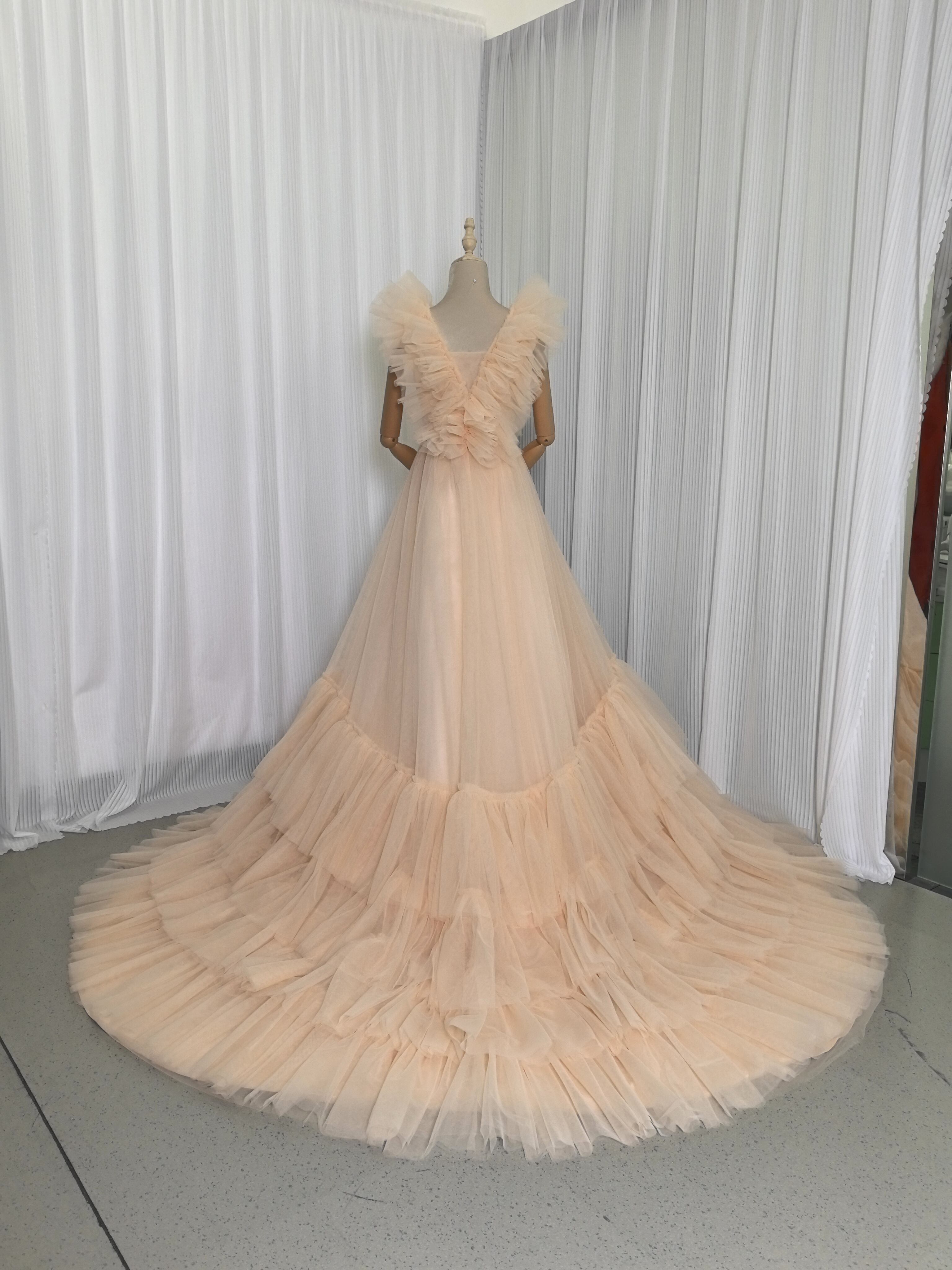カラードレス シャンパン Vネック ウエディングドレス キャミソール 柔らかく重ねたチュールスカート 花嫁/前撮り