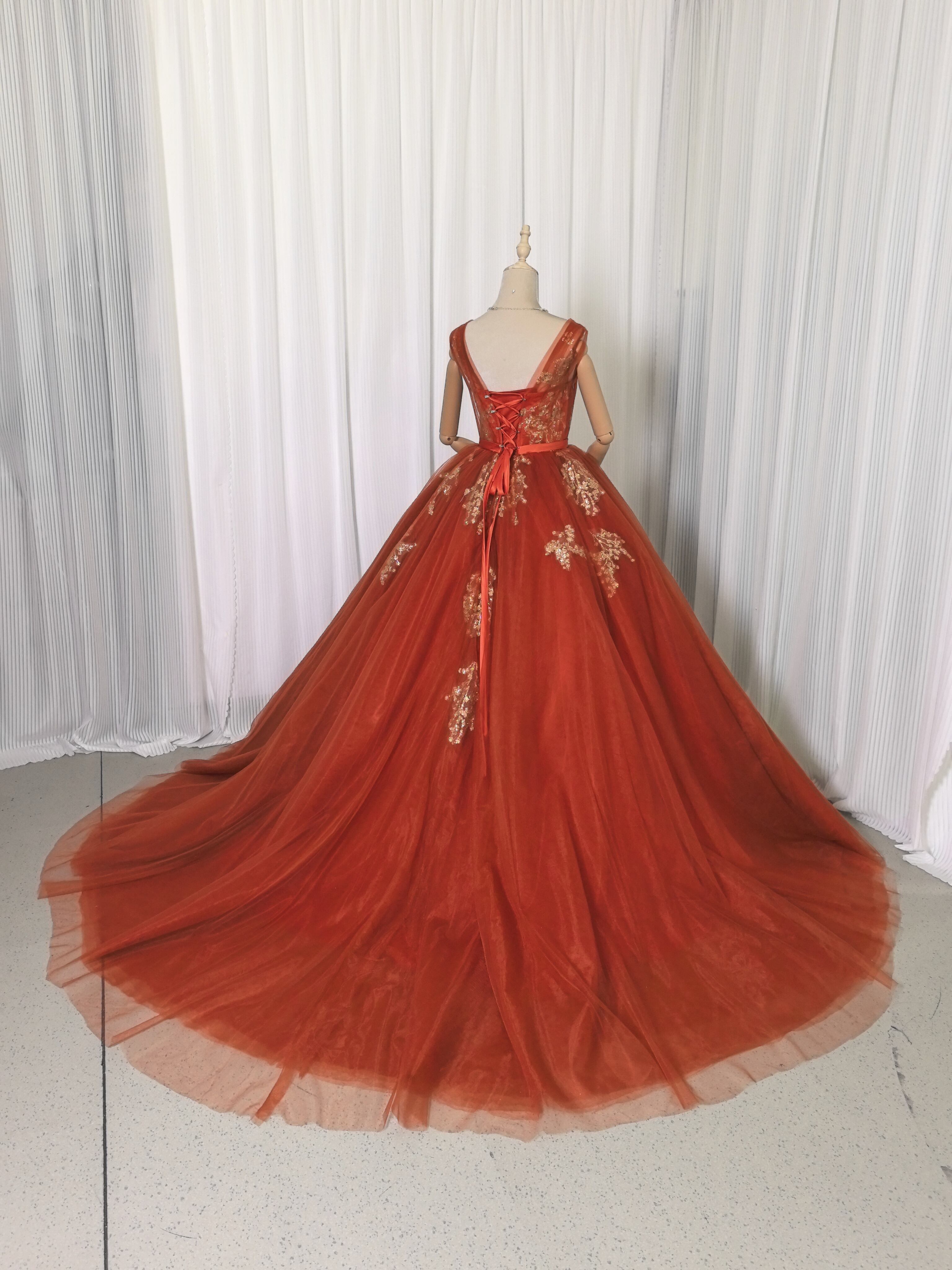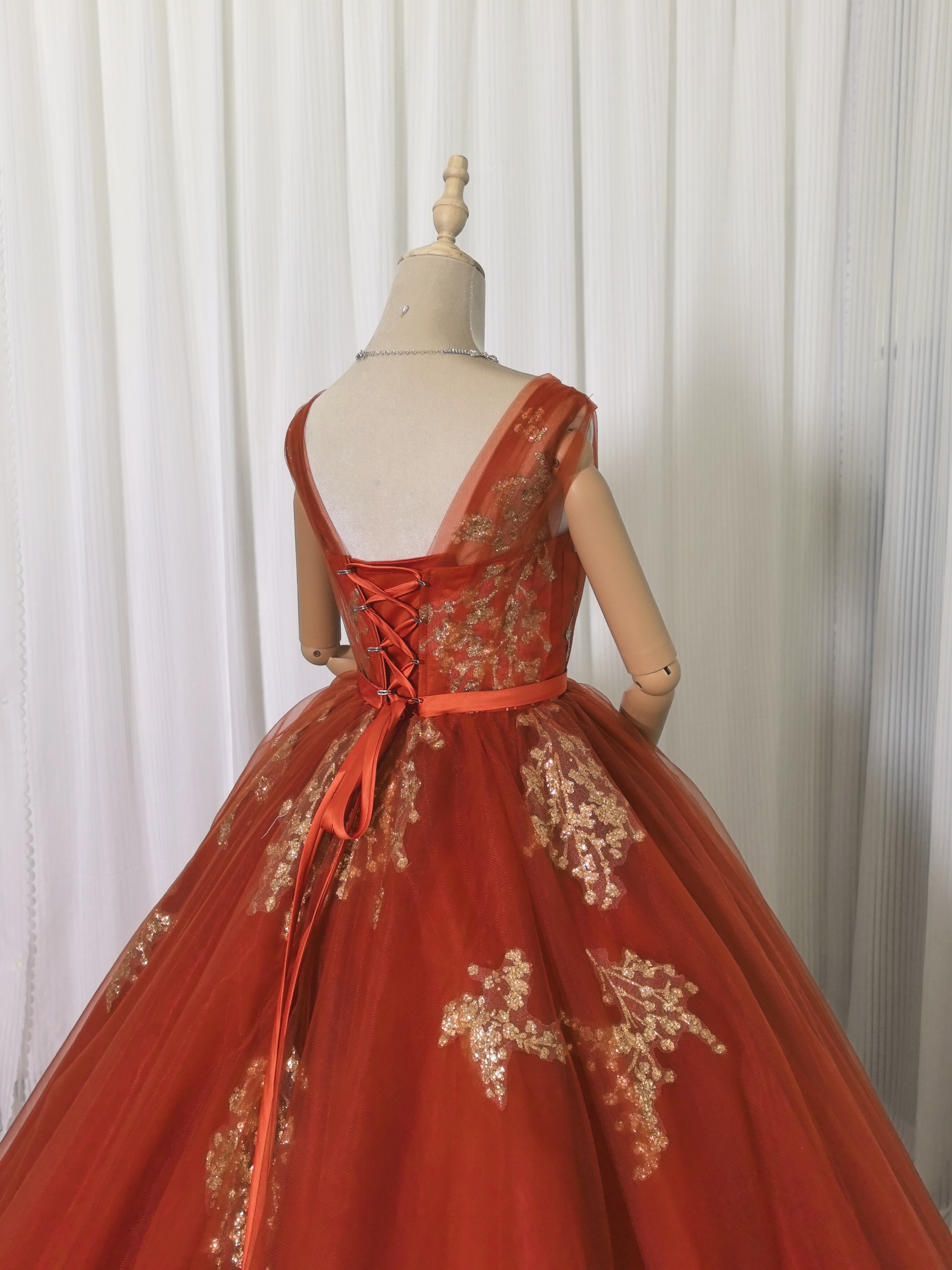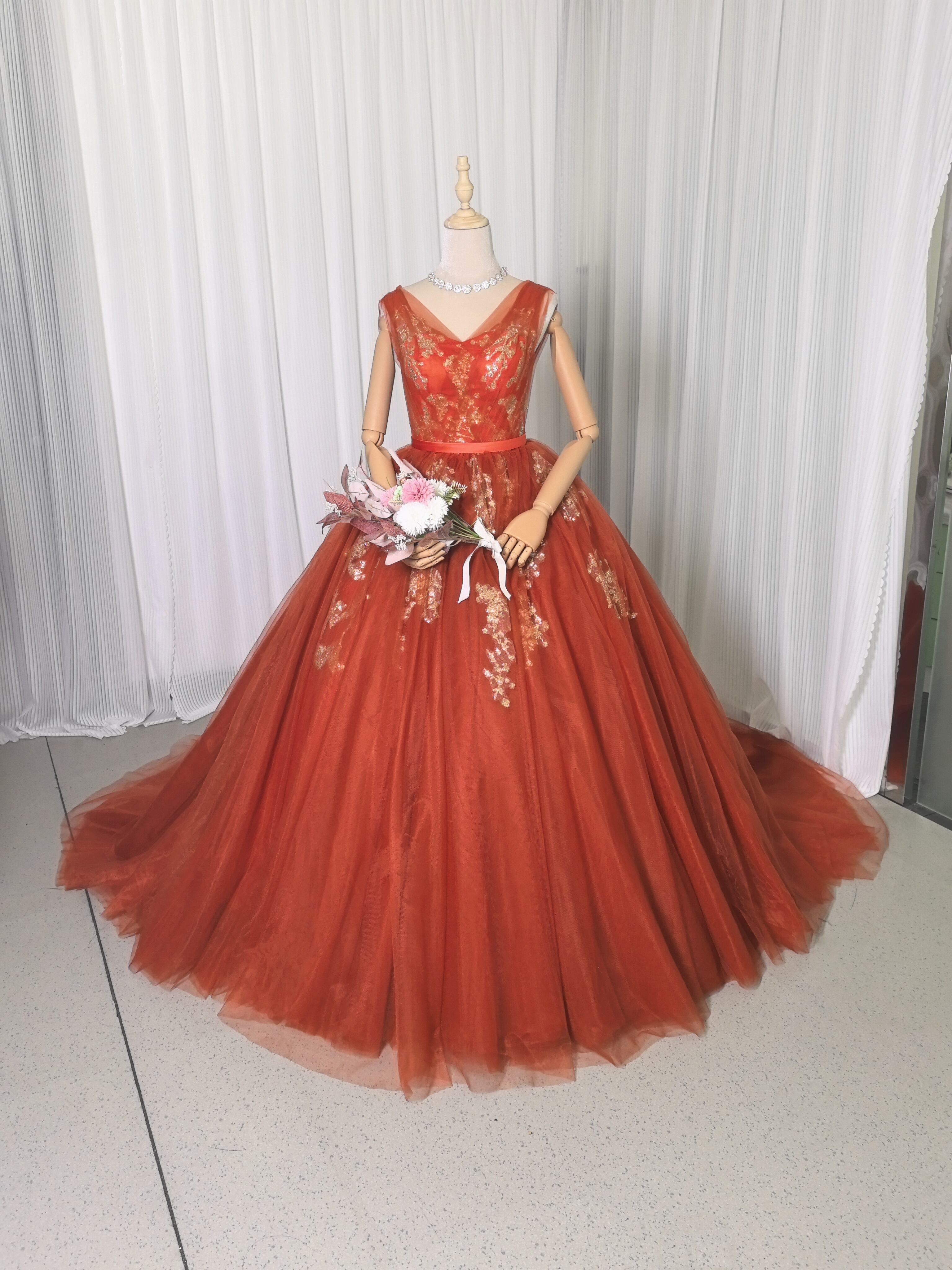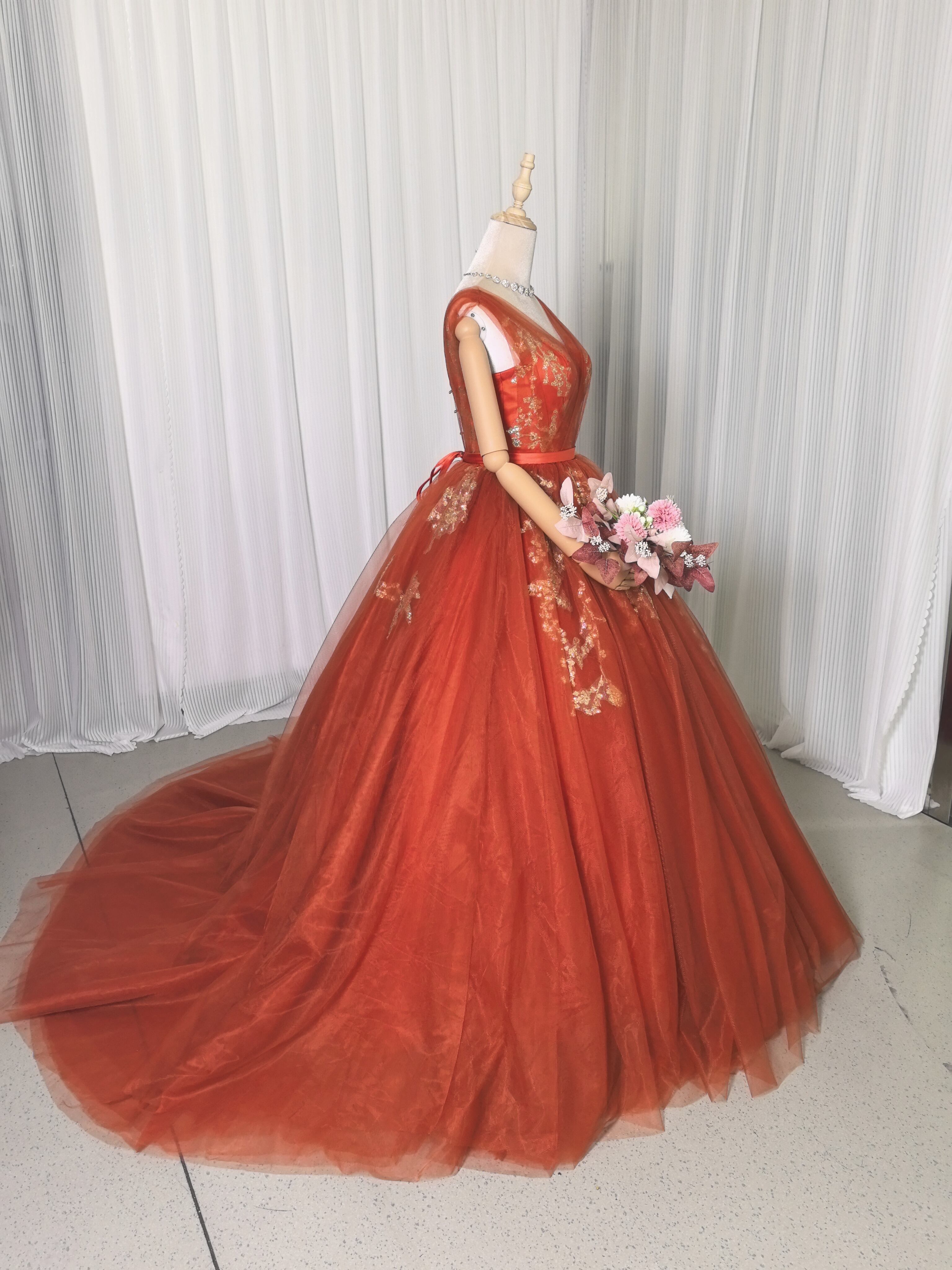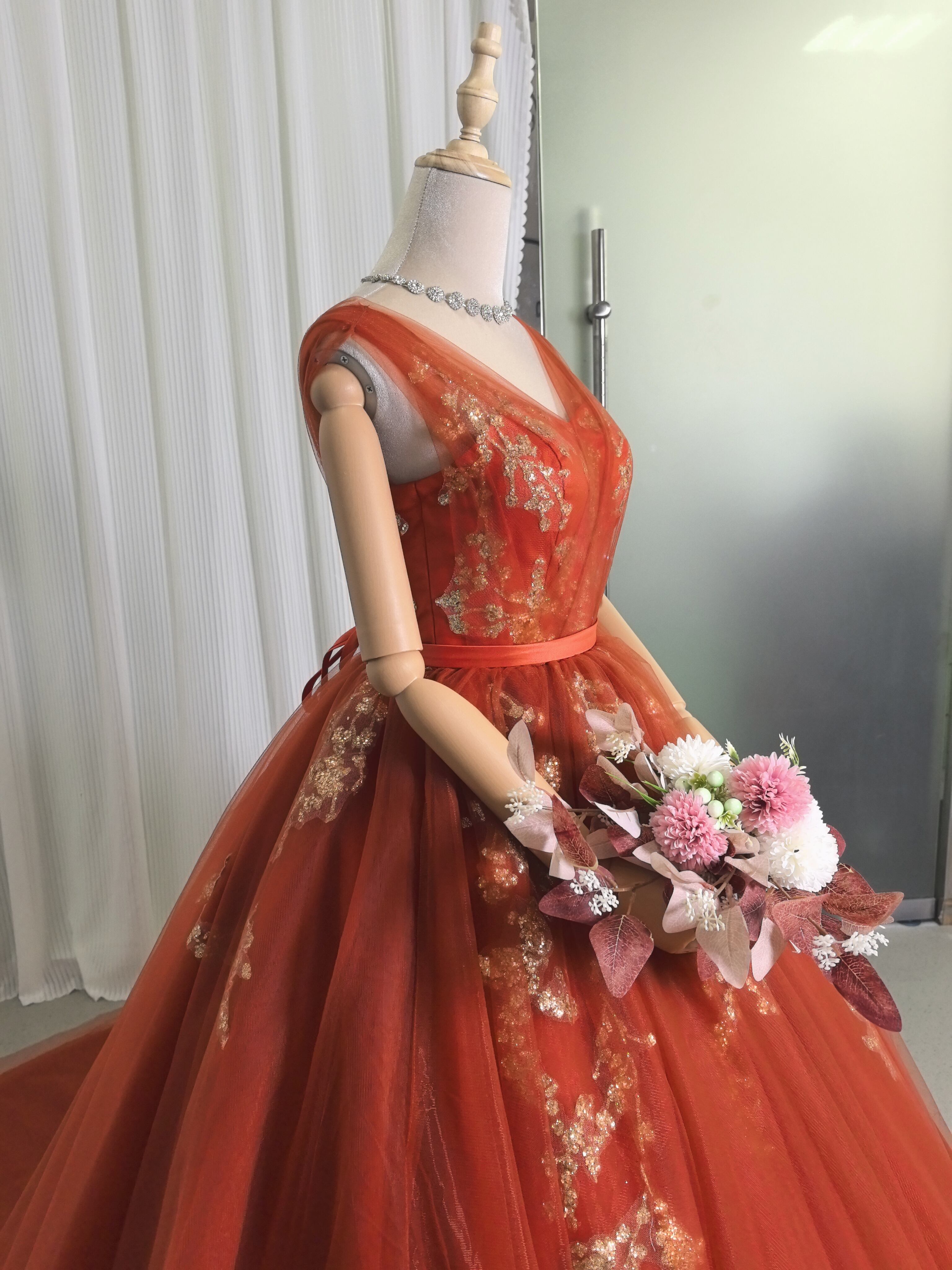 送料無料!カラードレス 3D立体レース刺繍 キラキラチュール テラコッタ色 ソフトチュール パーティードレス 花嫁/前撮り/演奏会/音楽