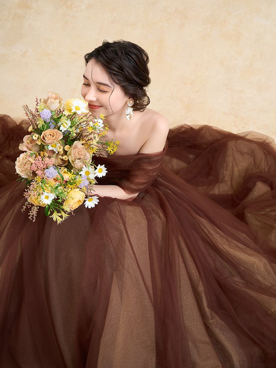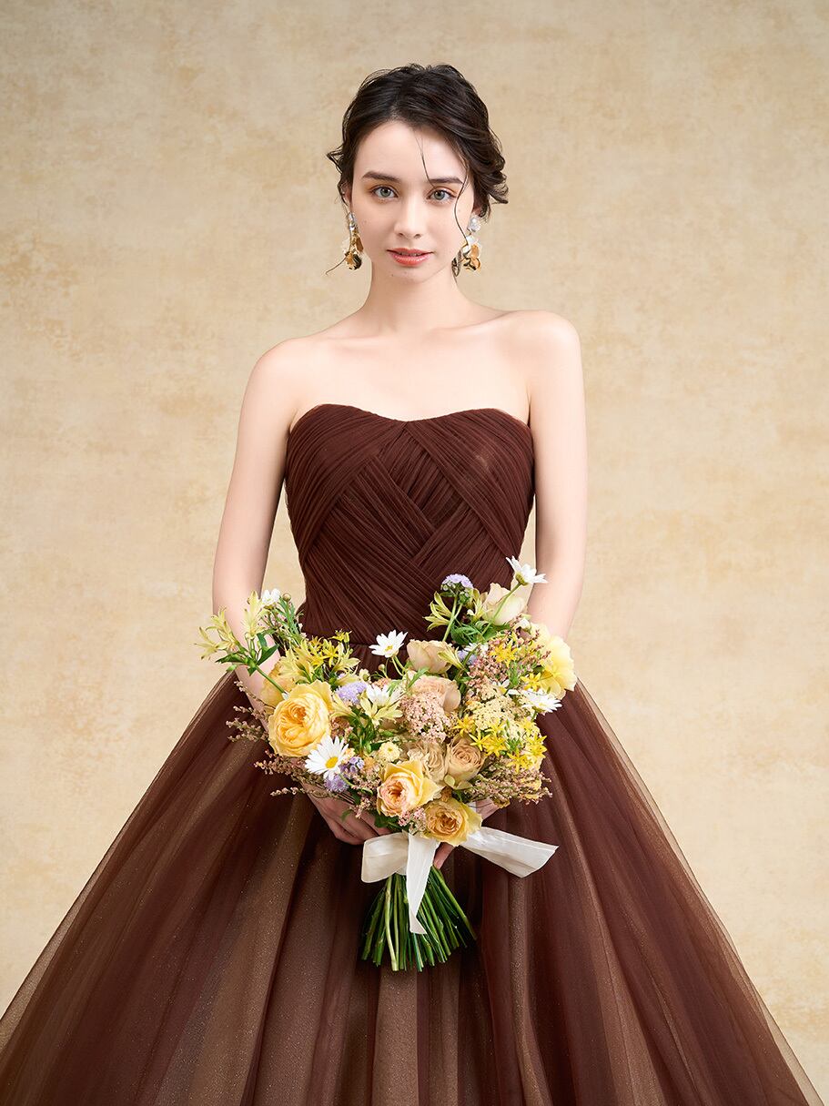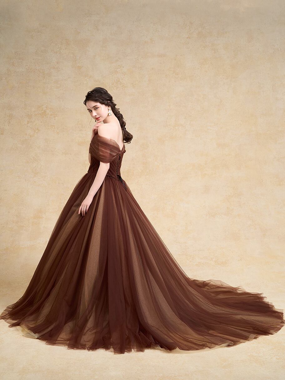 美品!マルーン/コーヒーブラウン カラードレス チョコレートブラウン ソフトチュールドレス ロールカラー パーティードレス オフショルダー 冬婚/コンサート/前撮り | David1021k Dress(ダヴィドレス)