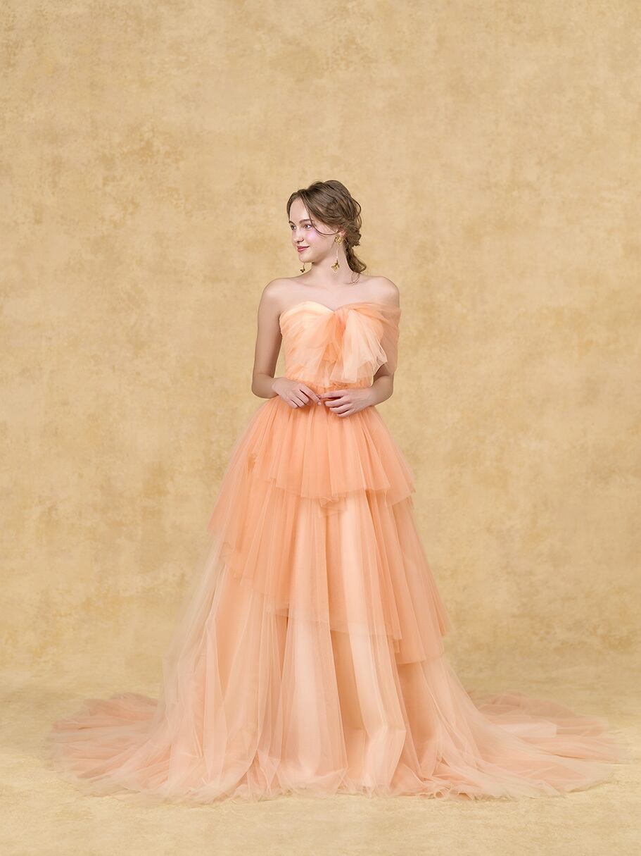 美品!コーラルピンク/コーラルオレンジ カラードレス ワンショルダー フリフリチュールドレス スレンダーライン エンパイアライン 妊婦ドレス 前撮り/演奏会 | David1021k Dress(ダヴィドレス)