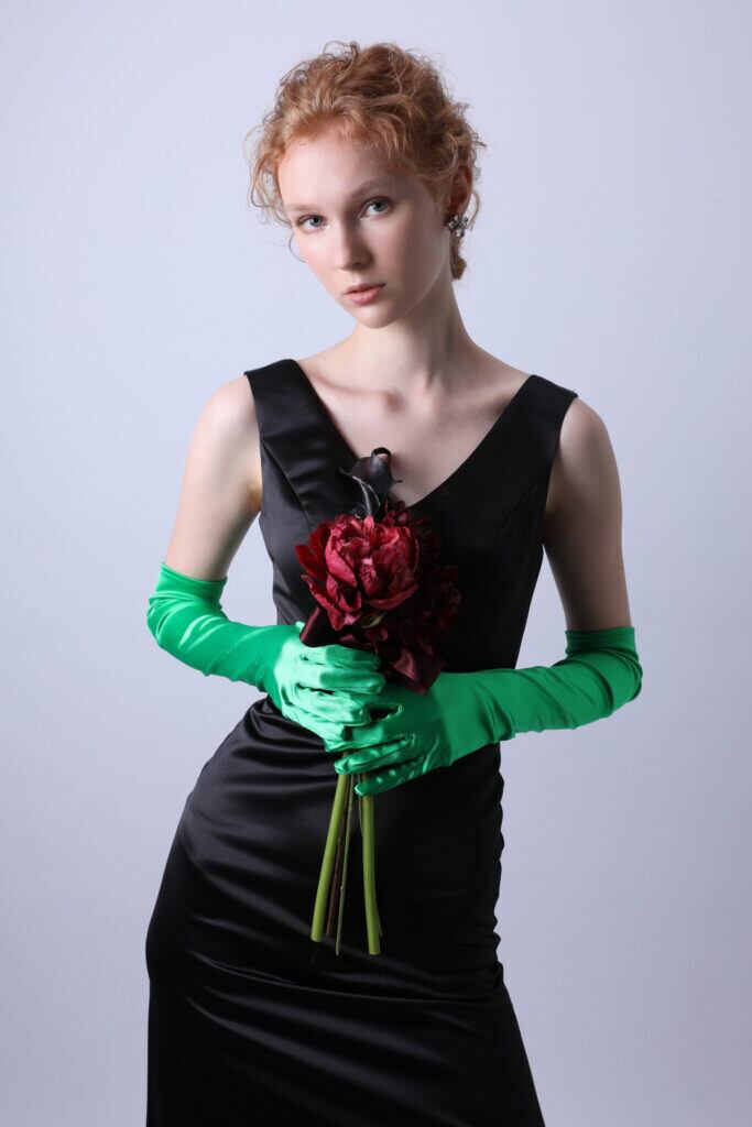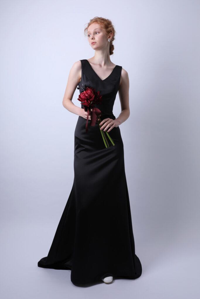 美品!光沢サテン ブラック/黒カラードレス 優雅なシルエット Vネック ソフトマーメイド ノースリーブ スレンダーライン パーティードレス 前撮り/演奏会 | David1021k Dress(ダヴィドレス)