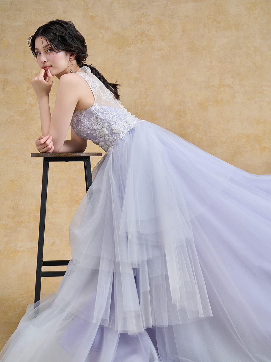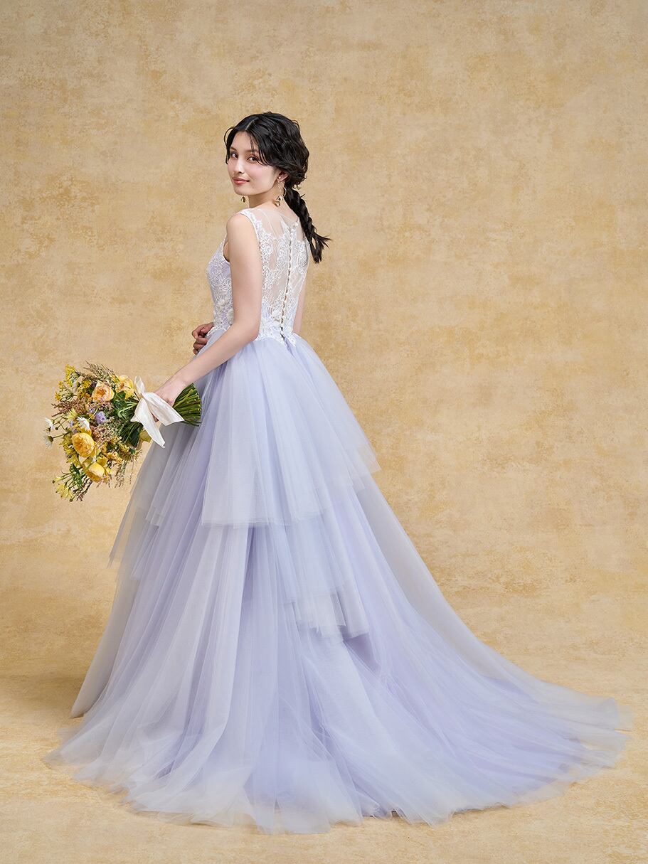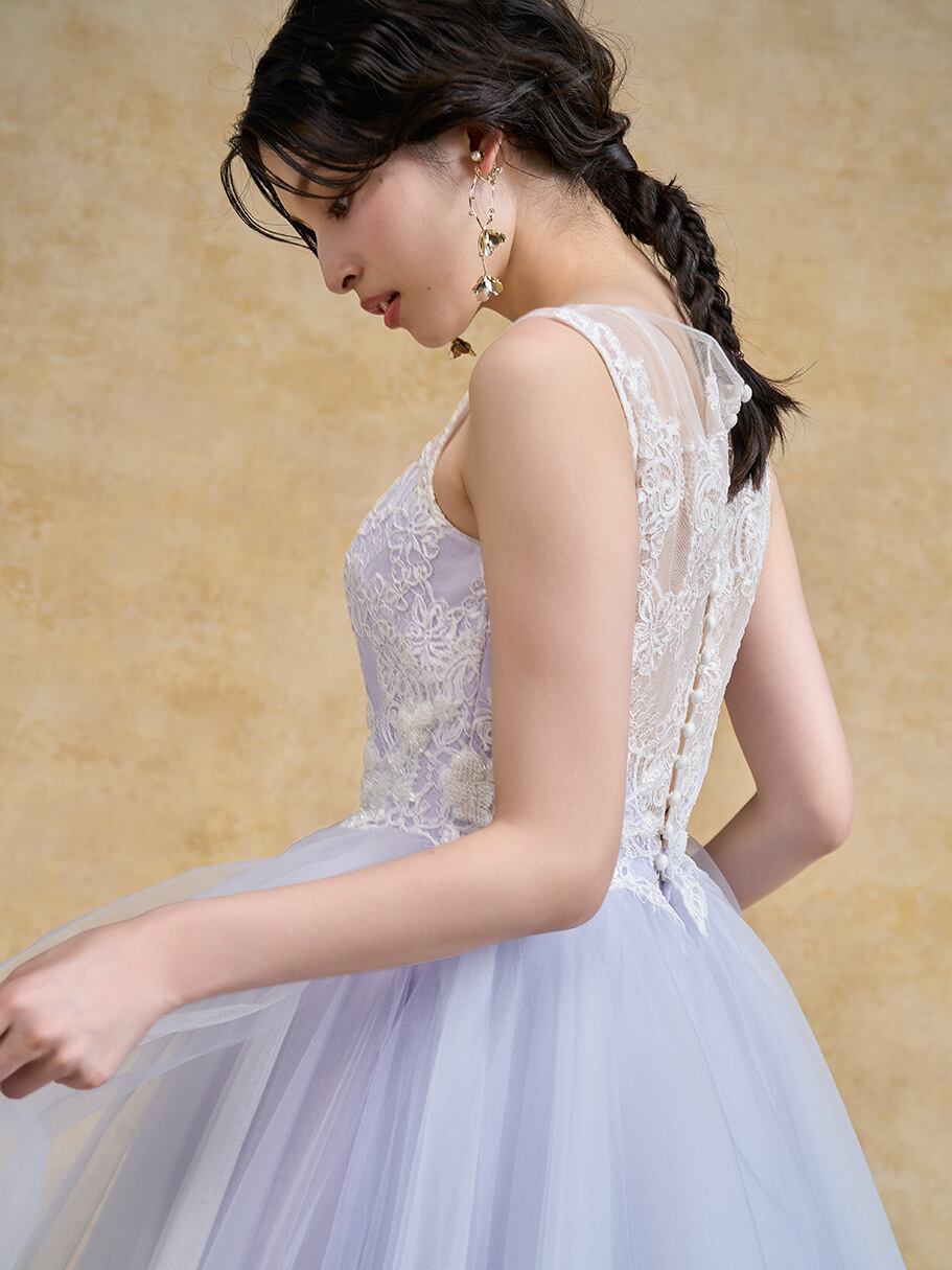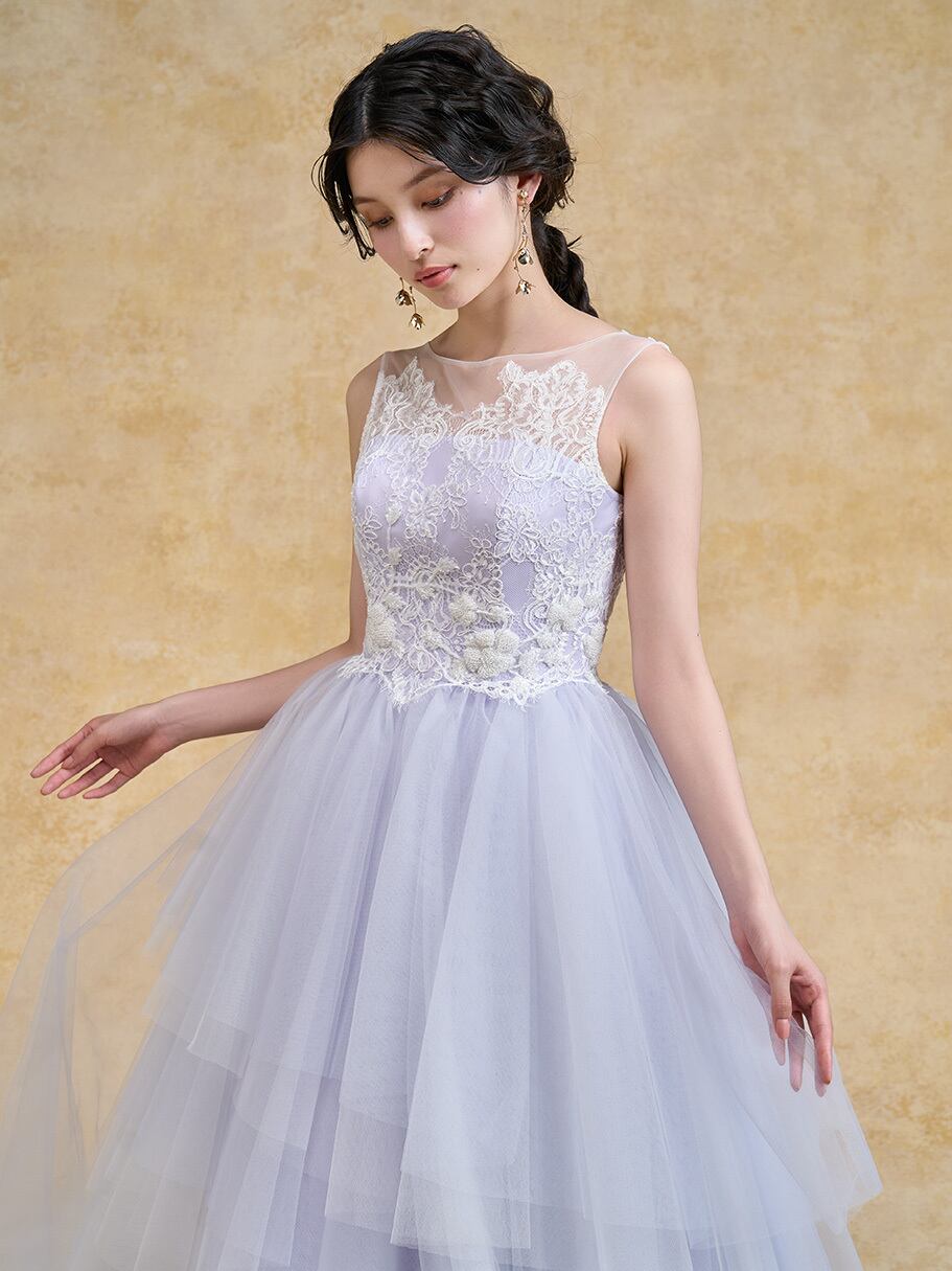 高品質!スレンダーライン ブルー/ライトパープル カラードレス フリルチュールドレス パーティードレス ノースリーブ 春婚/コンサート/前撮り