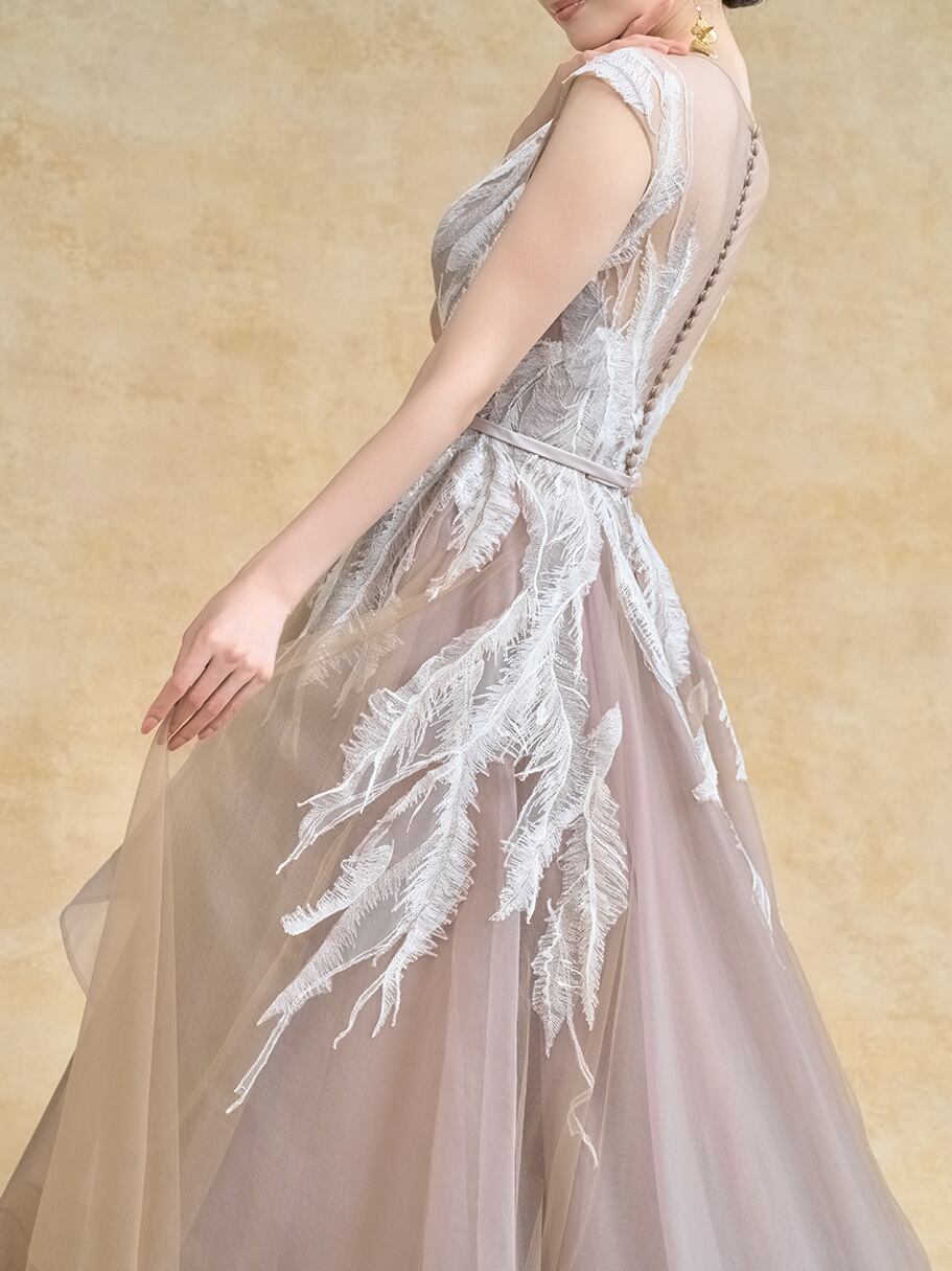 上品!ココアブラウン スレンダーライン ミルクティーベージュカラー カラードレス フリルチュールドレス パーティードレス ノースリーブ 羽 モチーフ刺繡 二次会/コンサート/前撮り | David1021k Dress(ダヴィドレス)