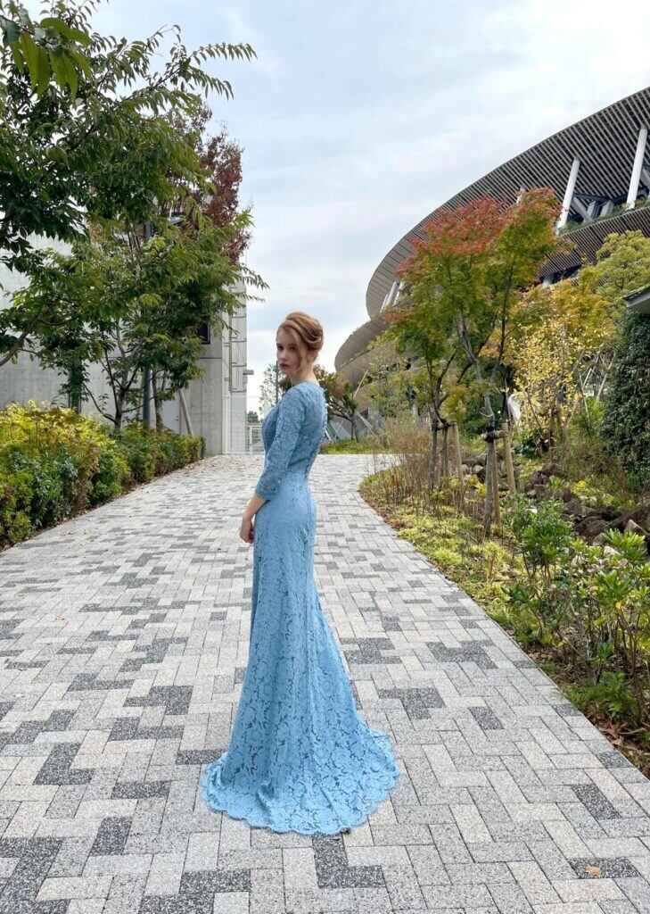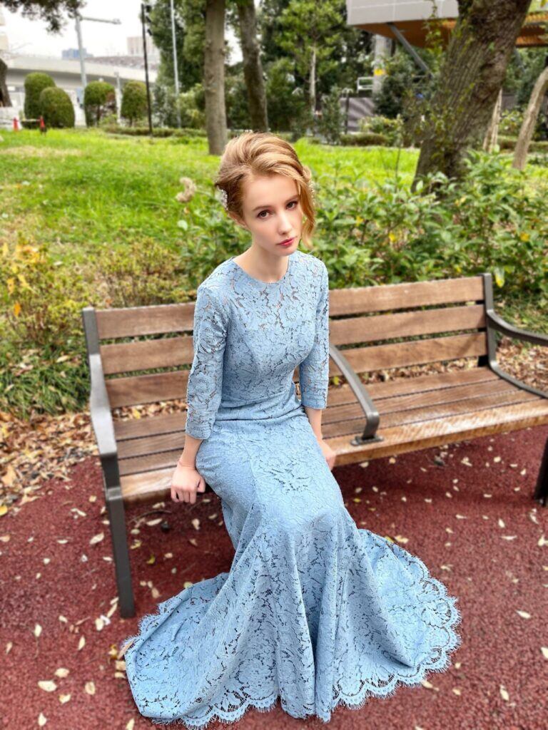 繊細レース!フロスティブルー 総レースドレス 青 カラードレス スレンダーライン パーティードレス 長袖 シック マザーズドレス 二次会/演奏会
