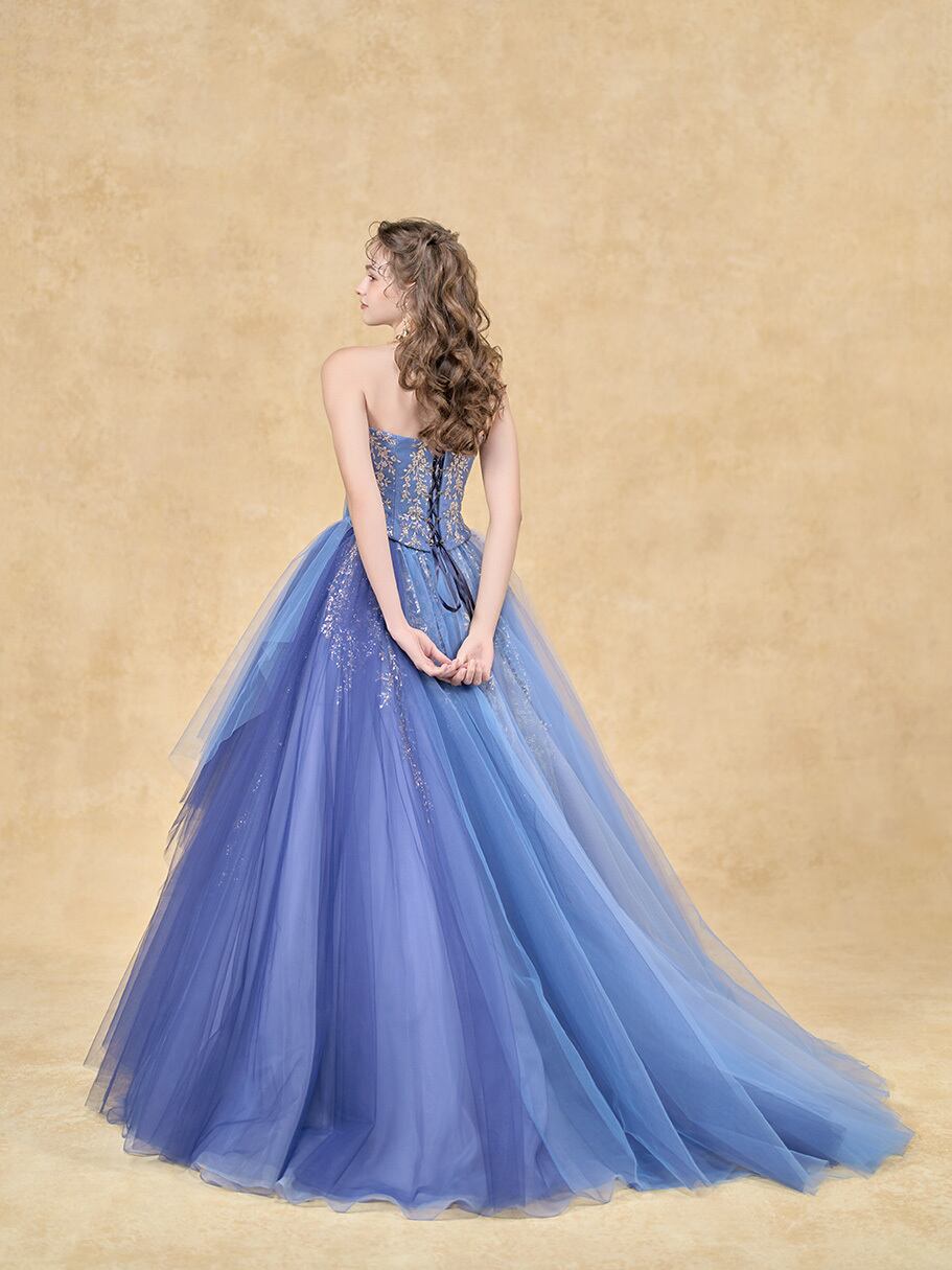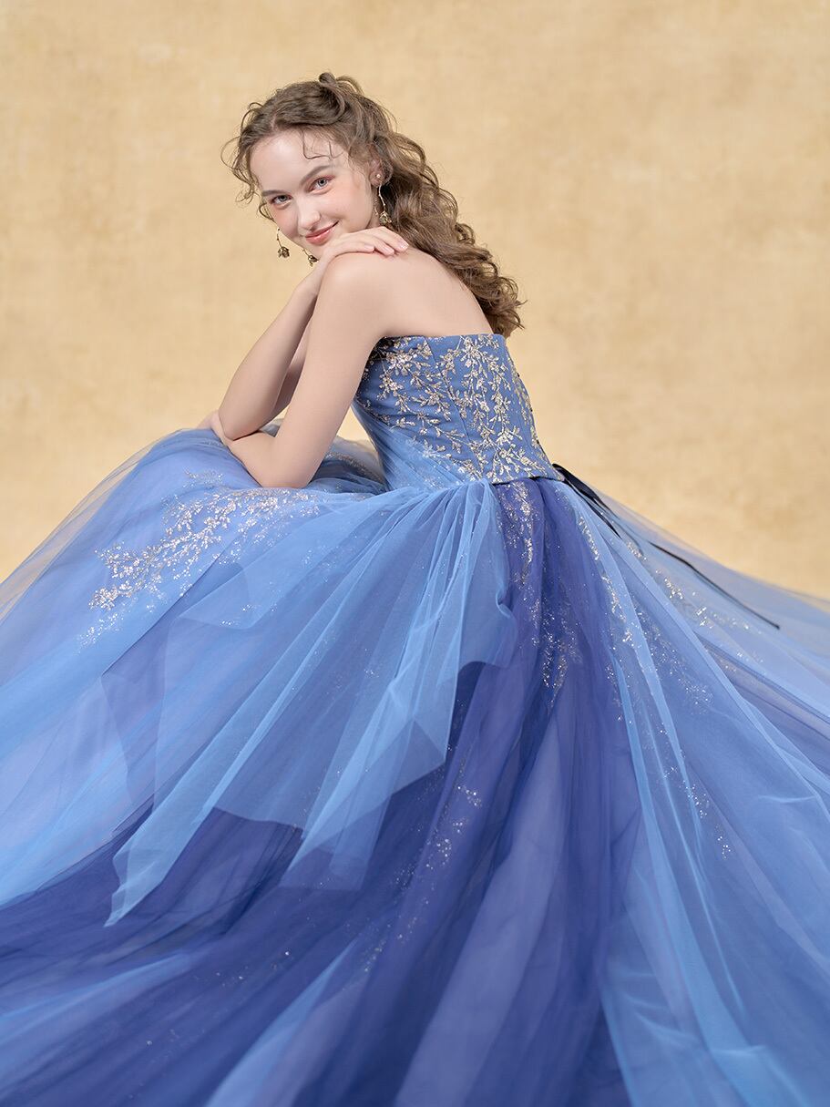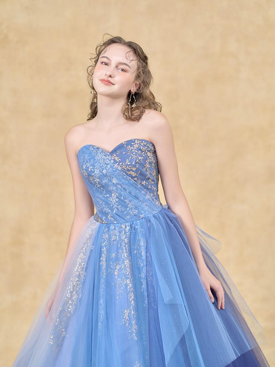 上品!青色 ブルーのグラデーション 枝花刺繍 カラードレス パーティードレス ビスチェドレス フリル ミディアムドレス コンサート 繊細レース 演奏会/前撮り