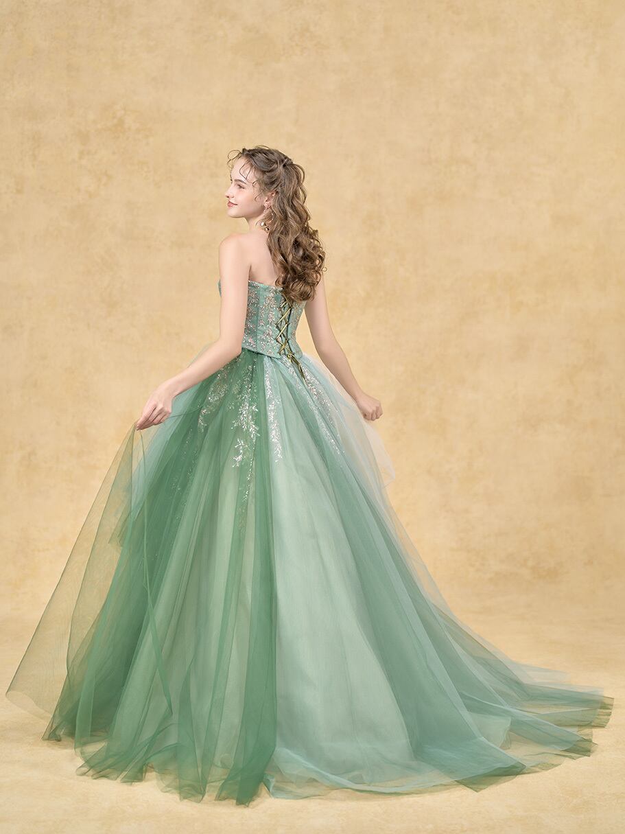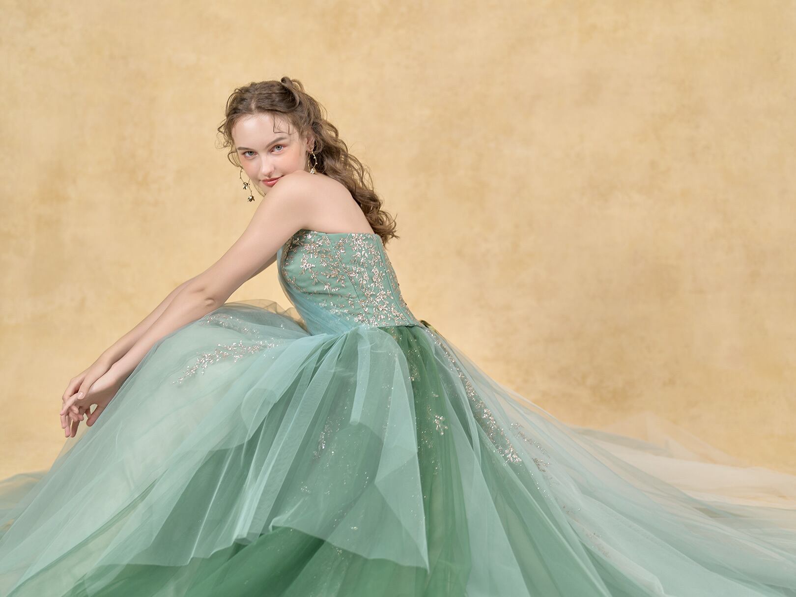 上品!緑色 グリーンのグラデーション 枝花刺繍 カラードレス パーティードレス ビスチェドレス フリル ミディアムドレス コンサート 繊細レース 演奏会/前撮り | David1021k Dress(ダヴィドレス)