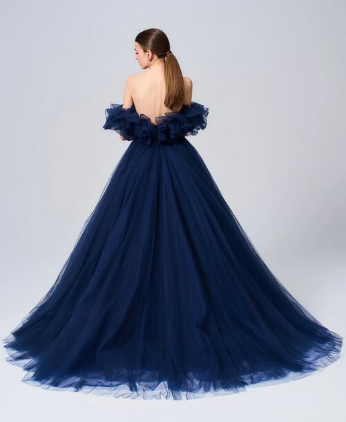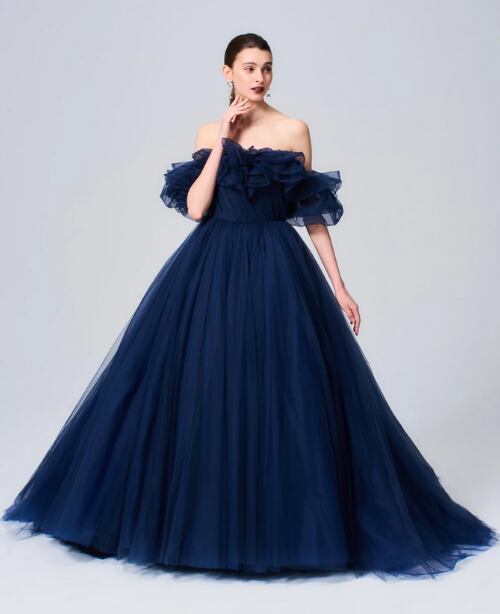 美品!フリルオフショルダー ネイビーブルー ダークブルー パーティードレス カラードレス 柔らかく重ねたチュールドレス イブニングドレス 前撮り/コンサート/教会式 | David1021k Dress(ダヴィドレス)