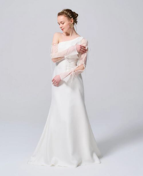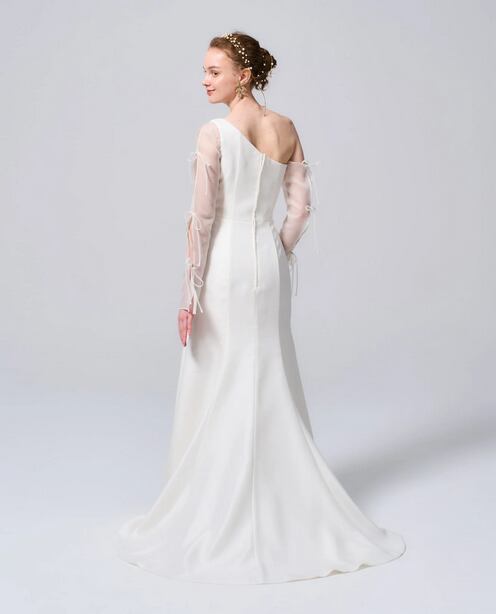 美品!ロングスリーブ ソフトマーメイドドレス ウエディングドレス ワンショルダー パーティードレス スレンダー トレーン 前撮り/コンサート/演奏会 | David1021k Dress(ダヴィドレス)