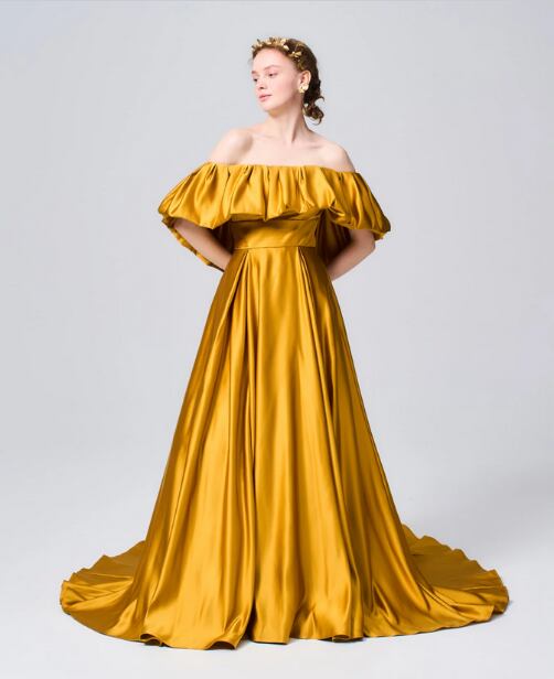 美品!イエロー マスタード色 黄色 カラードレス オフショルダー Aラインドレス シック ロングトレーン パーティードレス ナイトドレス 前撮り/コンサート/二次会 | David1021k Dress(ダヴィドレス)