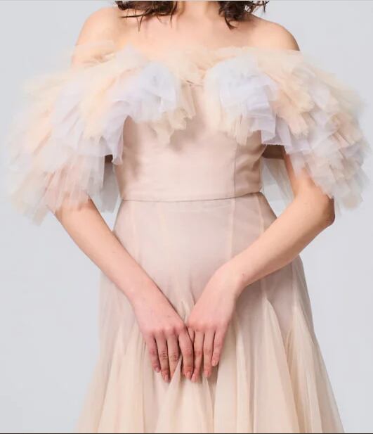 美品!2色フリルオフショルダー カラードレス シャンパン色 ピンク ソフトマーメイドドレス ソフトチュール ロングトレーン パーティードレス 花嫁/前撮り/結婚式/披露宴 | David1021k Dress(ダヴィドレス)