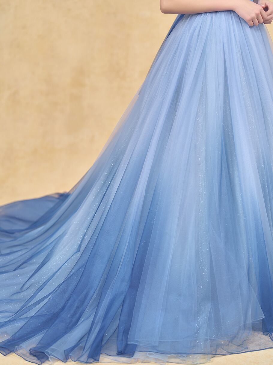 美品!勿忘草色キラキラカラードレス ブルーのグラデーション スカイブルー 青 バックリボン オフショルダー チュールドレス パーティードレス 花嫁/コンサート/前撮り | David1021k Dress(ダヴィドレス)