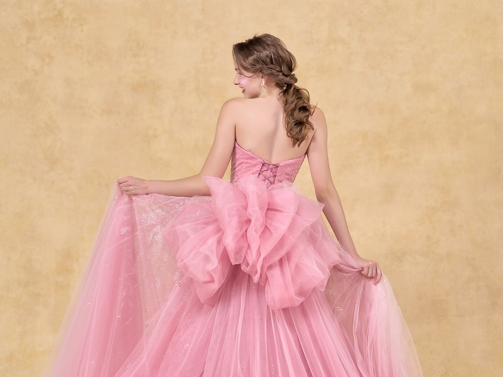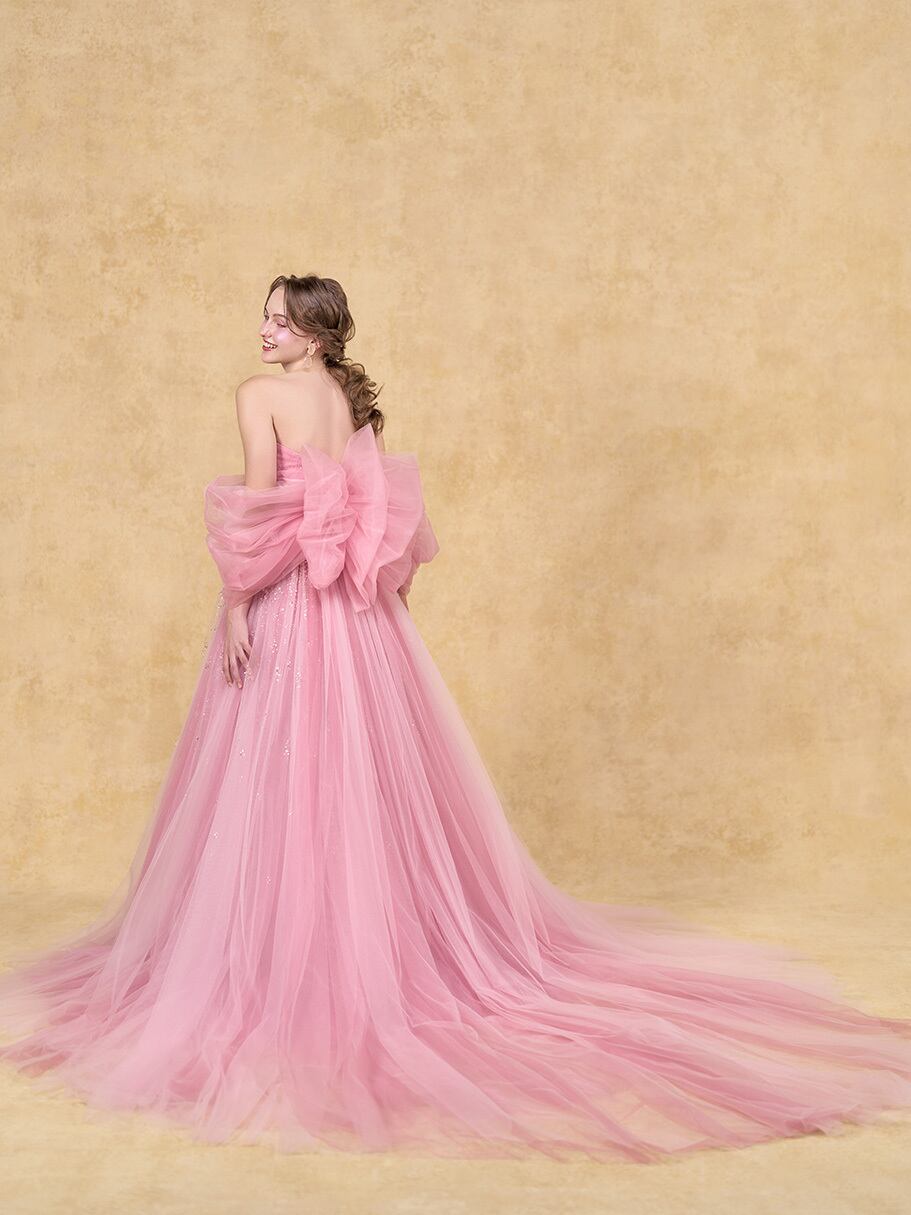 美品!シクラメンピンク 撫子色カラードレス 付け袖 ふわふわバックリボン チュールドレス パーティードレス 花嫁/コンサート/前撮り