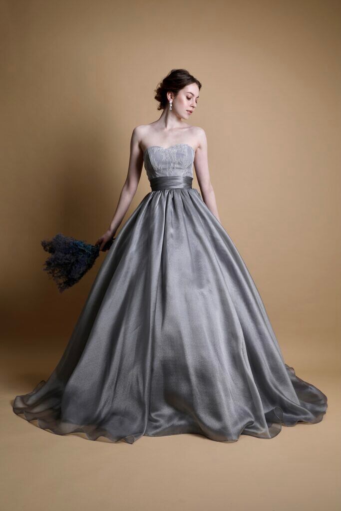 高品質!薄グレー 灰色 カラードレス 上質オーガンジー ふんわりとした優しい風合い パーティードレス ナイトドレス 合コン/コンサート/前撮り/ピアノ演奏会 | David1021k Dress(ダヴィドレス)