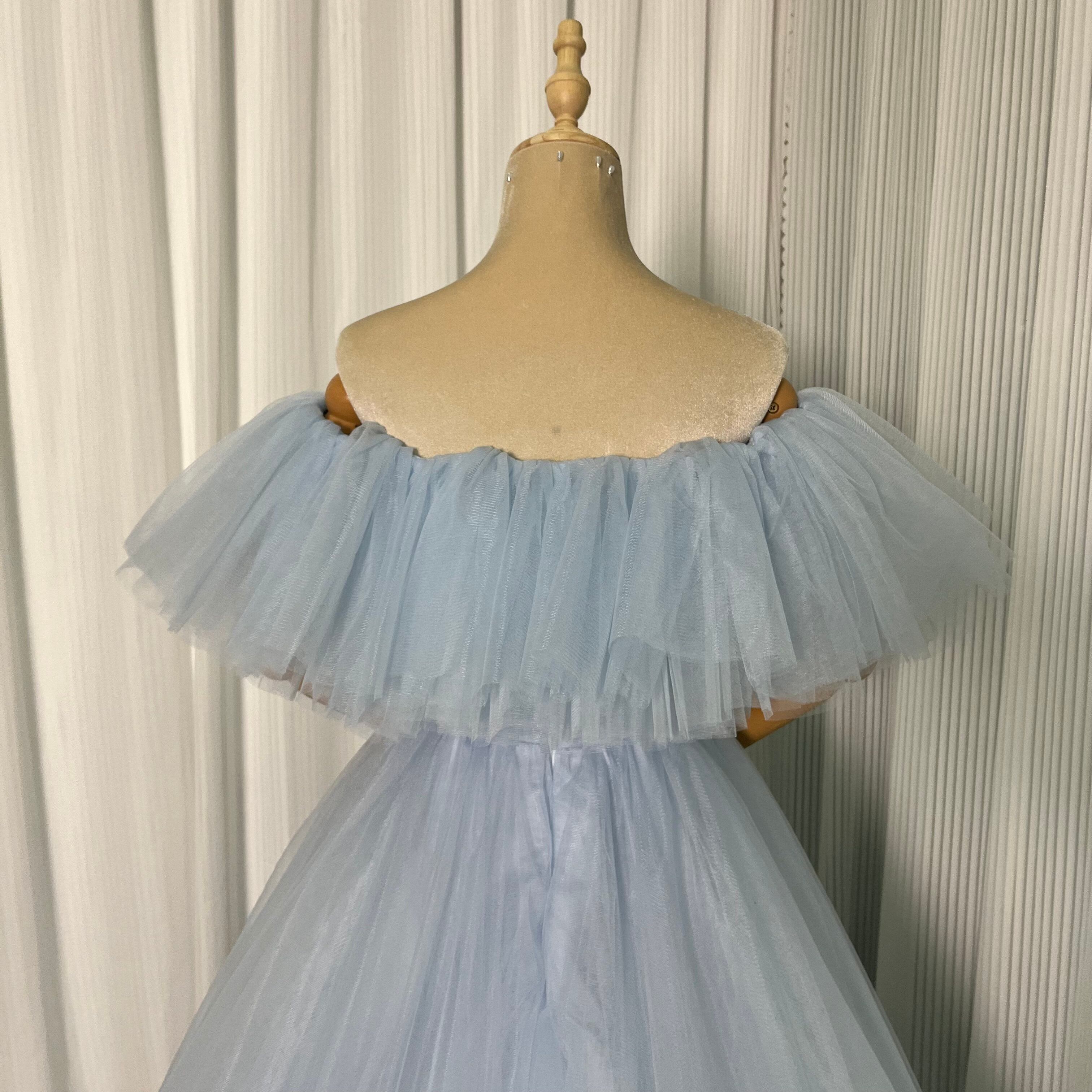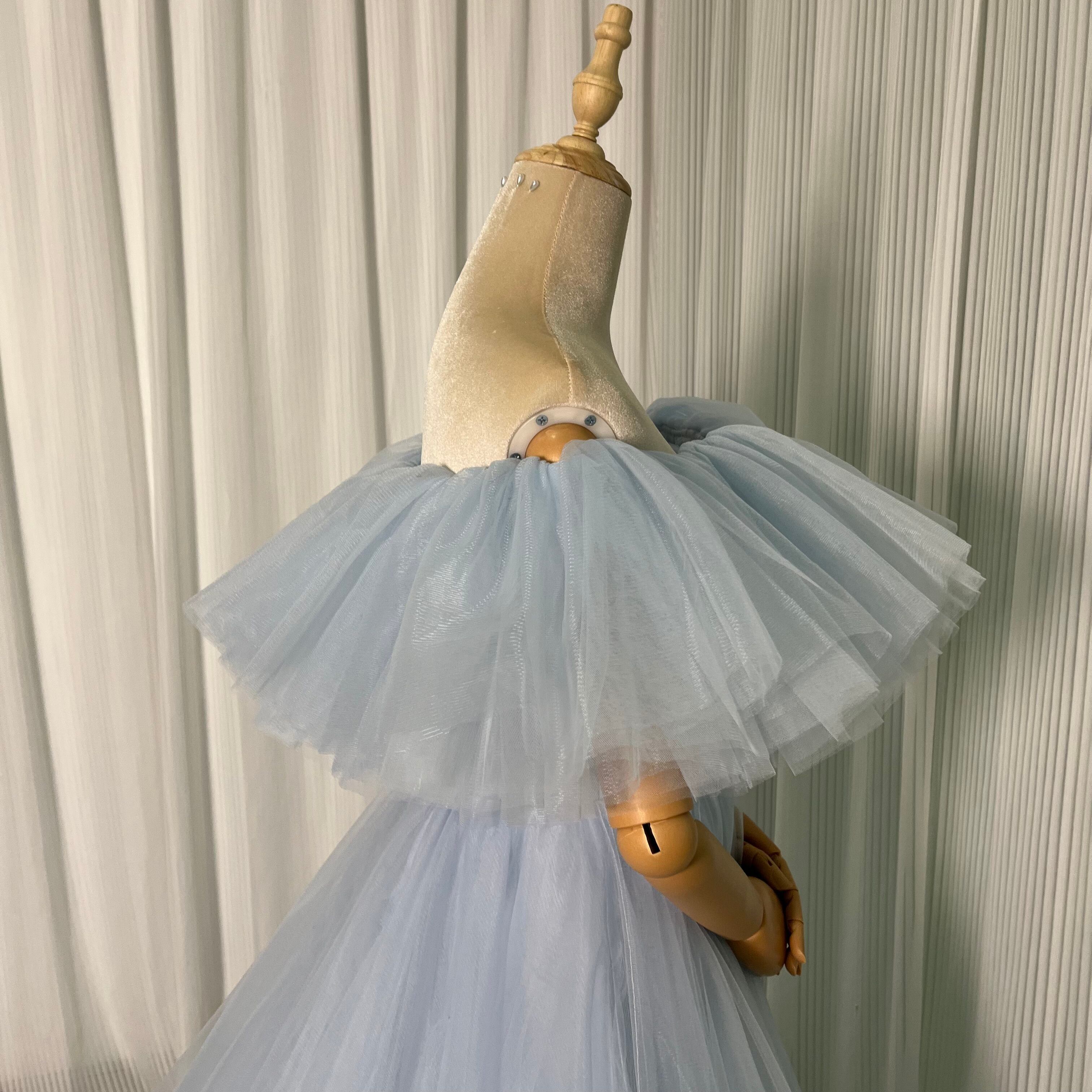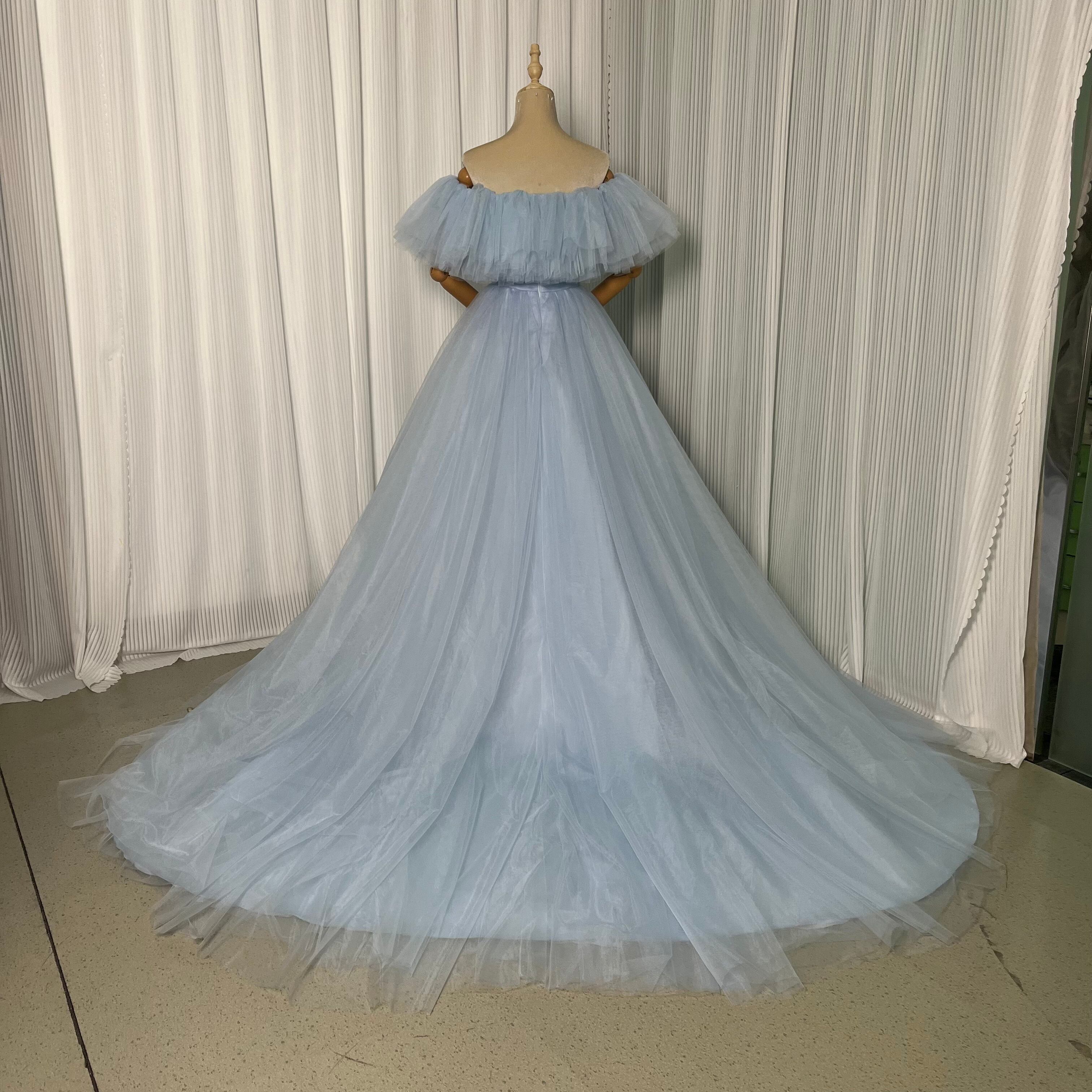 美品!青 オフショルダーカラードレス ロングトレーン パーティードレス 前撮り/ダンスドレス