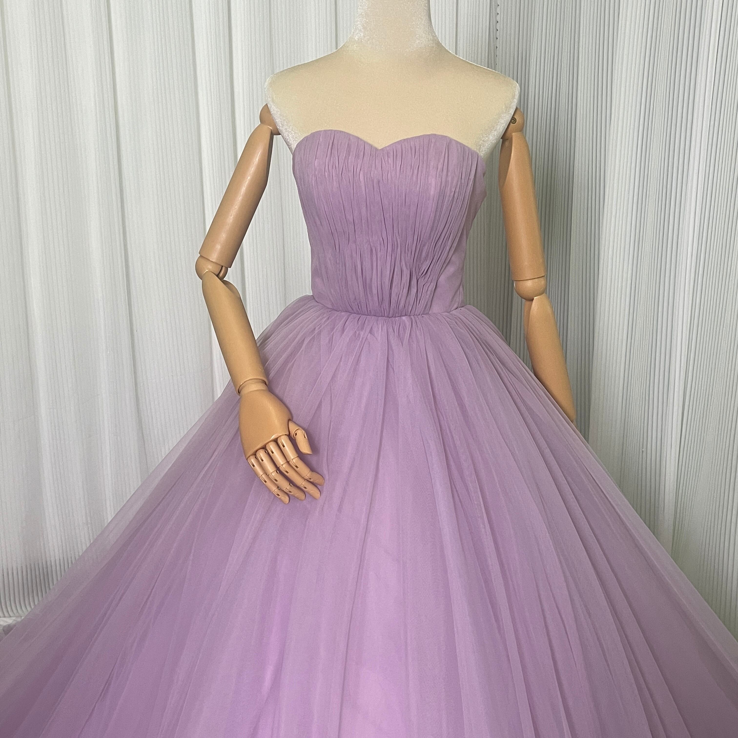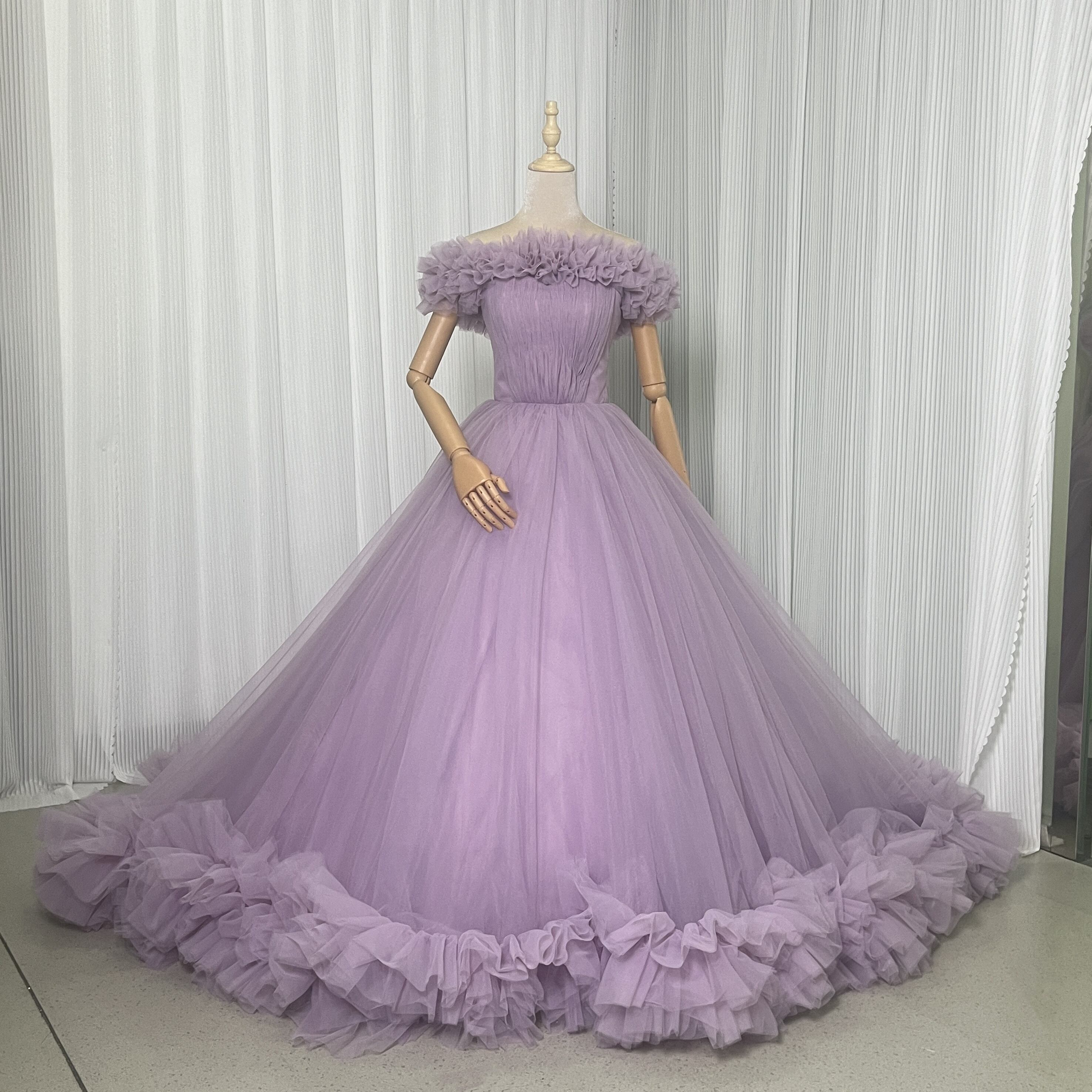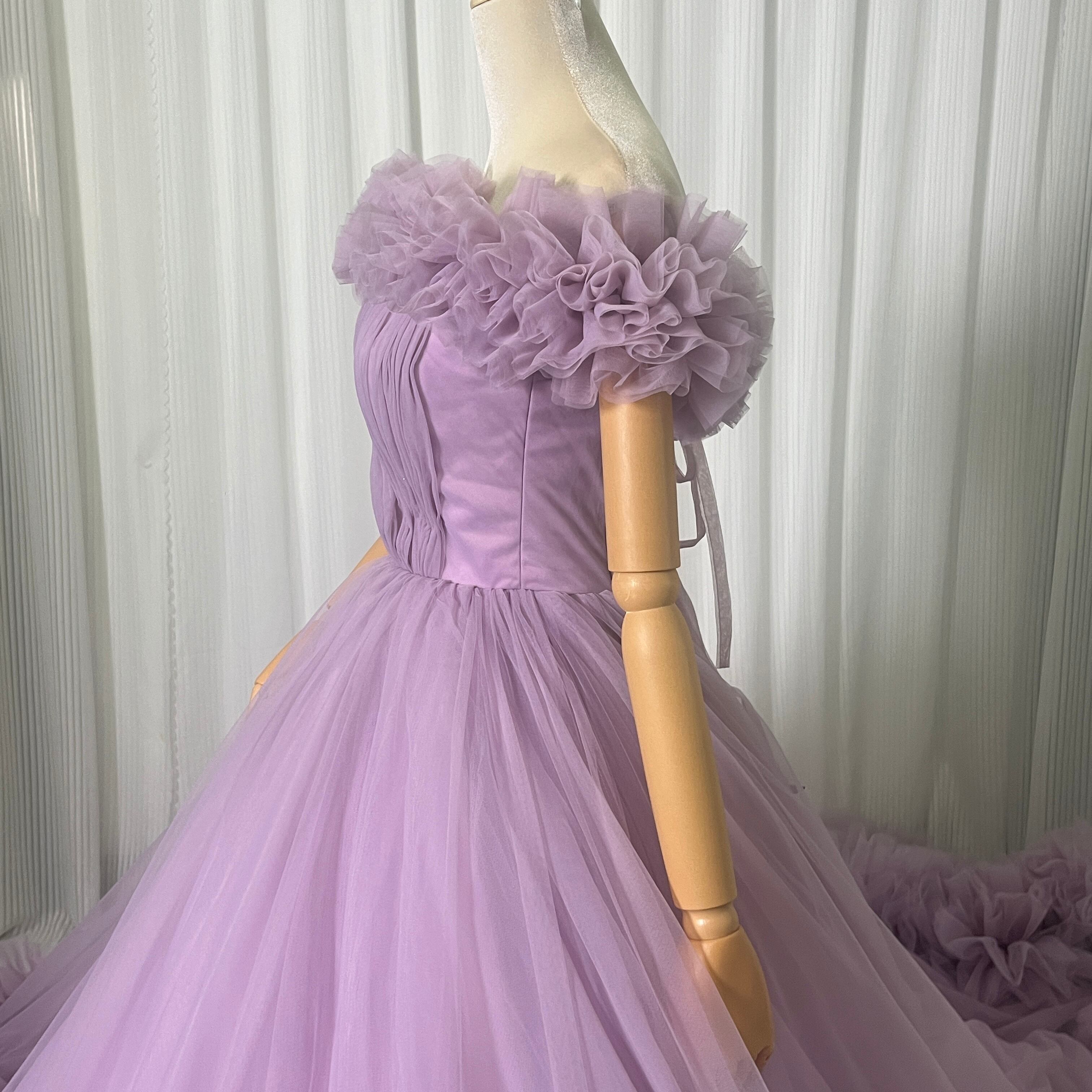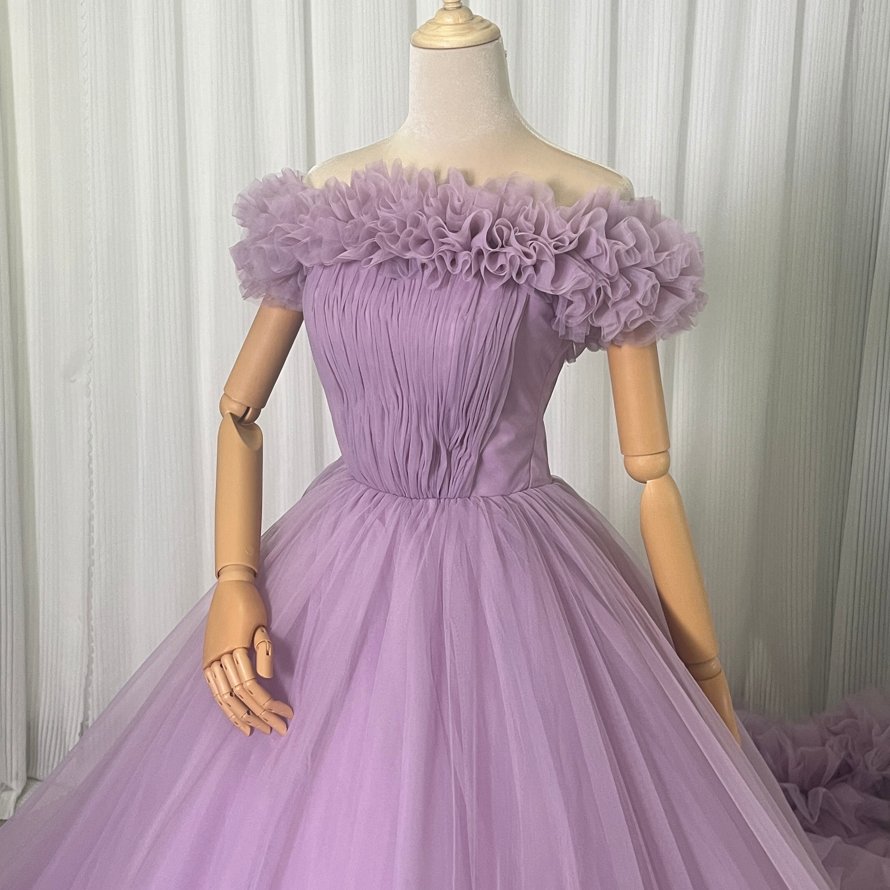 人気上昇!紫 取り外しオフショルダー カラードレスソフトチュール 華やかなトレーン フレアスカート結婚式/披露宴/前撮り