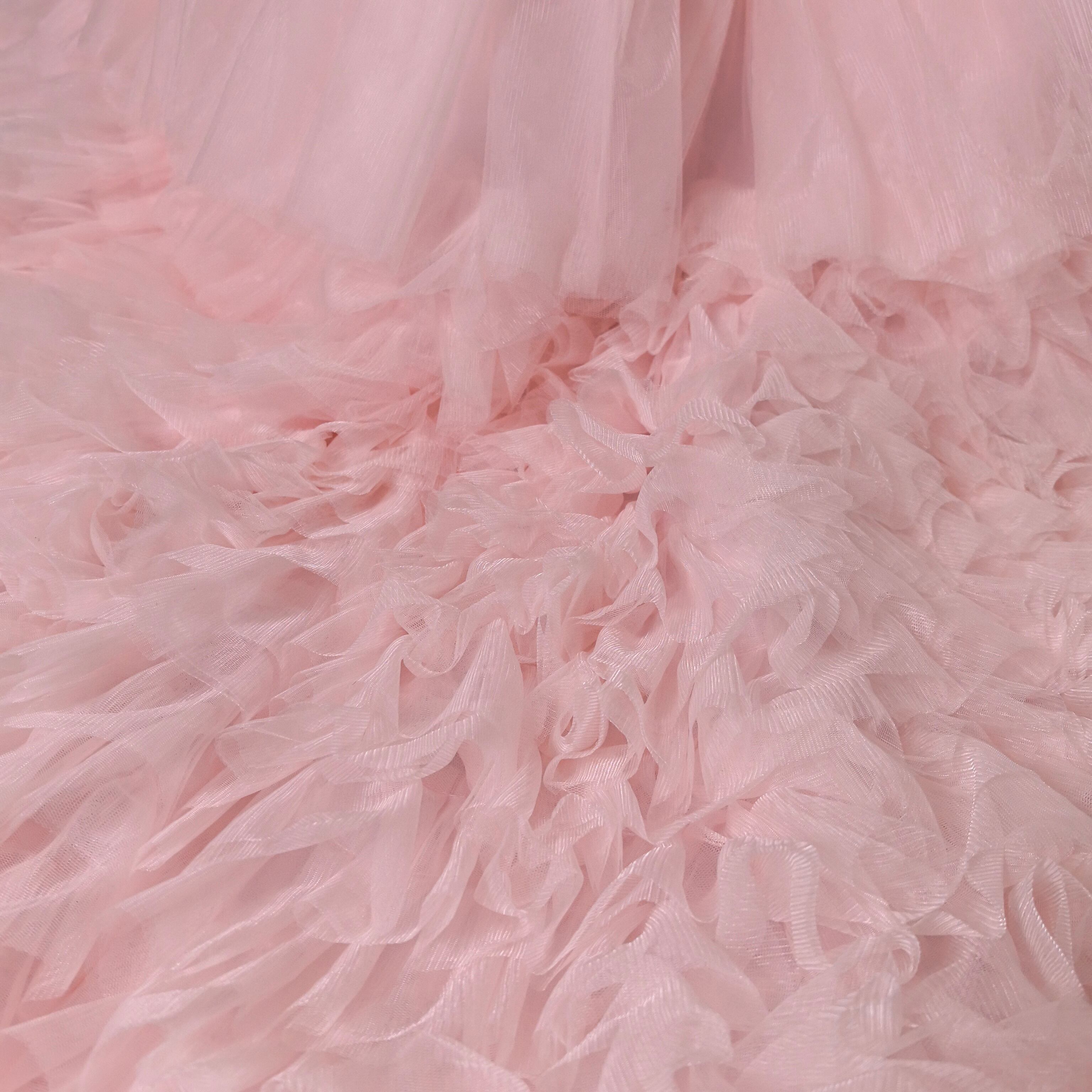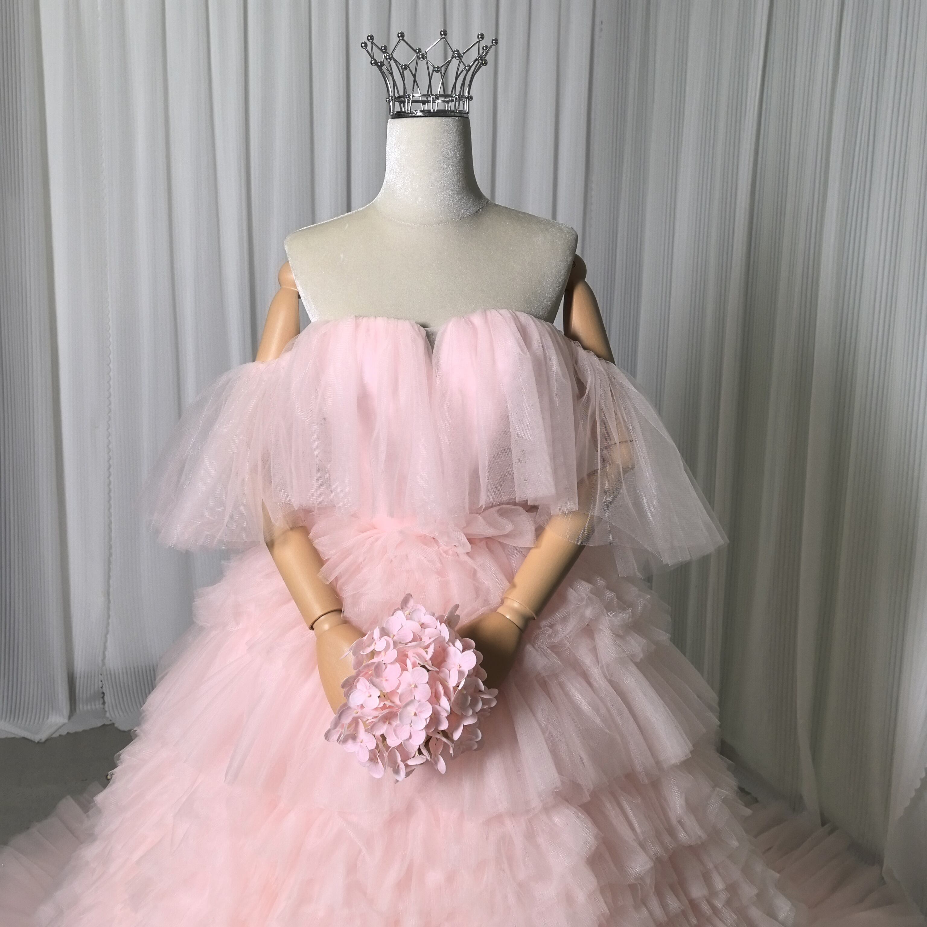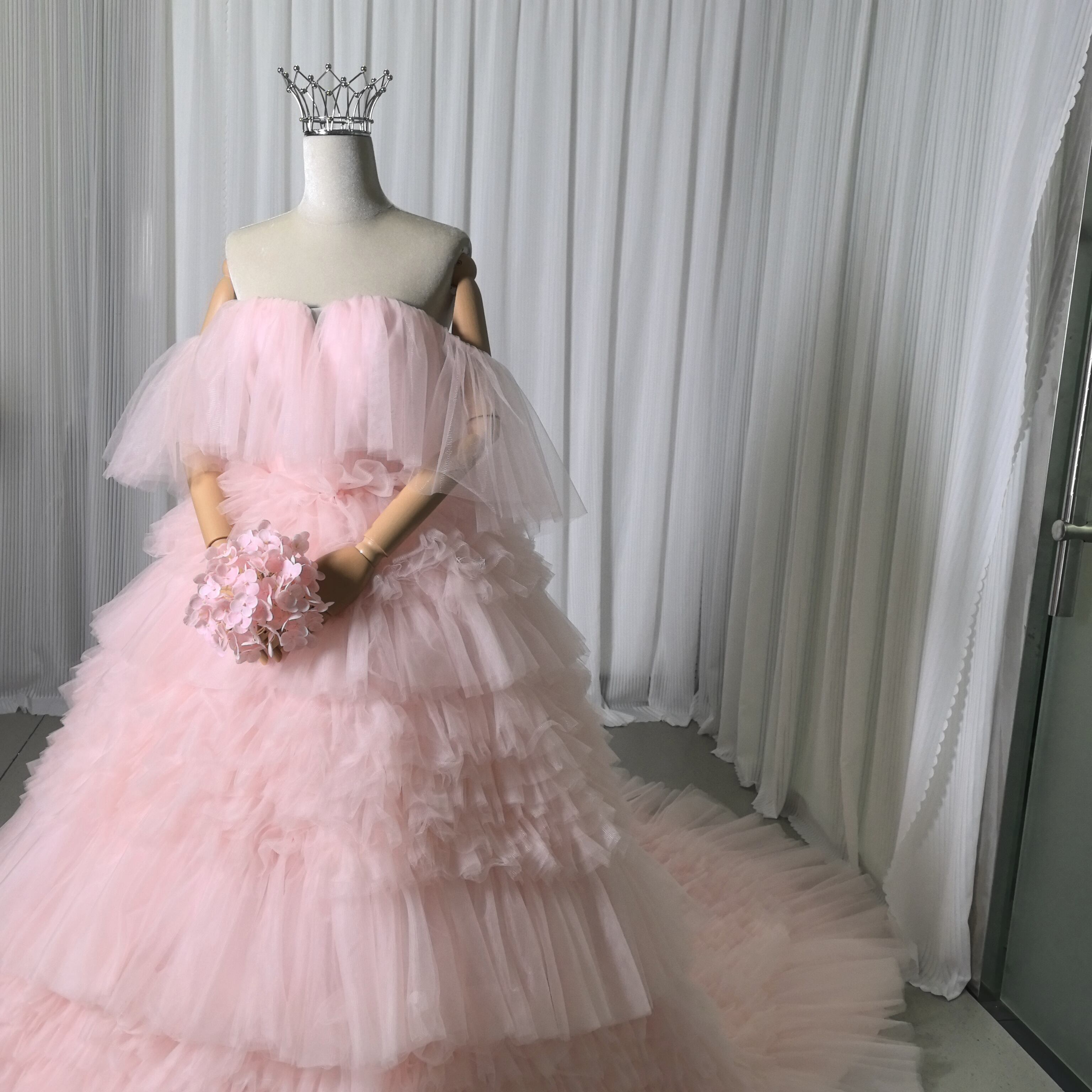 もこもこピンクカラードレス チュールドレス フリルオフショルダー お色直し ふわふわ ボリュームドレス