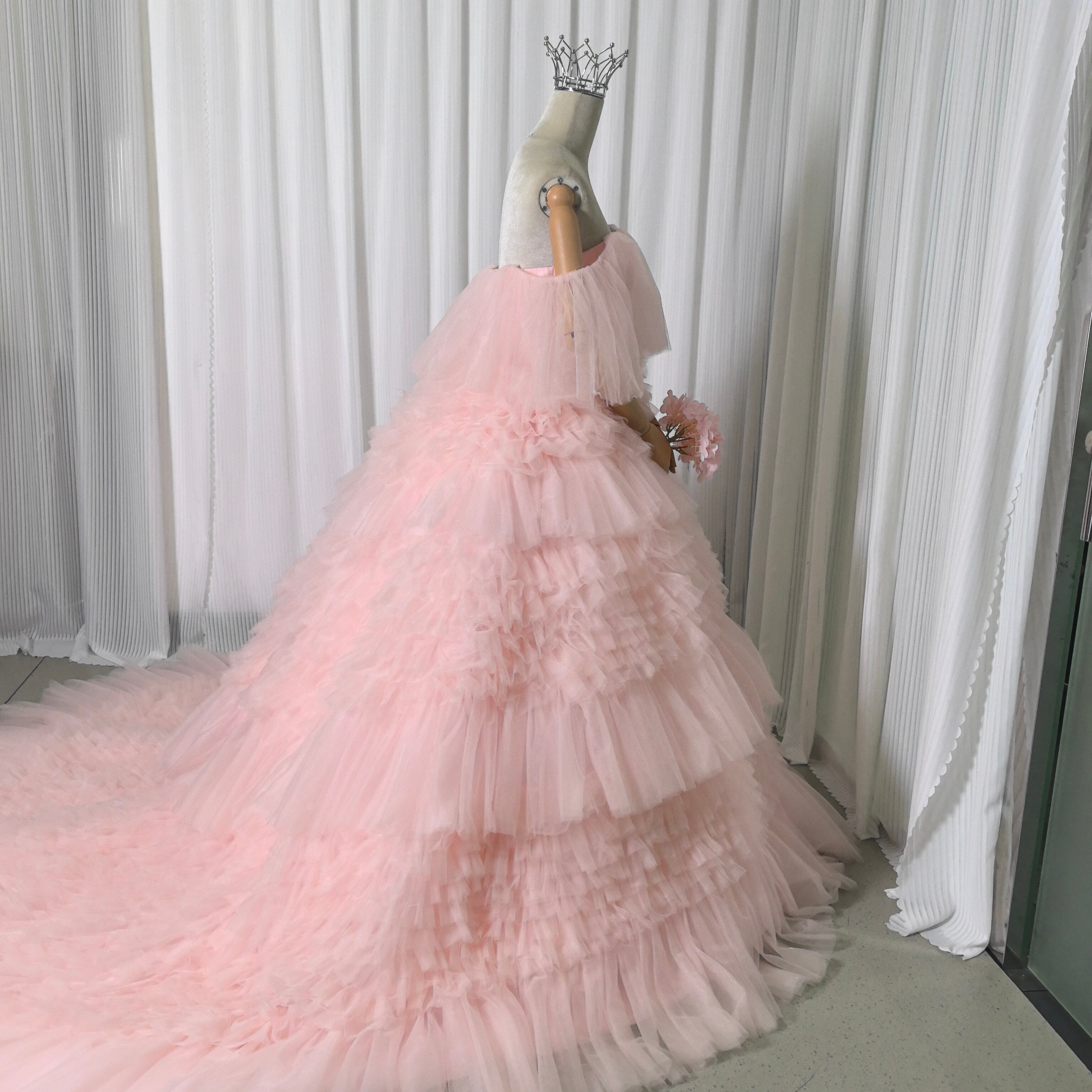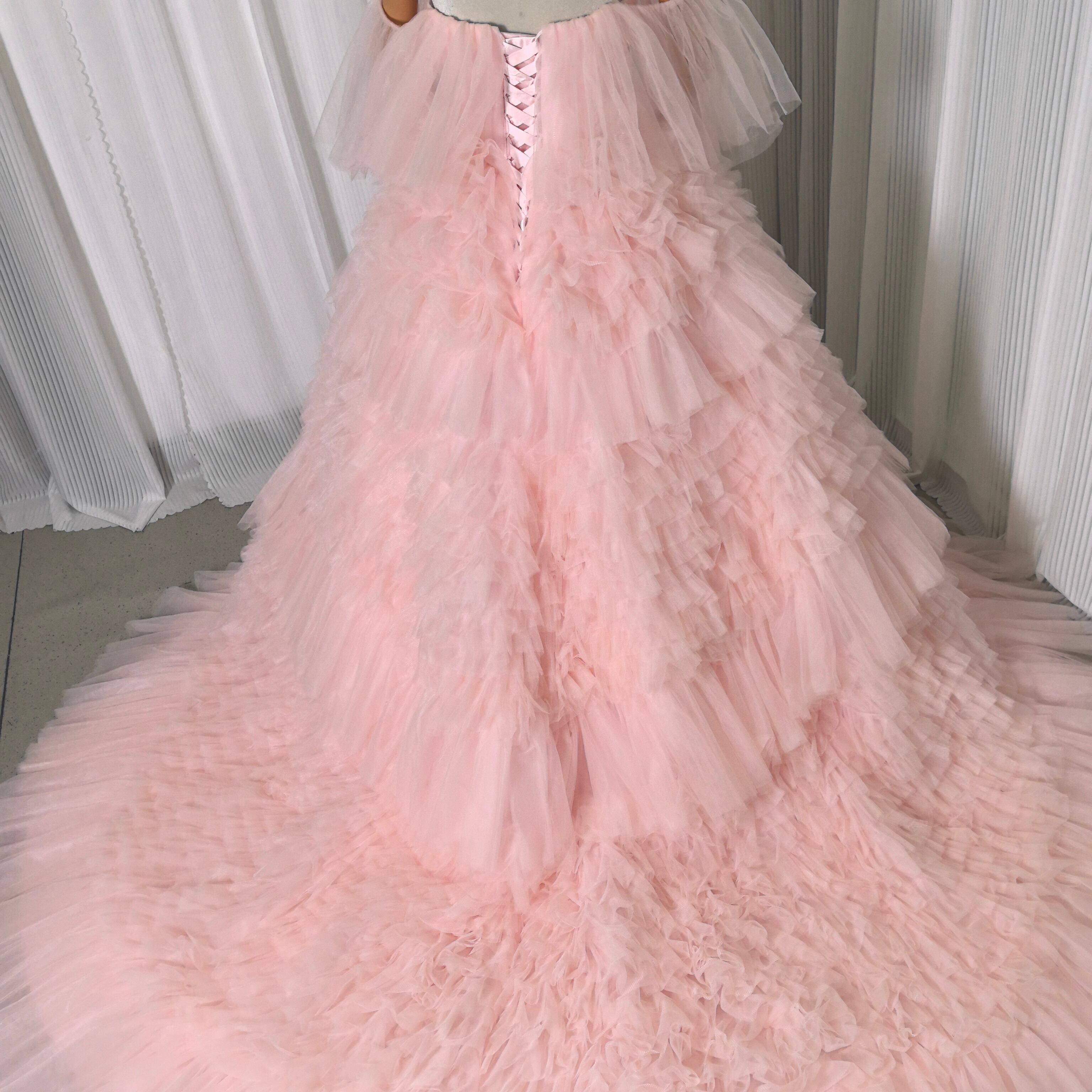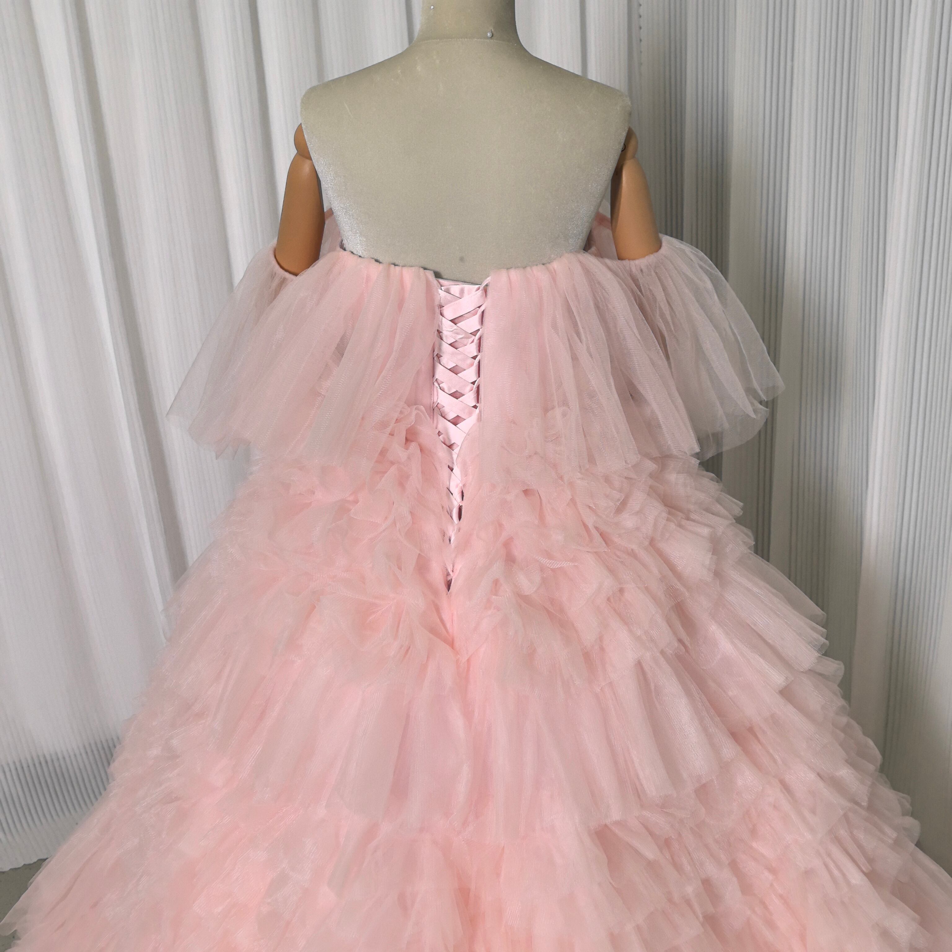 もこもこピンクカラードレス チュールドレス フリルオフショルダー お色直し ふわふわ ボリュームドレス