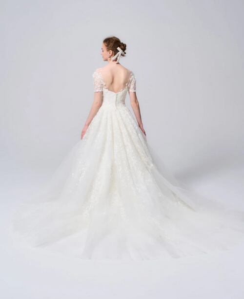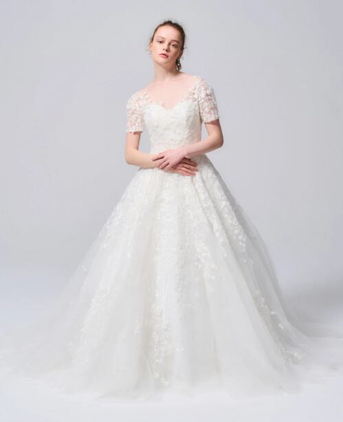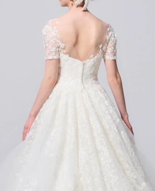 美品!オーダーメイド!3D立体レース刺繍 繊細小花レースドレス 半袖 ウエディングドレス Aラインドレス ハンドメイド ロングトレーン 前撮り/教会式 | David1021k Dress(ダヴィドレス)