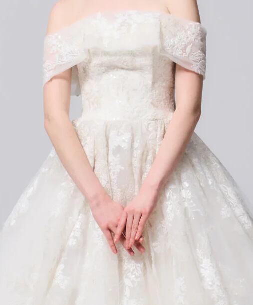 美品!繊細レースドレス ウエディングドレス オフショルダー 花モチーフ刺繡 優雅なシルエット Aラインドレス ロングトレーン 前撮り/教会式 オーダーメイド | David1021k Dress(ダヴィドレス)