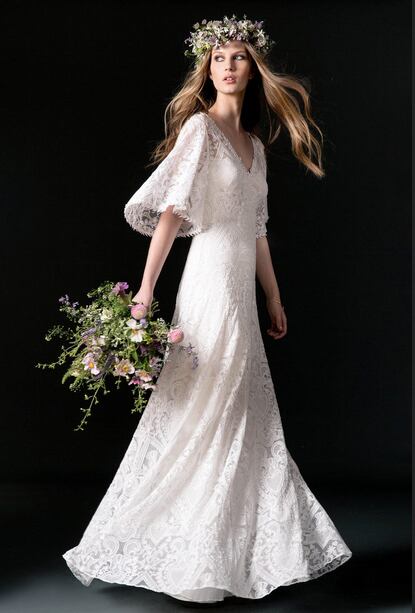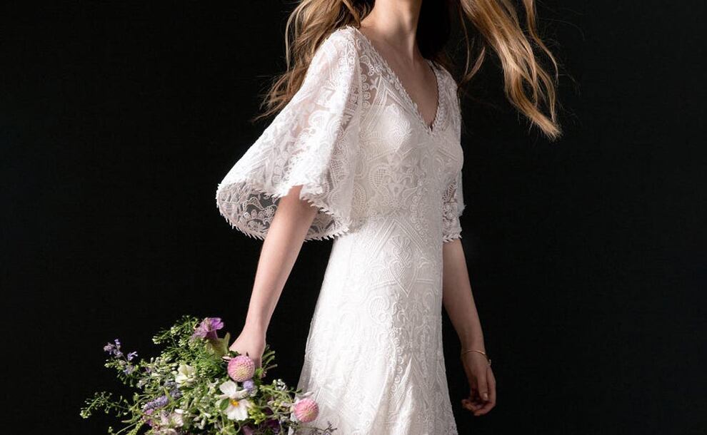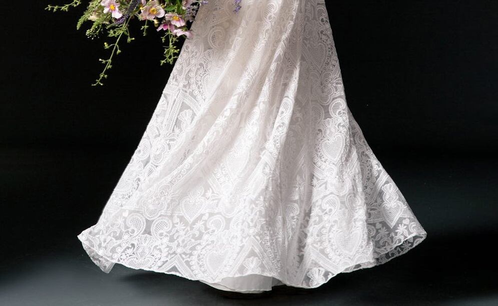 美品!オーダーメイド!ラッフルフリル ウエディングドレス ストレートライン フレアスリーブ 総レースドレス パーティードレス 半袖 vネックドレス ロングトレーン 前撮り/教会式 | David1021k Dress(ダヴィドレス)
