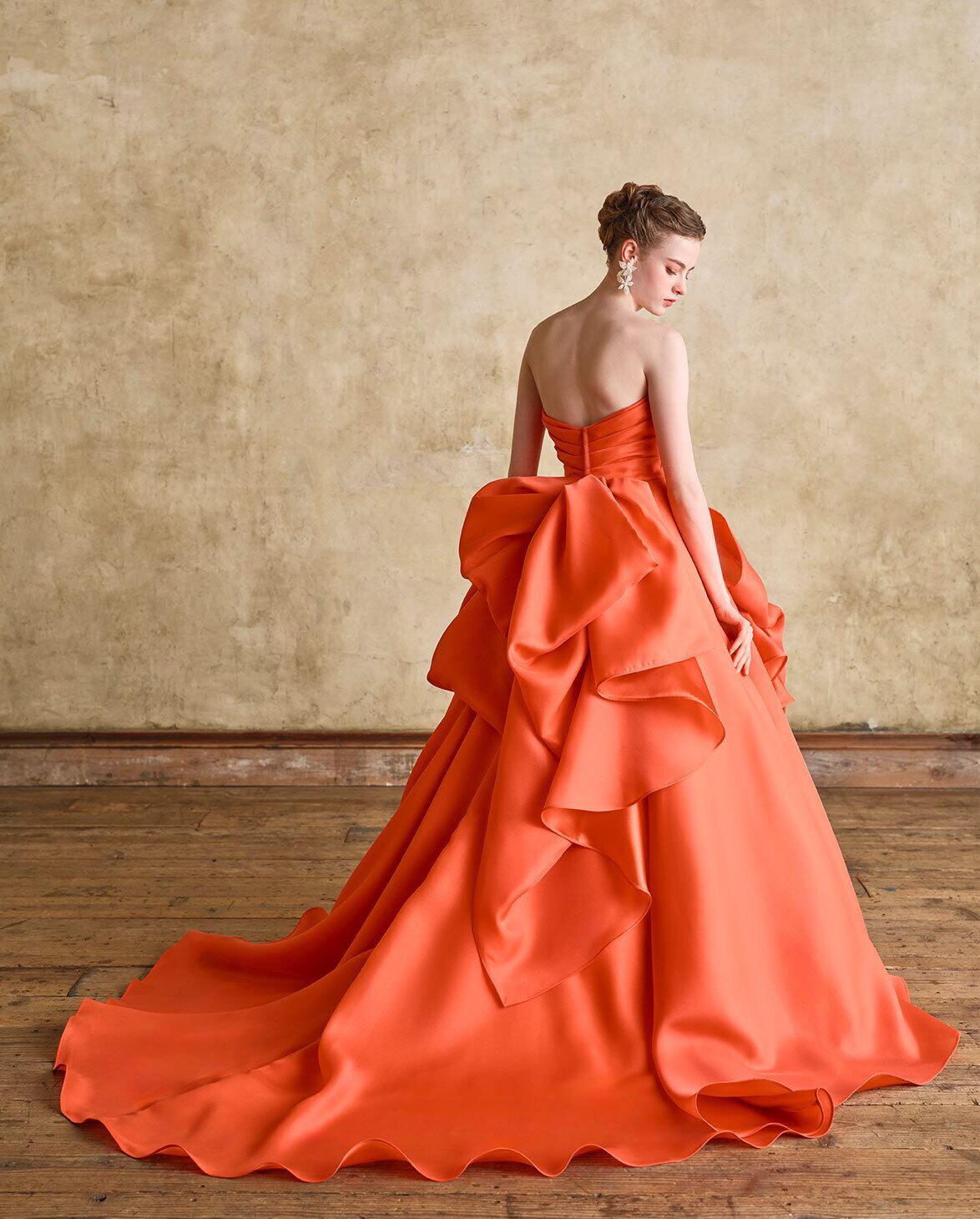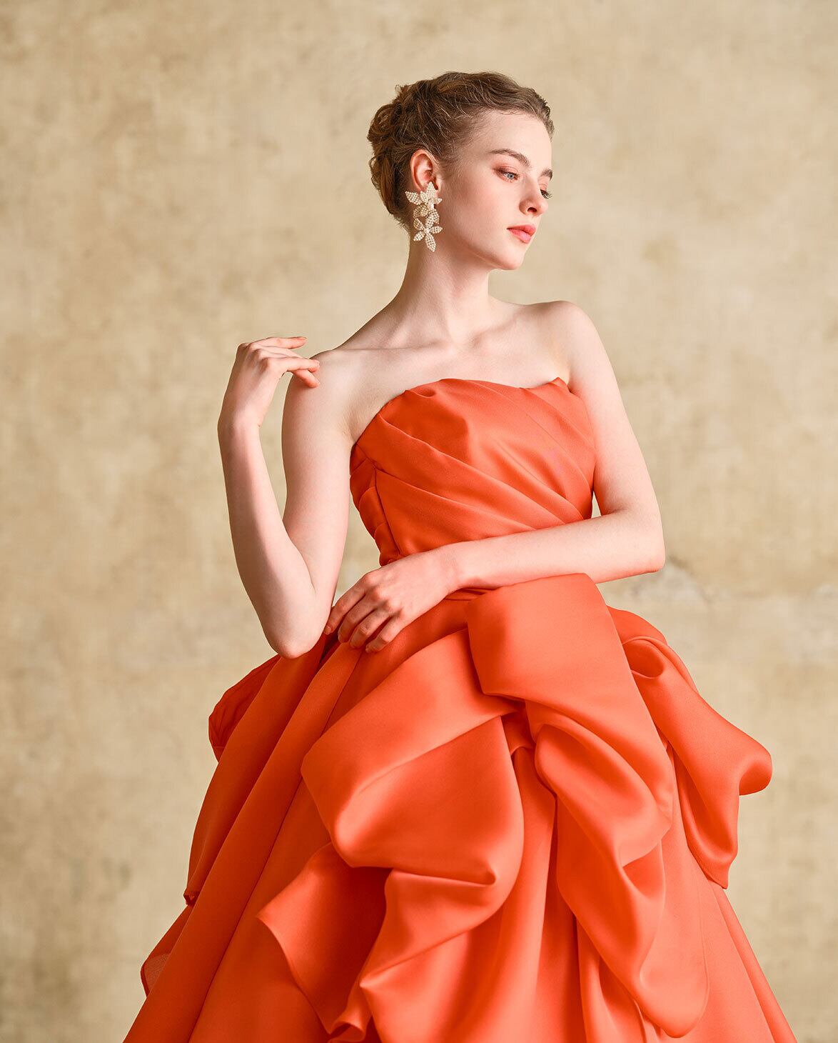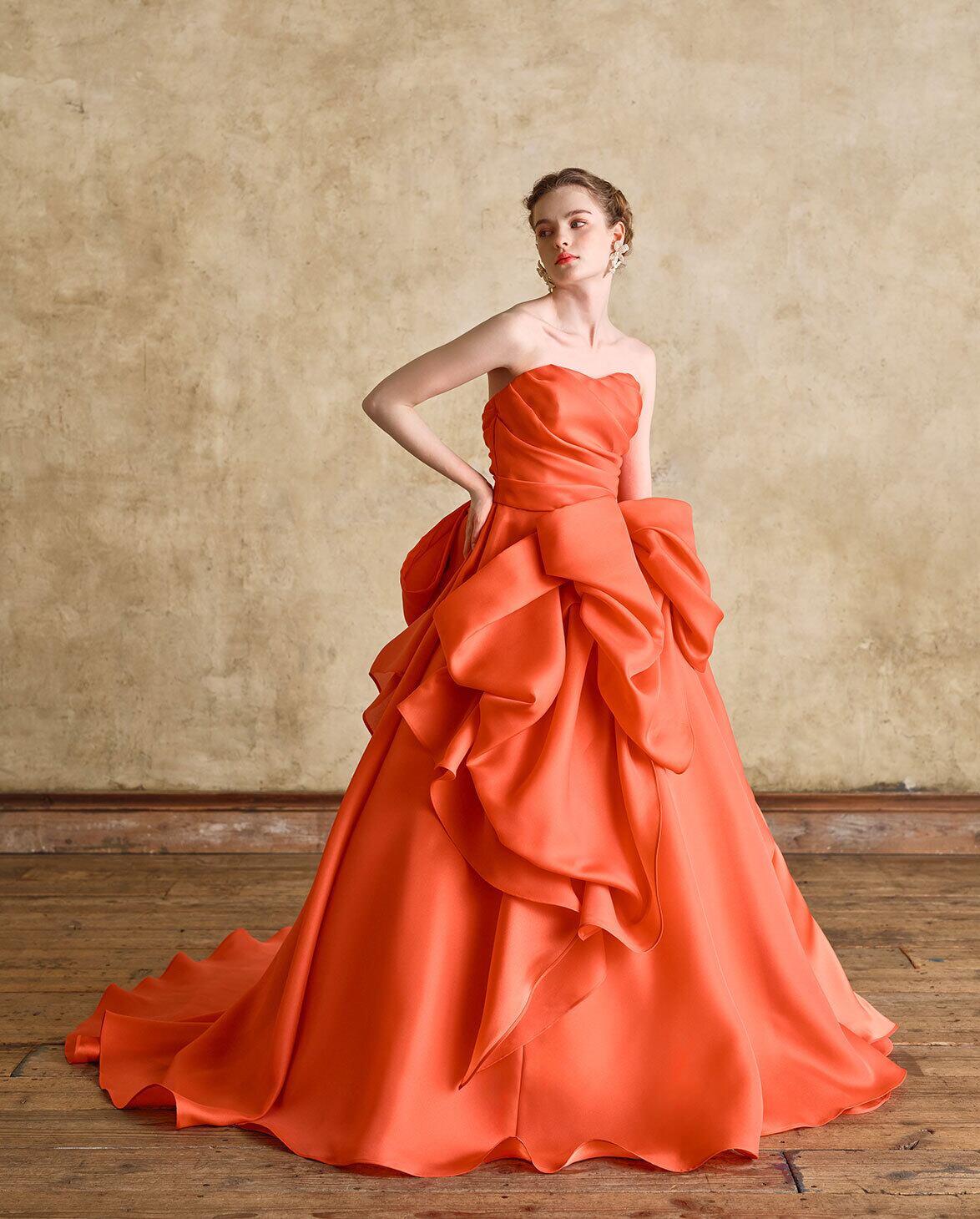 美品!ロイヤル!トレンドカラーのトゥルーオレンジ カラードレス アシンメトリーなデザイン Aラインドレス ビッグライン パーティードレス コンサート 前撮り