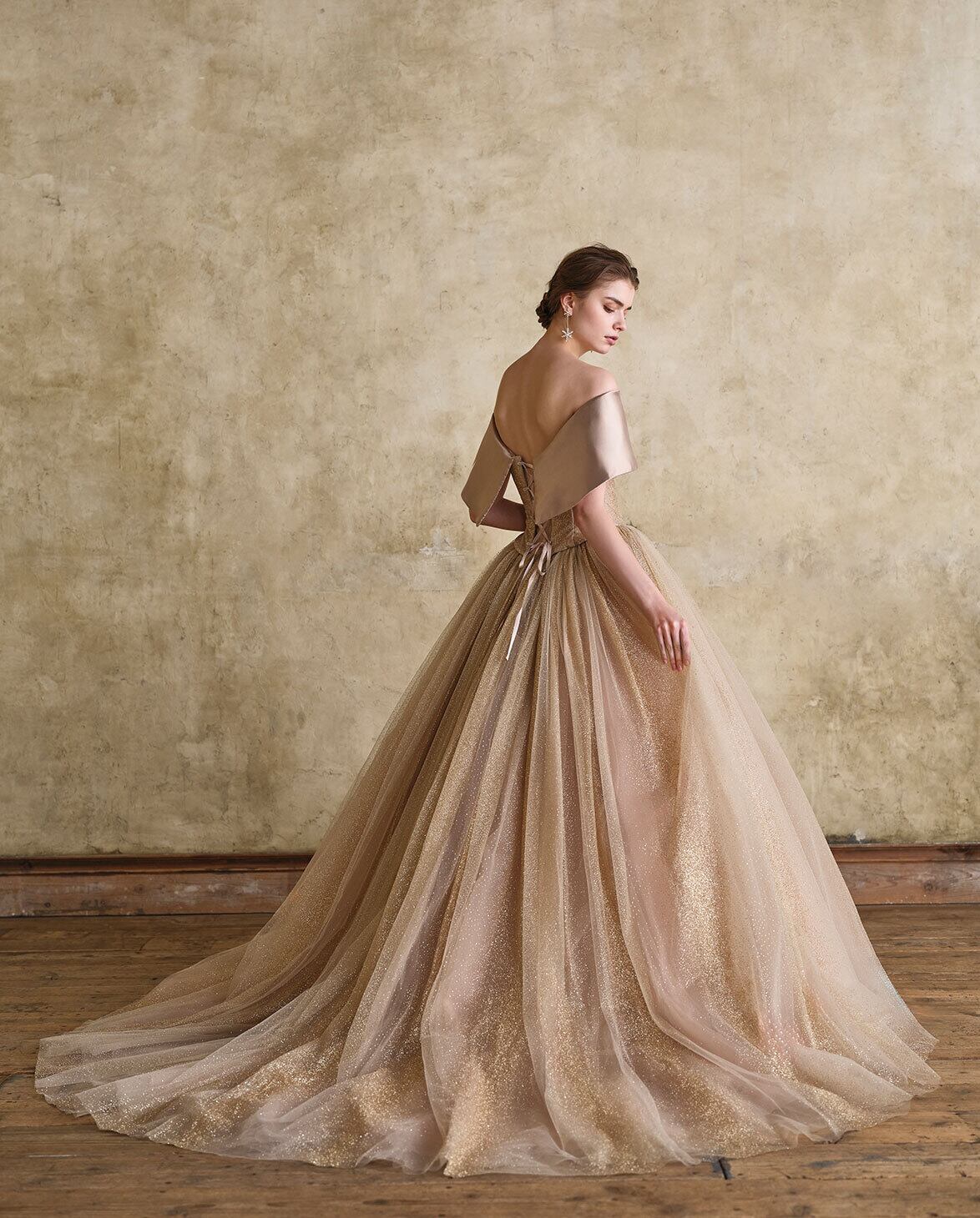 美品!ロイヤル!ゴールドグリッター カラードレス 落ち着いたシャンパンゴールド ショルダー/太幅のケープ キラキラチュールドレス パーティードレス ロールカラー スタイリッシュ 前撮り | David1021k Dress(ダヴィドレス)