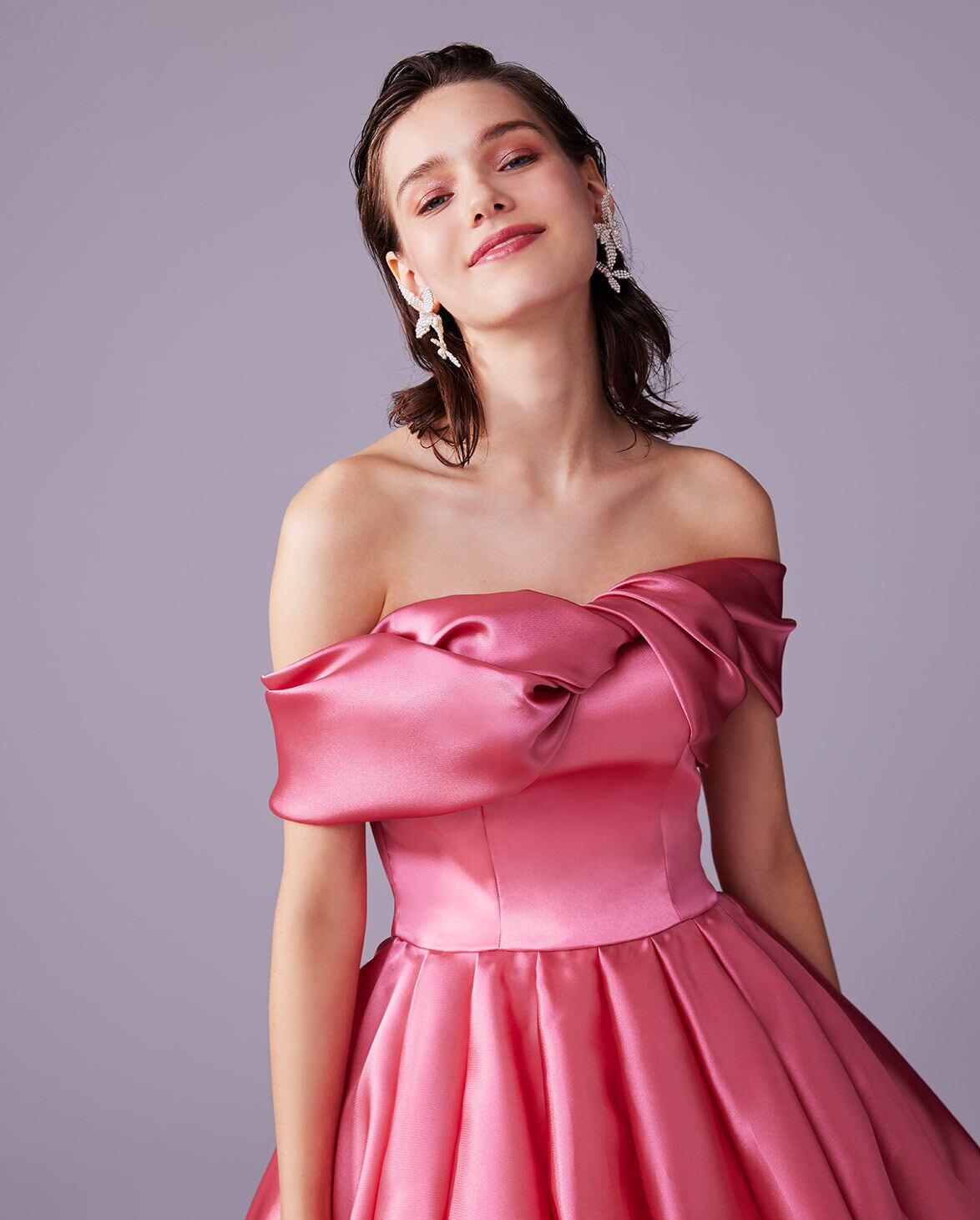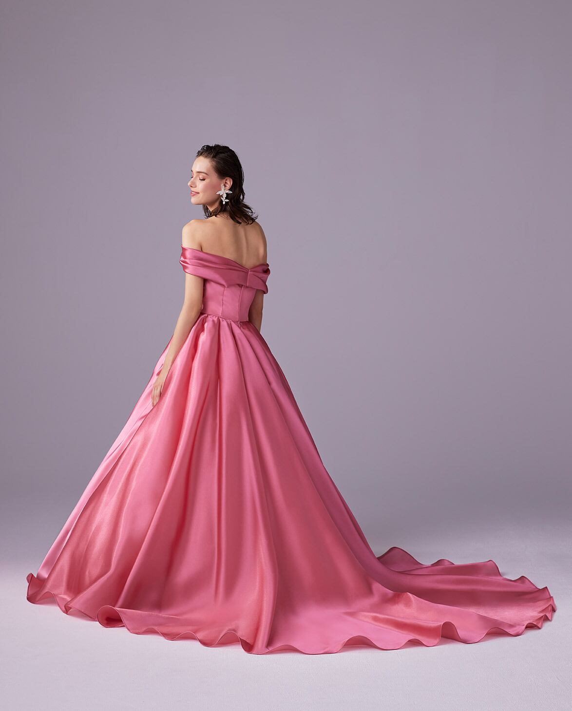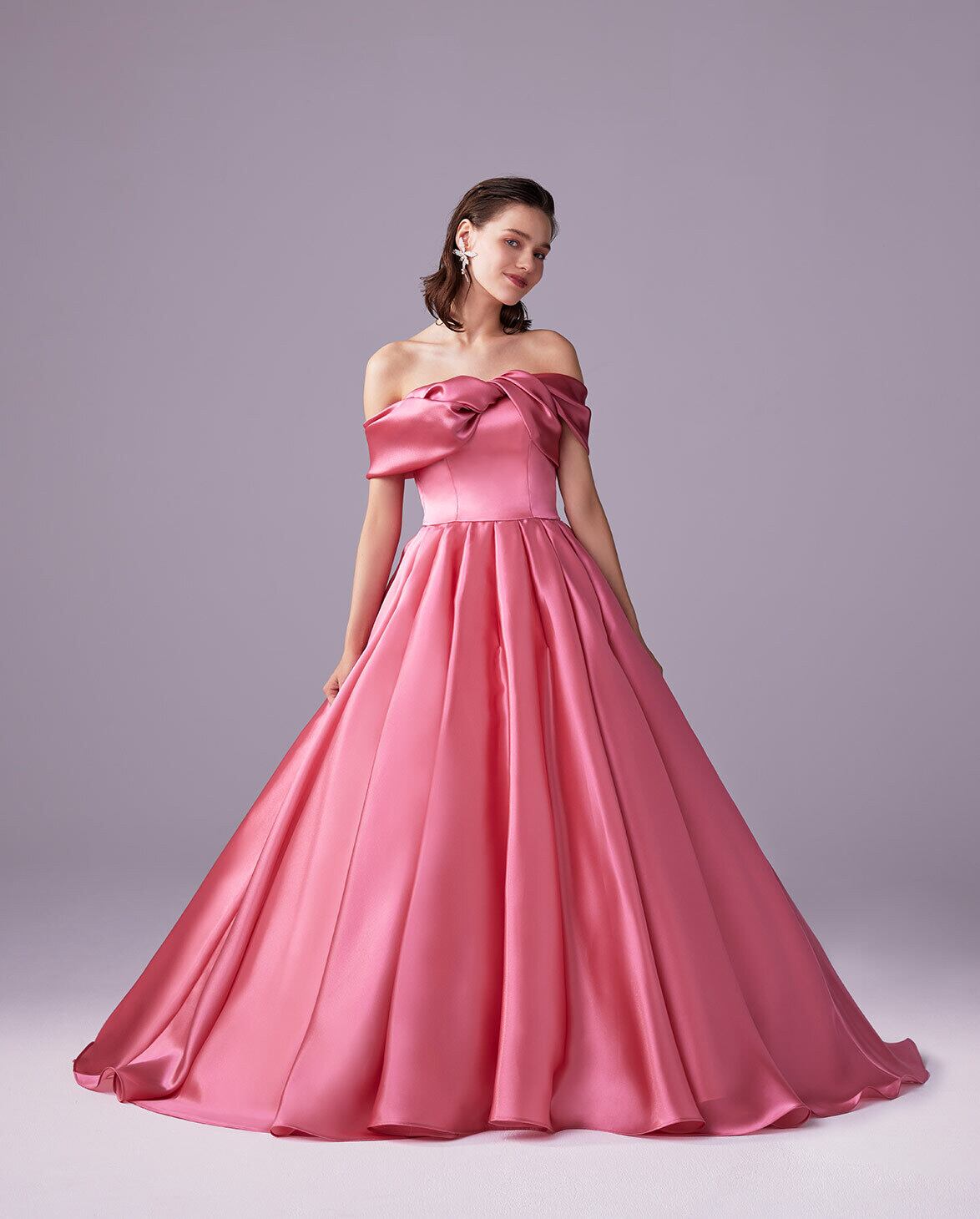 美品!ローズピンク カラードレス ダーツを組み合わせた3Dスカート パーティードレス たっぷりとしたボリュームで華やかなシルエット オフショルダー 前撮り | David1021k Dress(ダヴィドレス)