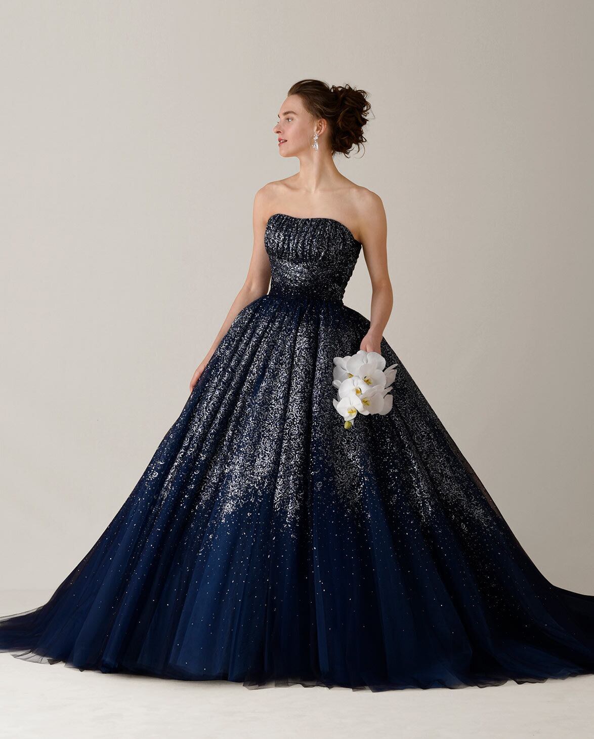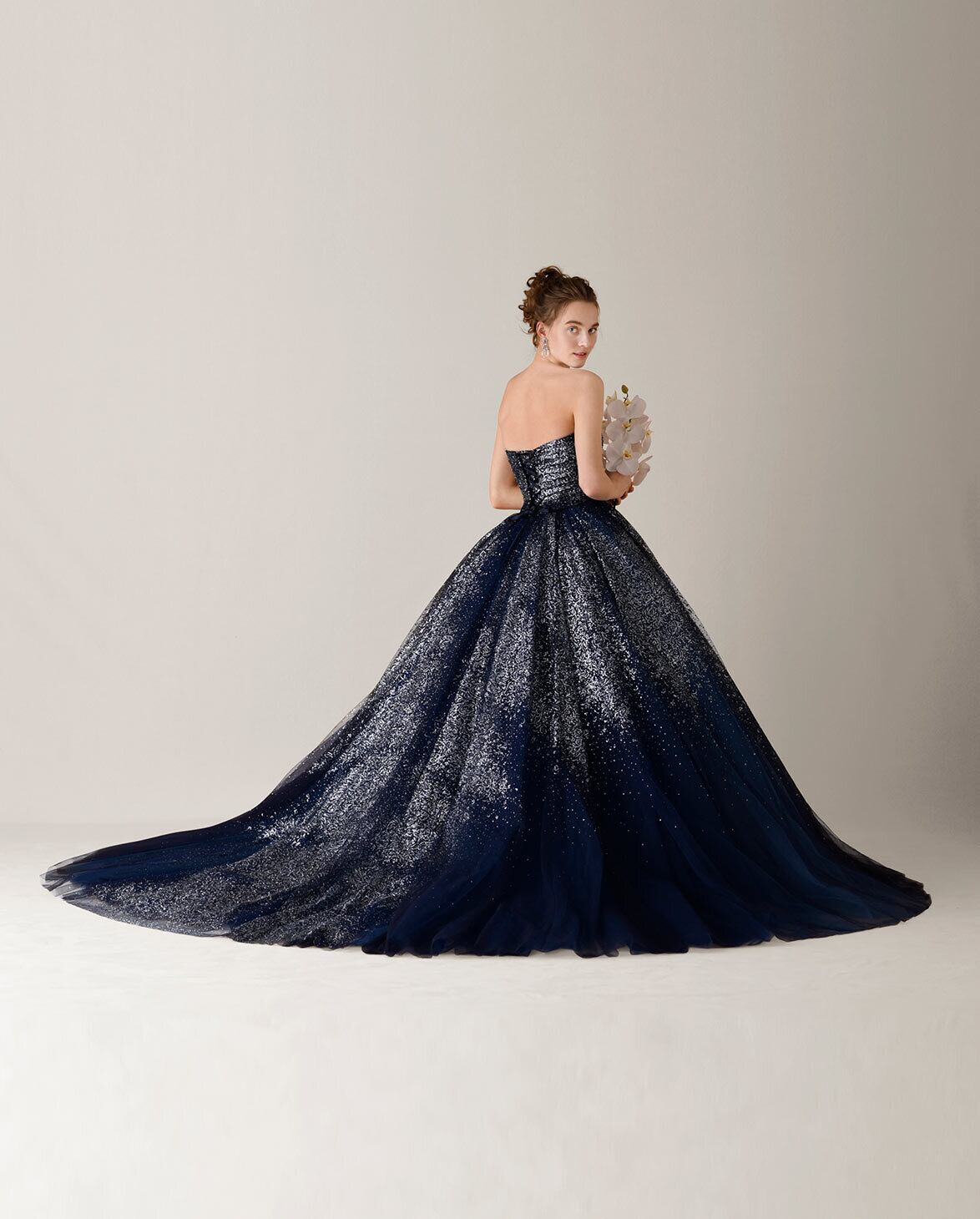 星空みたいなダークネイビーのグリッターチュールドレス カラードレス ロングトレーン パーティードレス メリハリのあるシルエット イブニングドレス/ナイトウエディング/前撮り | David1021k Dress(ダヴィドレス)