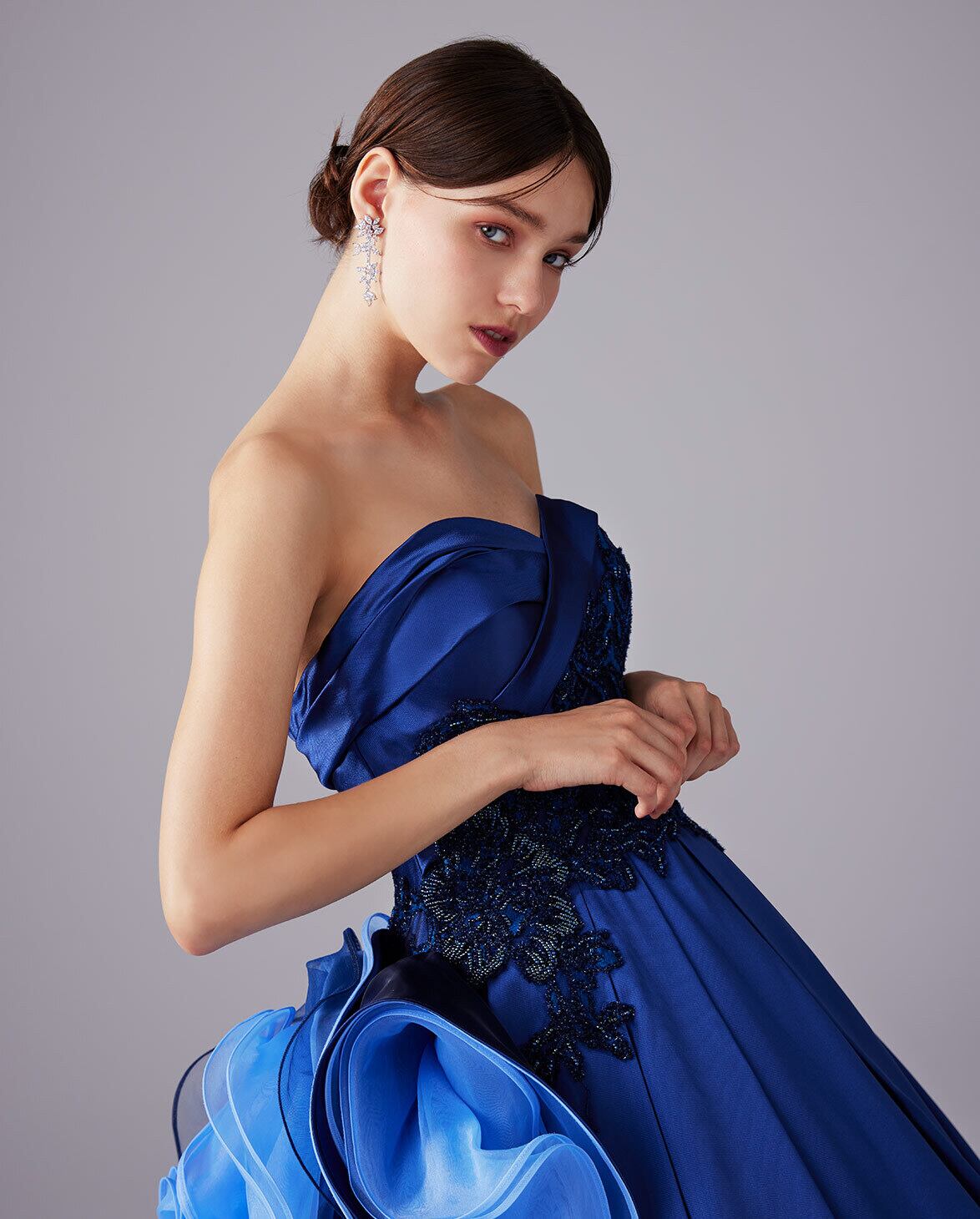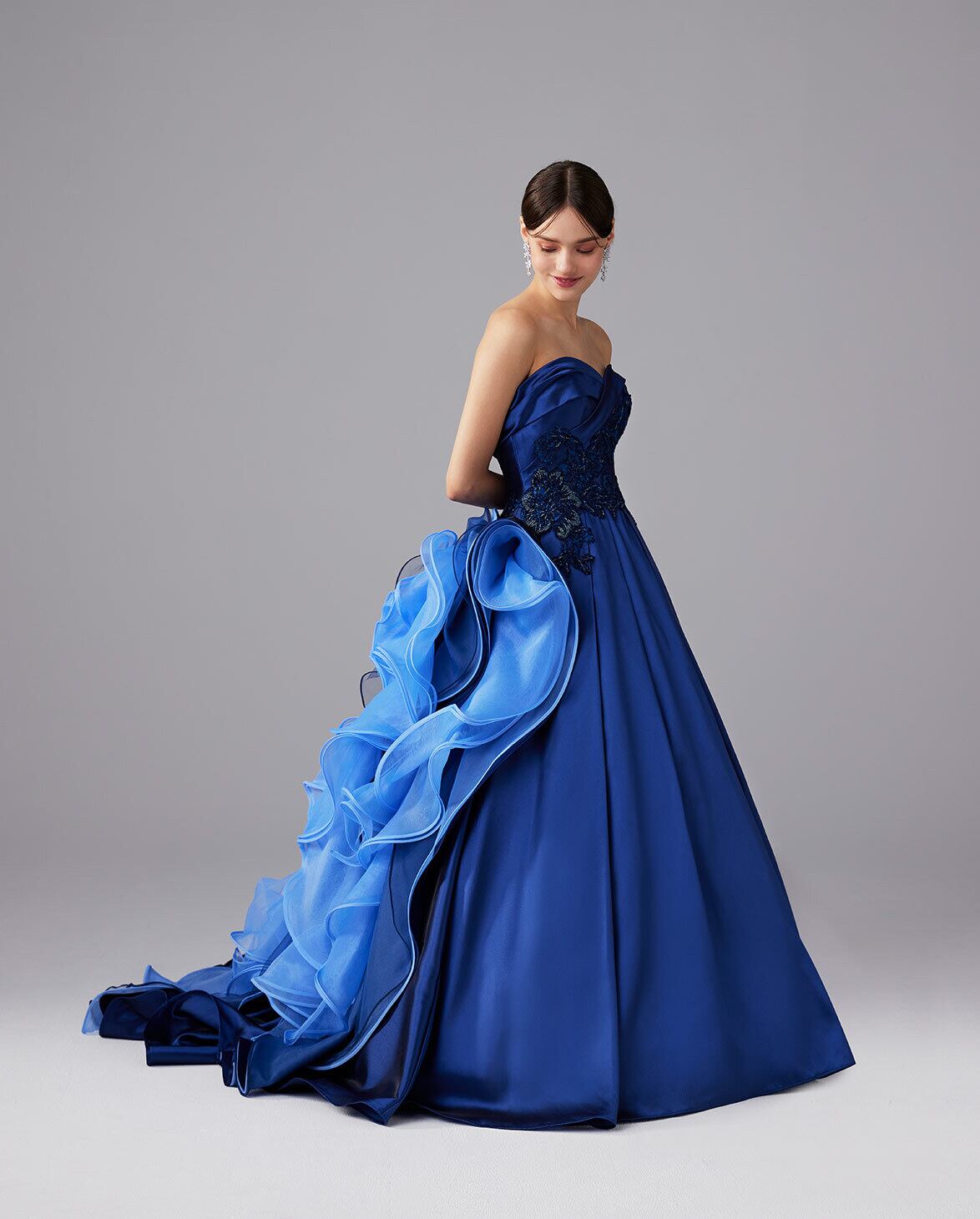美品!艶やかなネイビー カラードレス ドレープを寄せたベアトップ パーティードレス ラッフルフリルトレーン アシンメトリー デコラティブ 前撮り/イブニングドレス