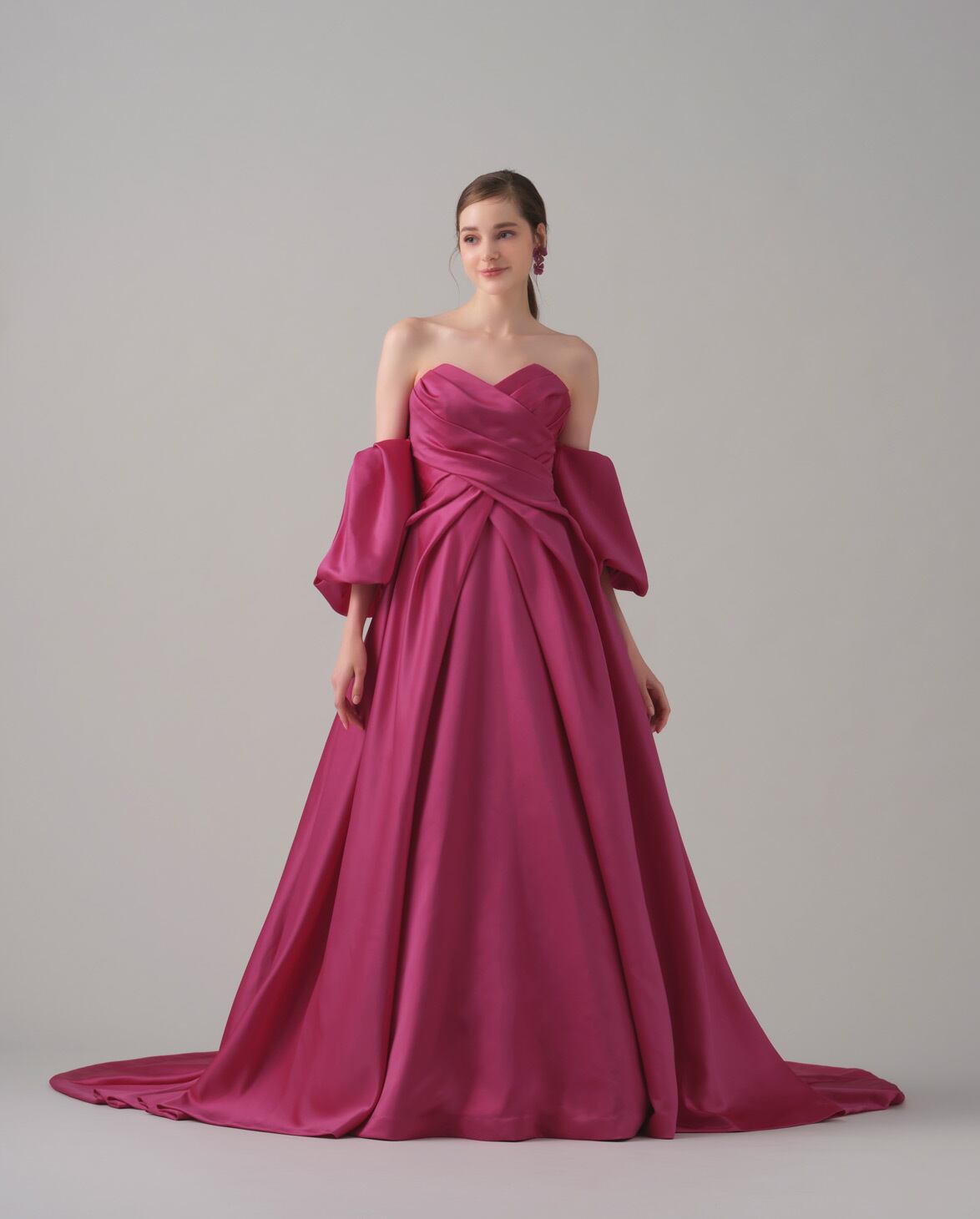美品!花びらのようなネックライン チェリーピンク カラードレス ドレープを寄せたベアトップ パーティードレス 柔らかなサテンドレス パフスリーブ 前撮り/イブニングドレス | David1021k Dress(ダヴィドレス)