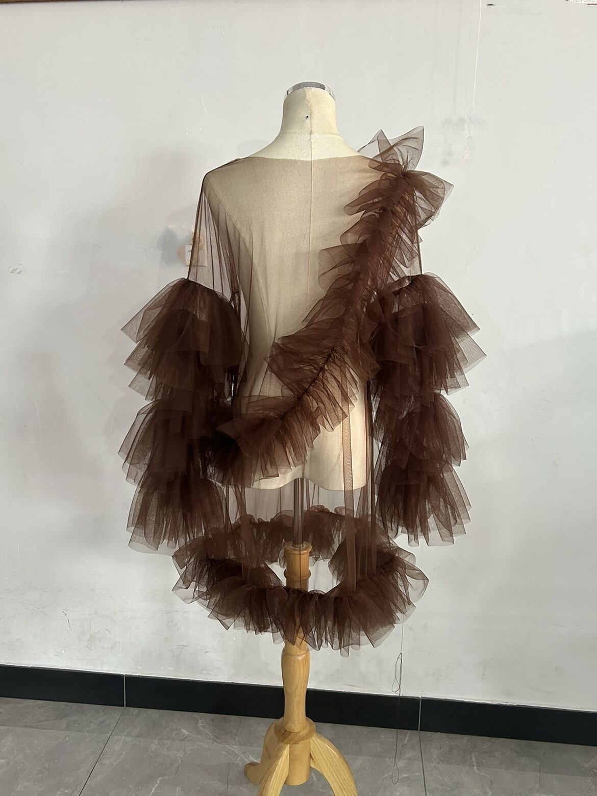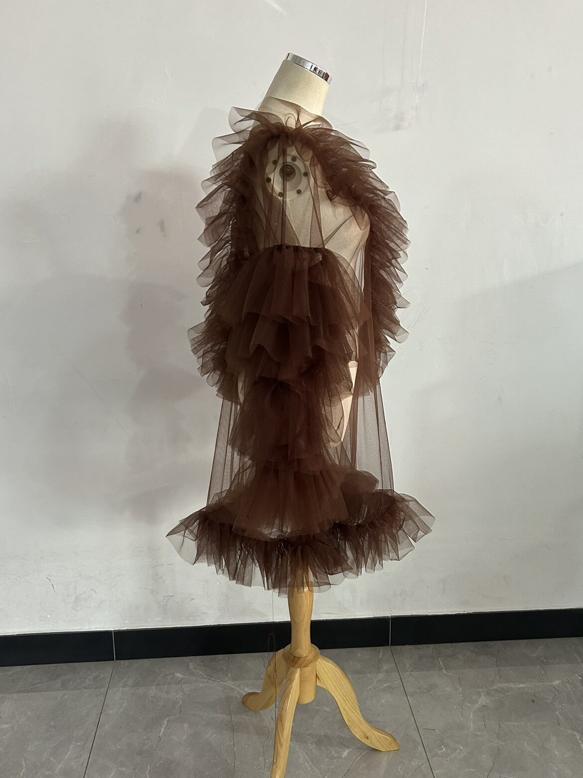 送料無料!コーヒーの色 抜群のおしゃれ見えカーディガン(ボレロ) ソフトチュール ラッフルフリルトップス 前撮り
