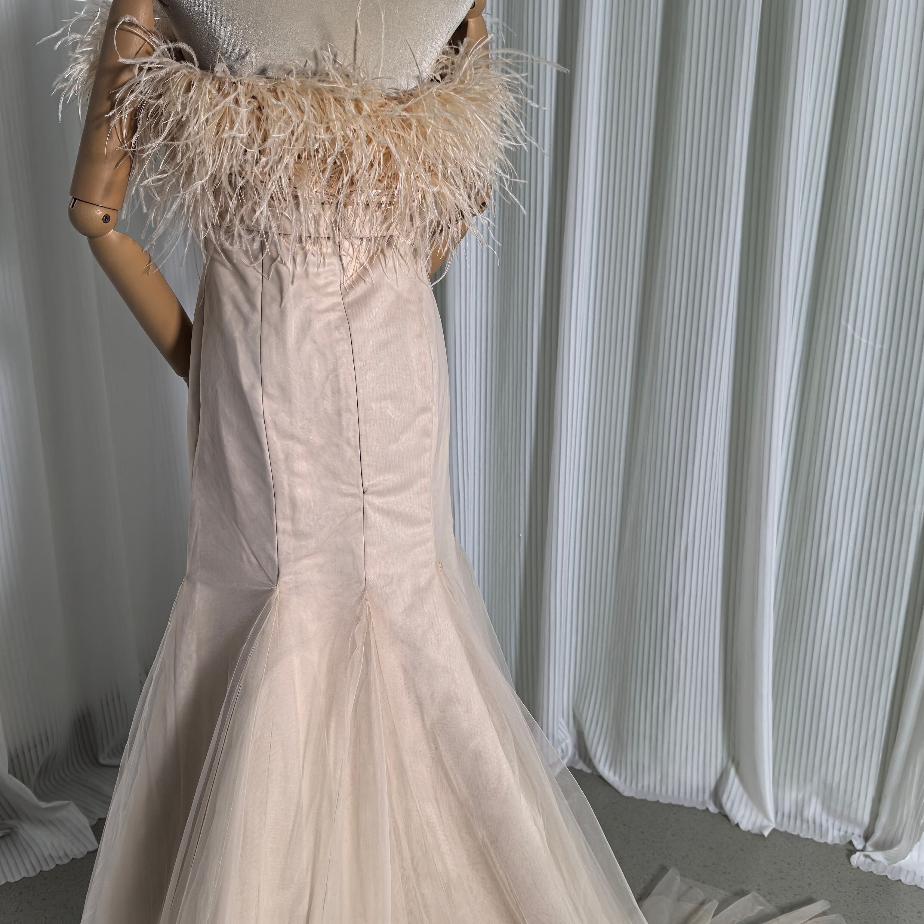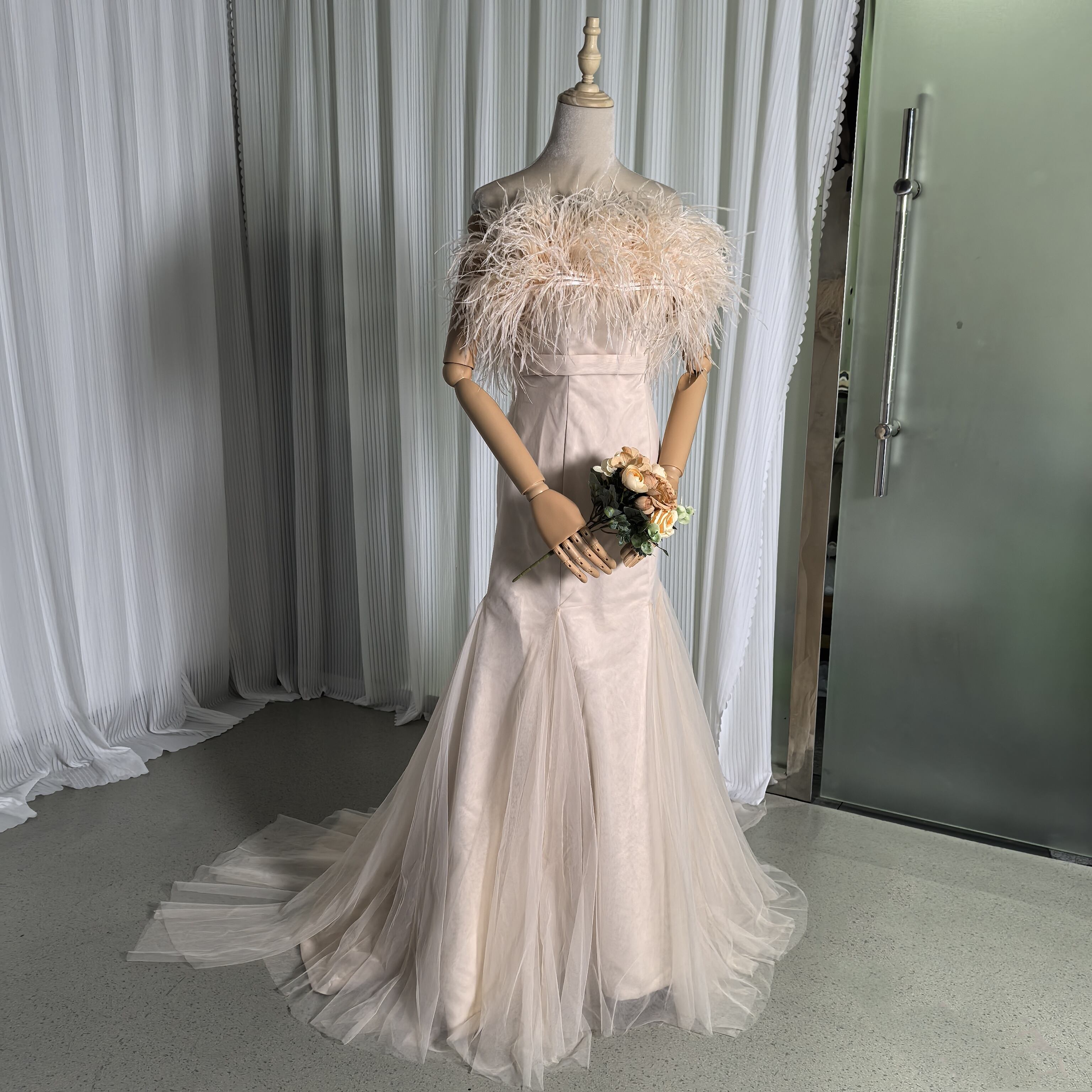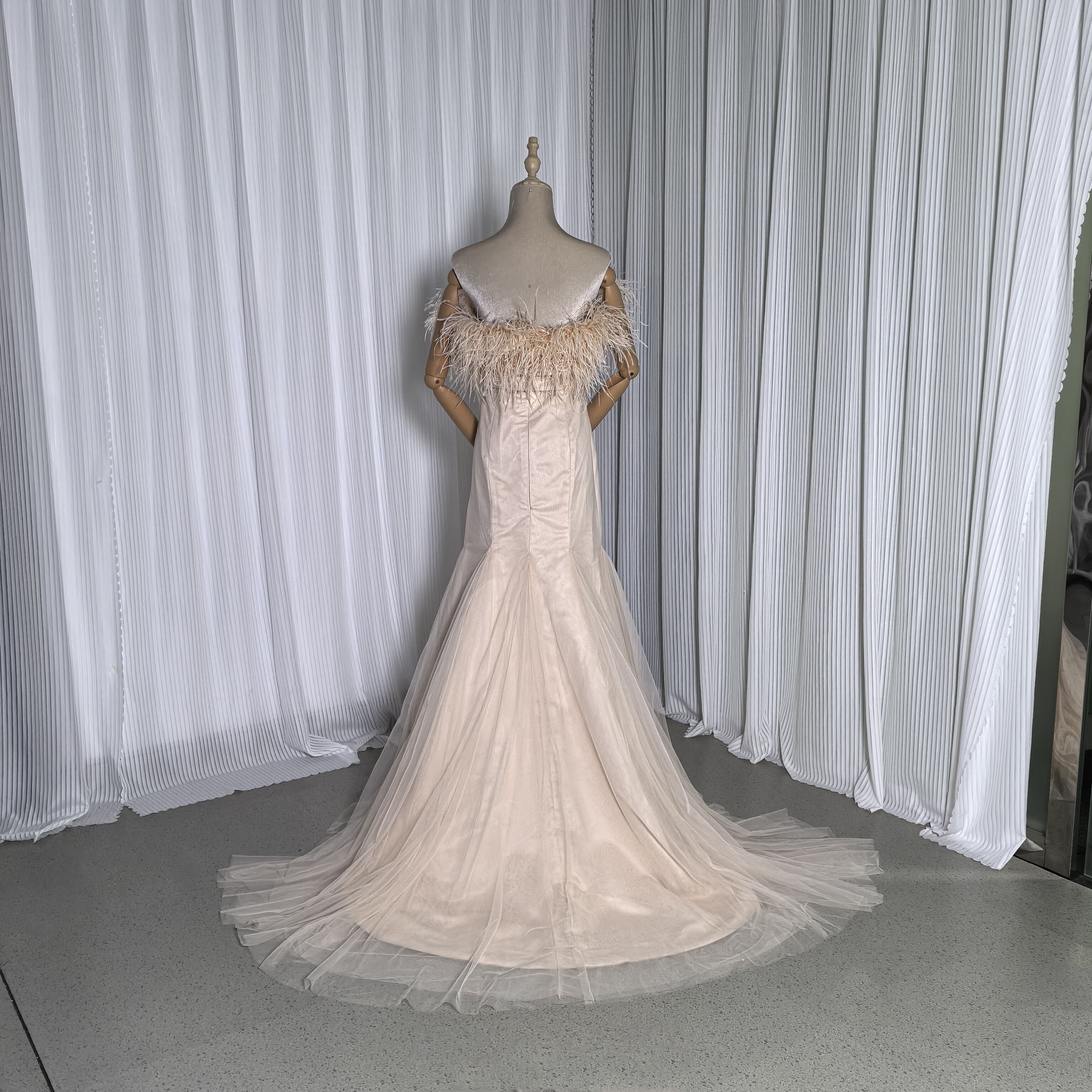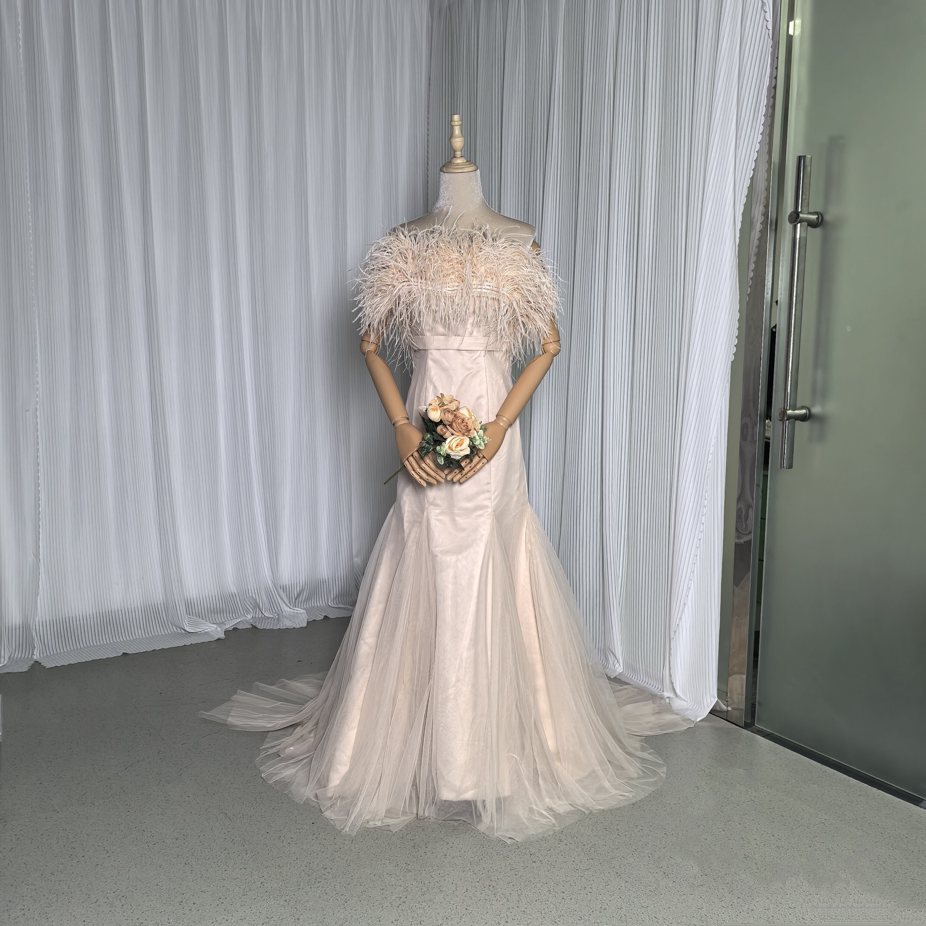 送料無料!薄ピンク カラードレス ファーフェザー オフショルダー ロングトレーン マーメイドパーティードレス 前撮り/花嫁